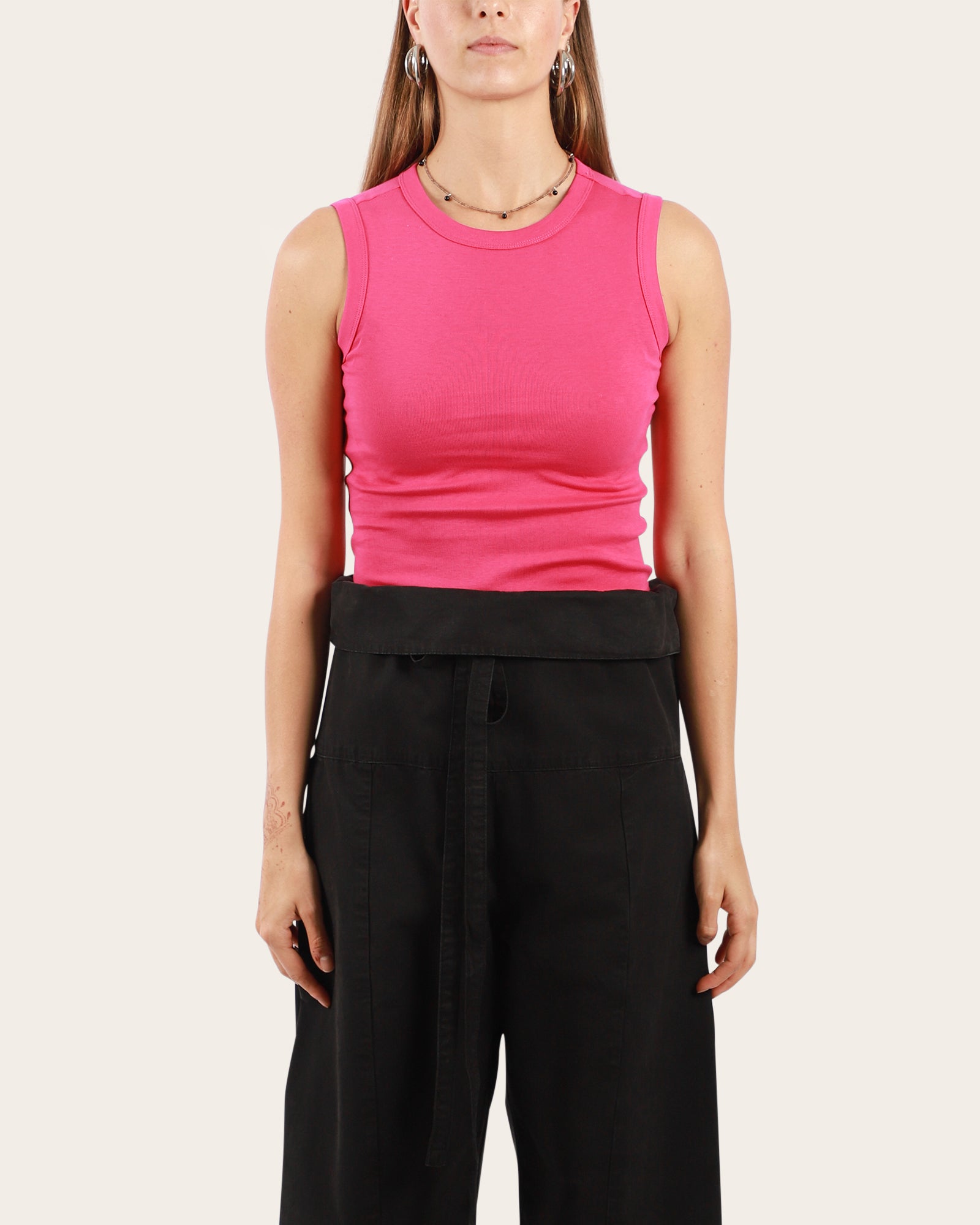 This fitted crew-neck tank features scooped armholes and a subtle cut-off back seam. Made from medium-weight organic cotton rib — effortless on its own or layered.