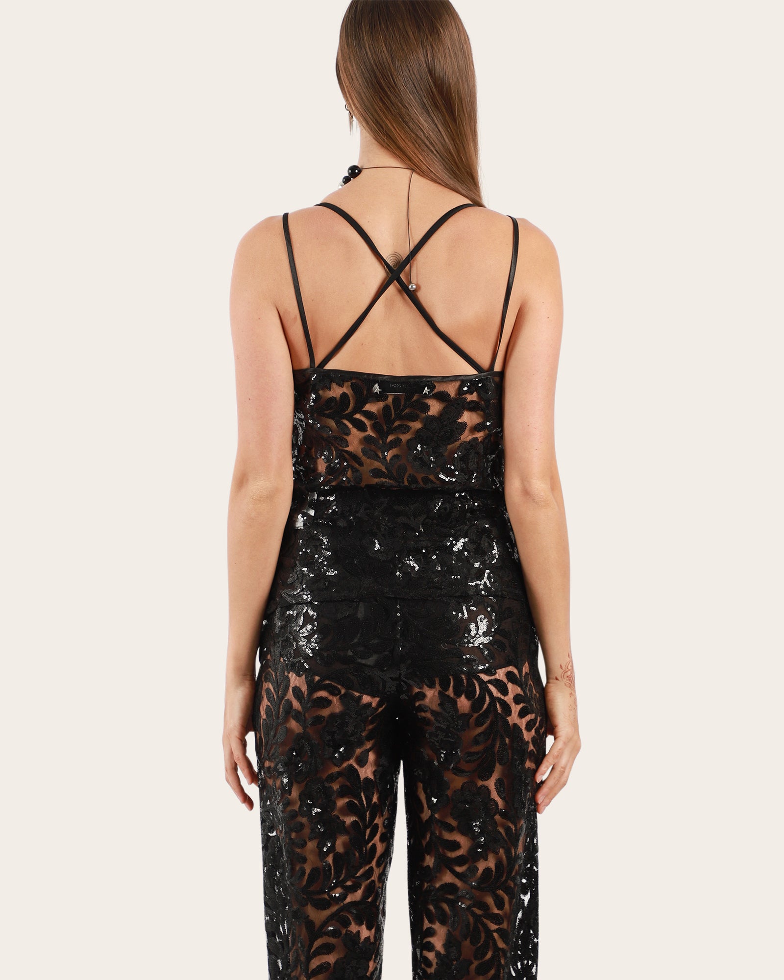 Part of Golden Goose Holiday Collection—where sleek tailoring meets soft textures—this top is made from black tulle with a black sequin floral motif. Designed with a slim fit, a V-neck, and contrasting thin straps, it’s finished with a crepe lining for an elegant sheer finish. Made in Italy.