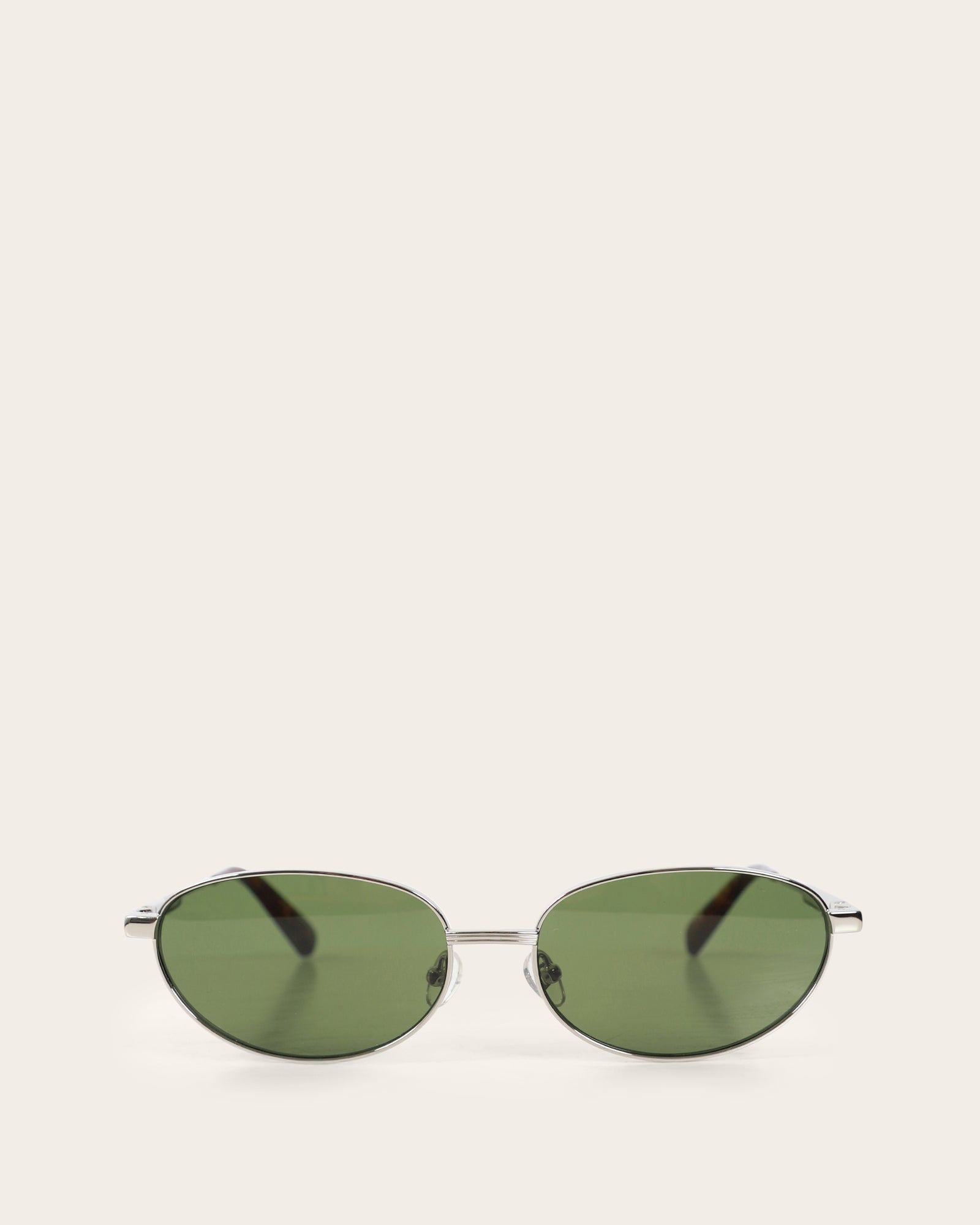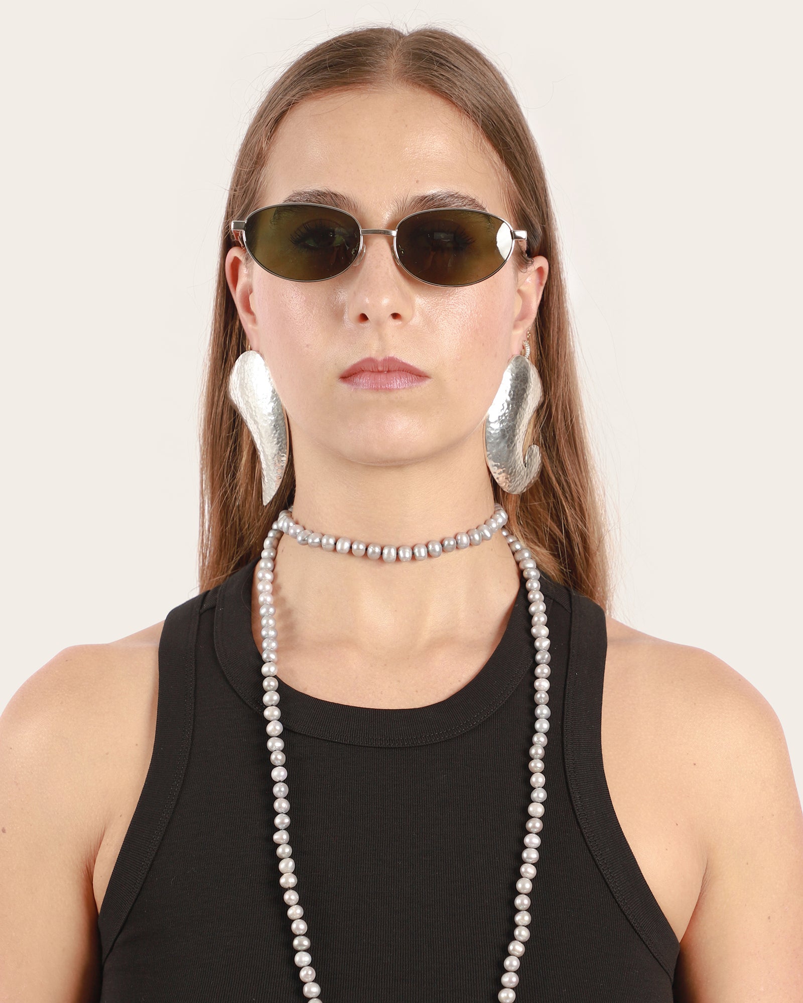 Oval aviator sunglasses crafted in sleek metal, featuring rounded frames and tinted lenses with UV 400 protection. Finished with adjustable nose pads, engraved logos on both the outer and inner temples, and tortoise-motif temple tips for a refined touch. Made in Japan.