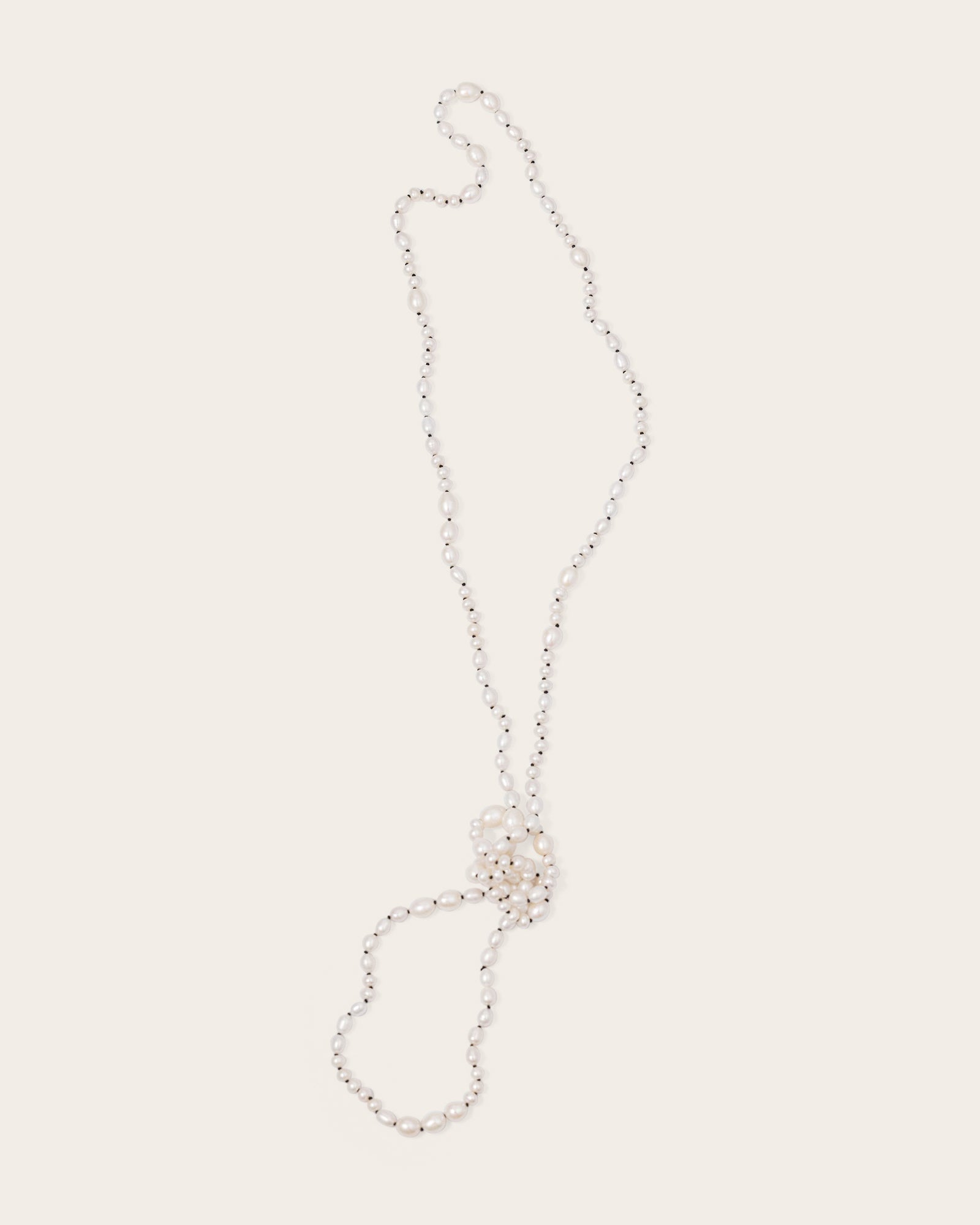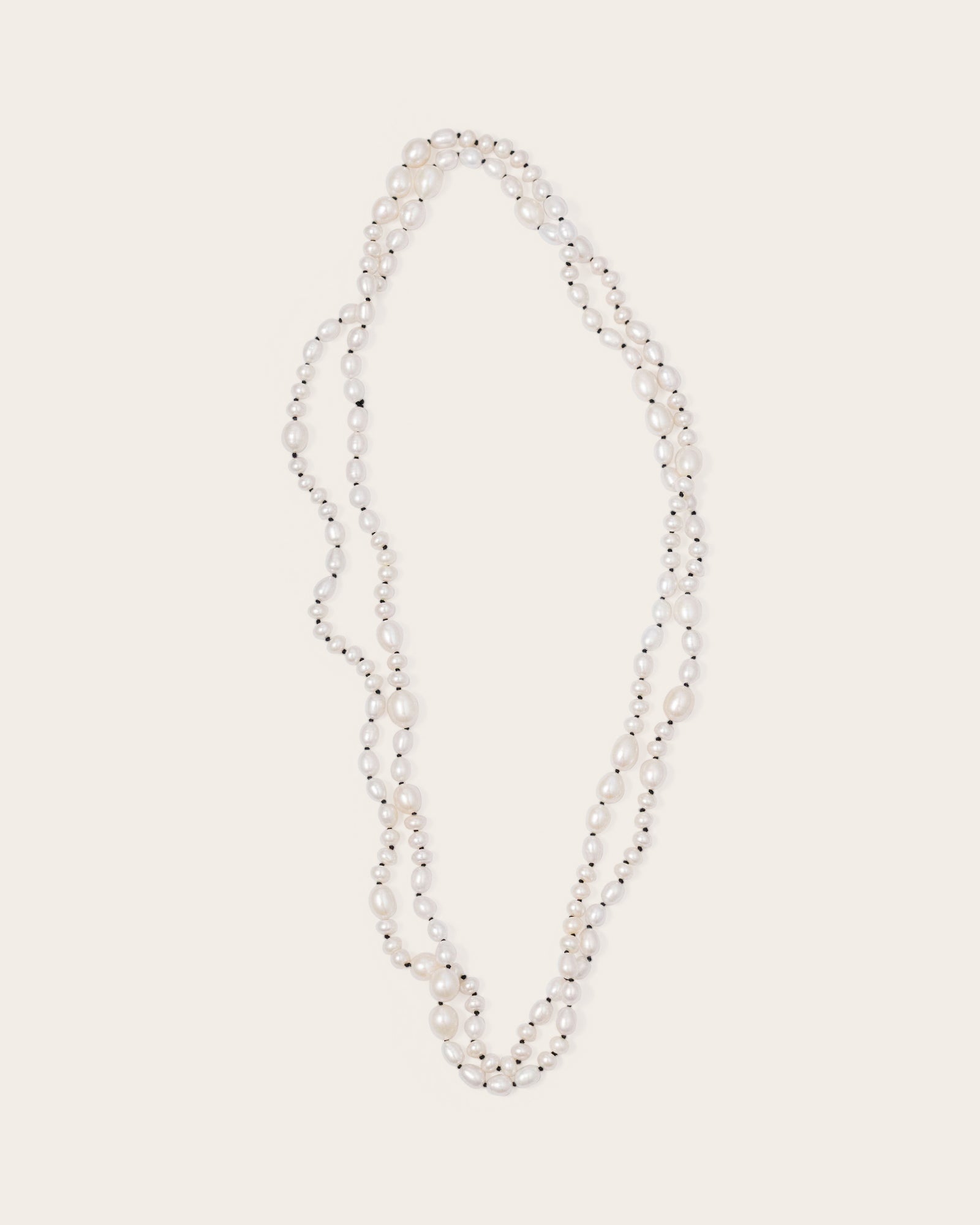 Irregular pearls are hand-threaded and knotted along contrasting black silk, creating a striking interplay of texture and tone. Measuring 1.2 metres, the necklace offers versatile styling: wear it doubled around the neck, draped across the body like a sea-worn sash, or wrapped as a belt to bring luminous detail to layered looks.