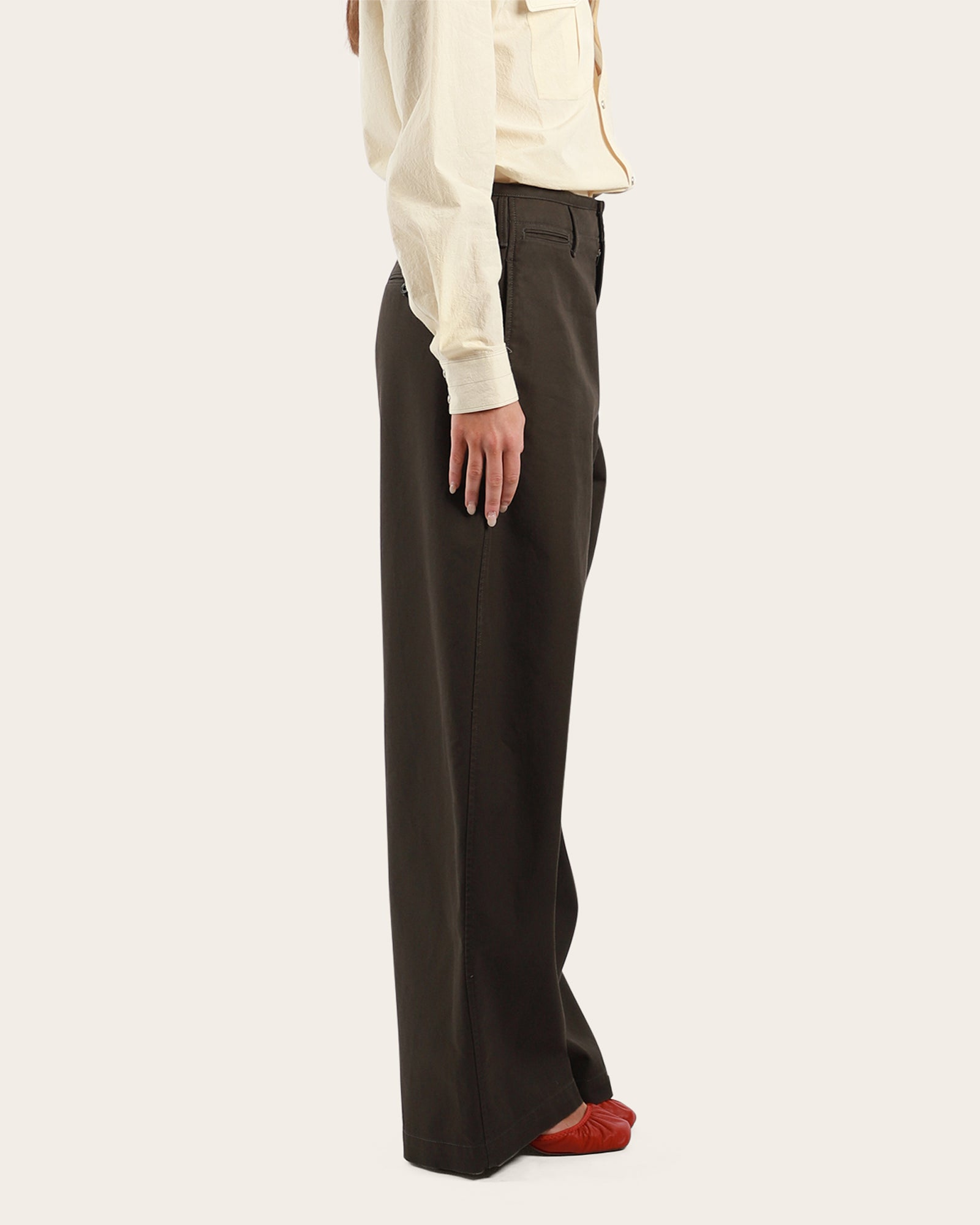 An oversized pant, featuring comfort and elegance, multiple pockets, wide leg silhouette, heavy cotton twill fabric.