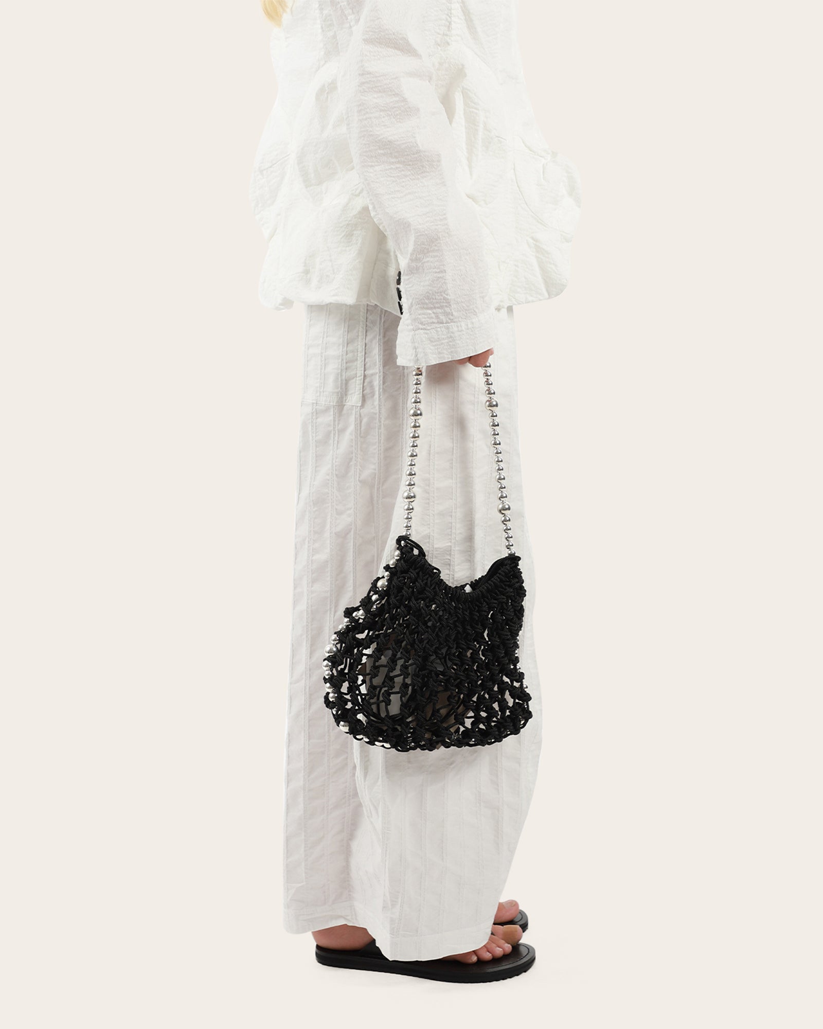 Designed by Niccolò Pasqualetti, this structured mini bag effortlessly blends minimalist design with refined functionality. Featuring a sleek, architectural silhouette, it includes a practical top handle with little silver tone beads in different sizes attached together, draped strap detailing on each side, main compartment, with a woven design. Perfect from day to evening, this sophisticated piece adds a touch of effortless polish to any outfit. Handmade in Italy.