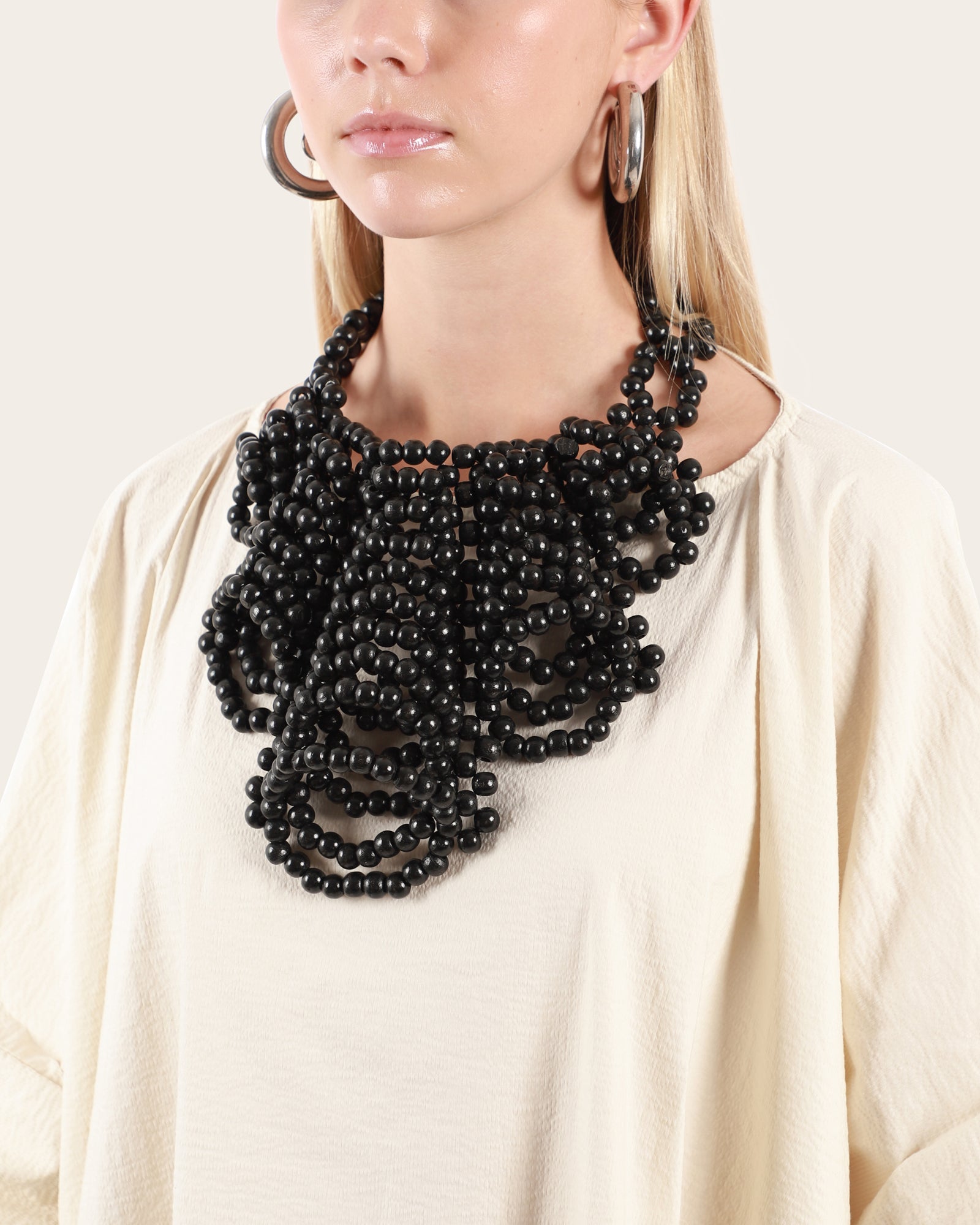 A beautiful and voluminous hand beaded necklace, entirely made of wooden beads, featuring silver tone hardware and back hook closure. Handmade in Italy.