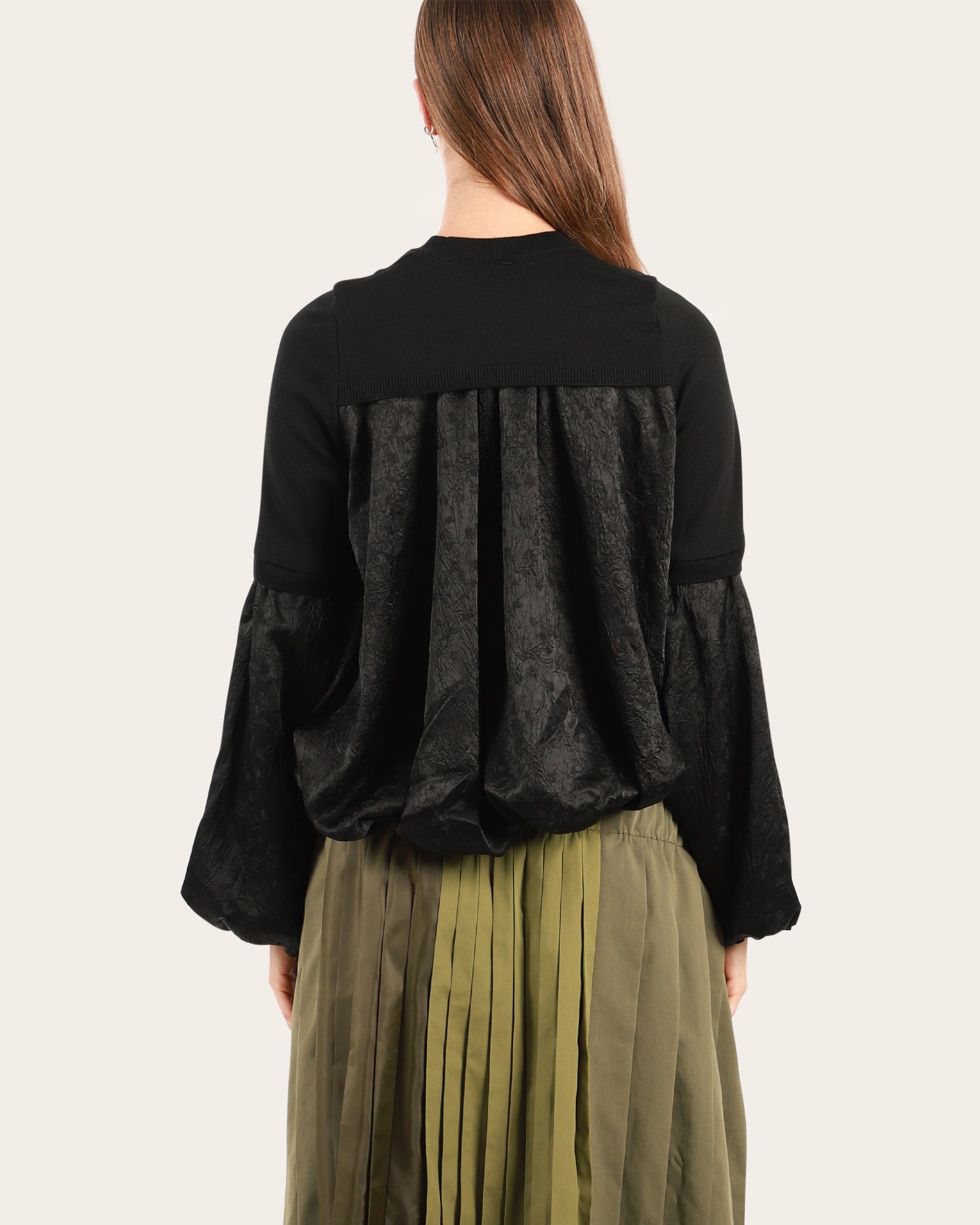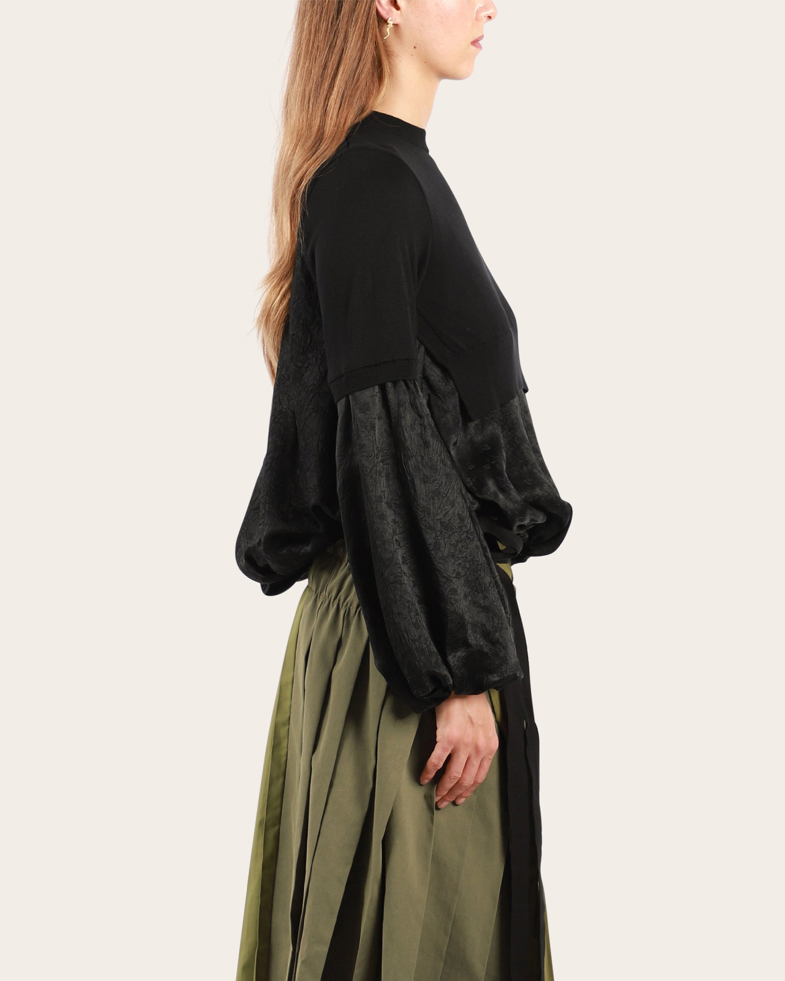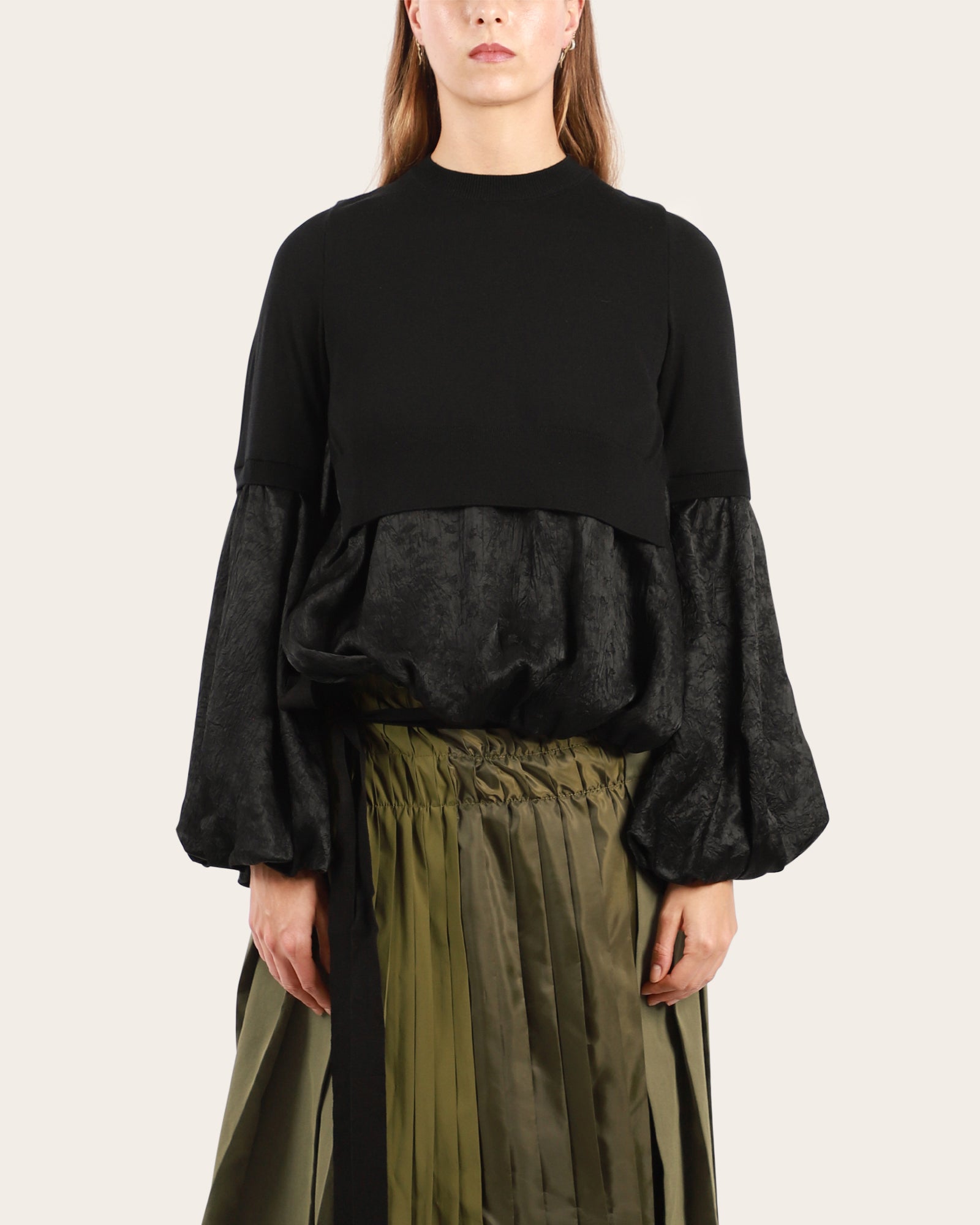 A beautiful round neckline jumper, featuring a contrast layering of different fabrics, long voluminous sleeves, elasticated at cuff and hem. Made in Japan.