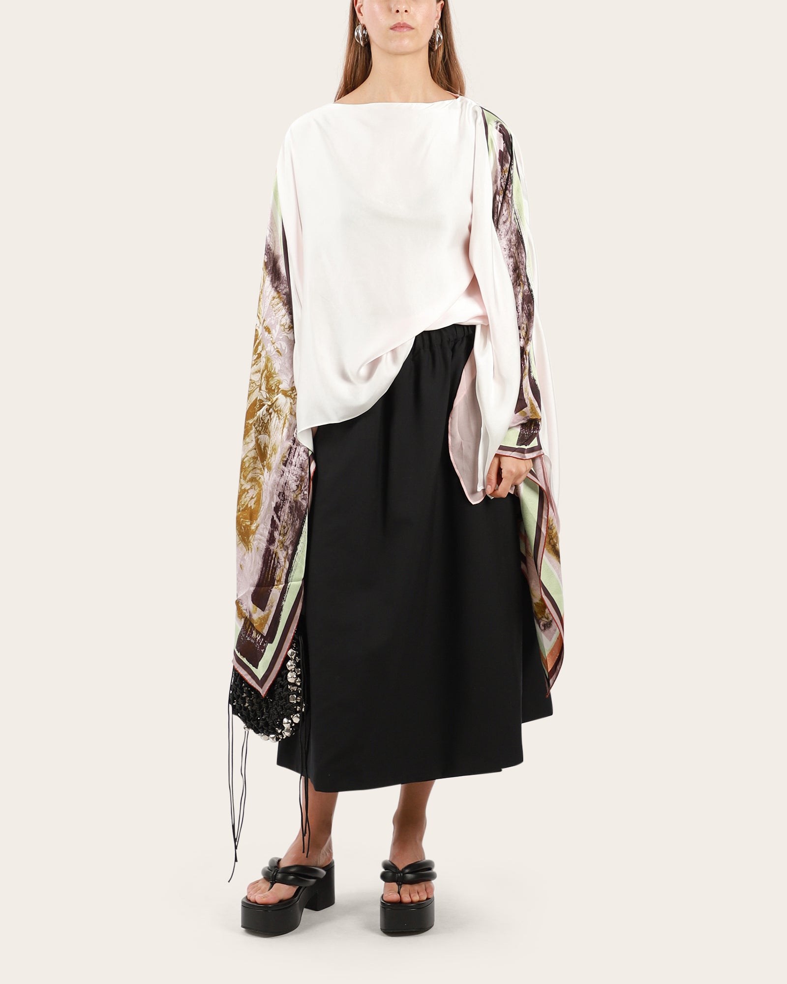 • A beautifully made top, offering voluminous silhouette and features a boat neckline, extra long asymmetrical sleeves, it has different silk layers, abstract pattern on the sleeves.