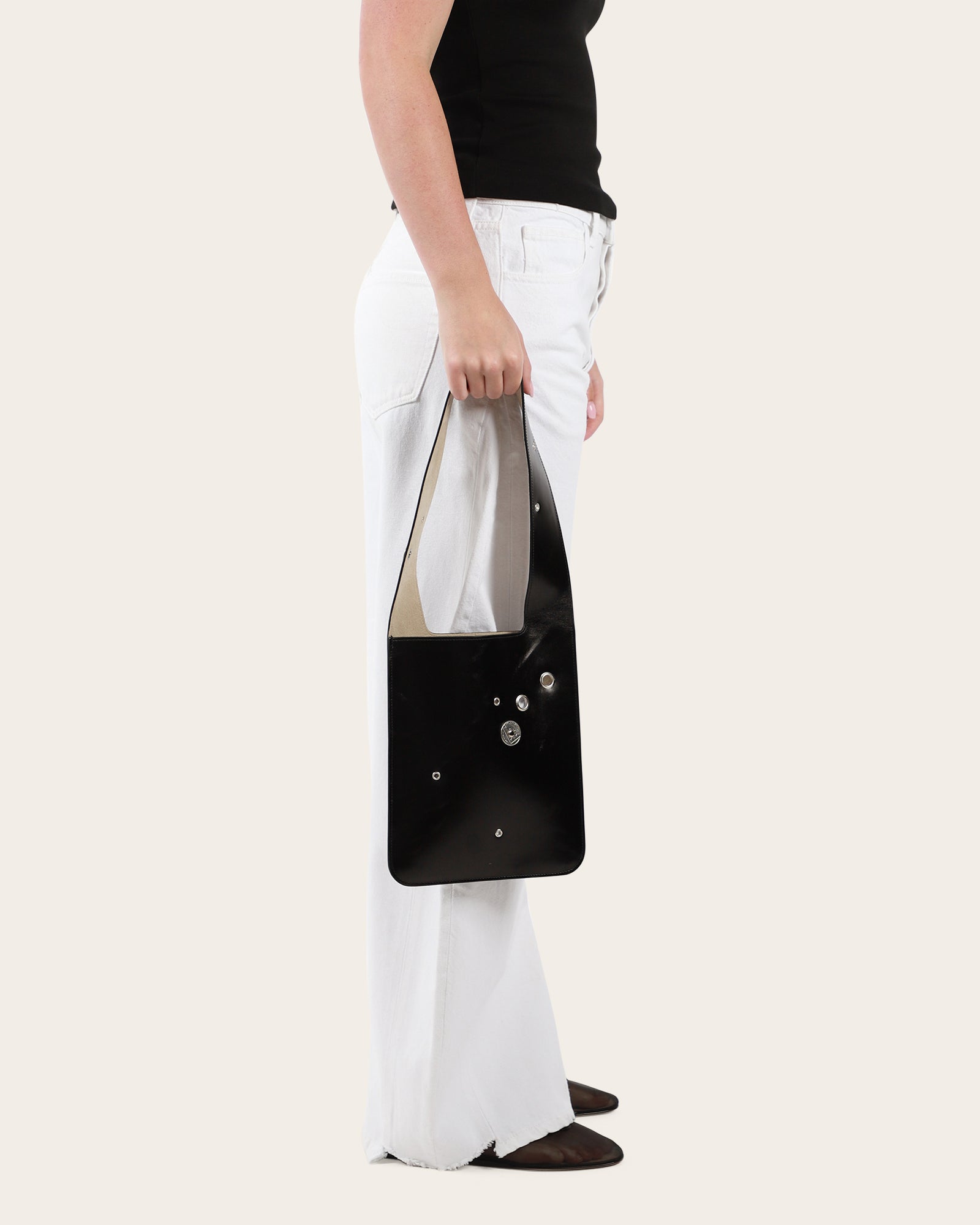 A unique shoulder bag, featuring a shiny worn calf leather finish, bonded suede lining, 2 riveted sterling coins, unfastened opening. Hand made in the UK.