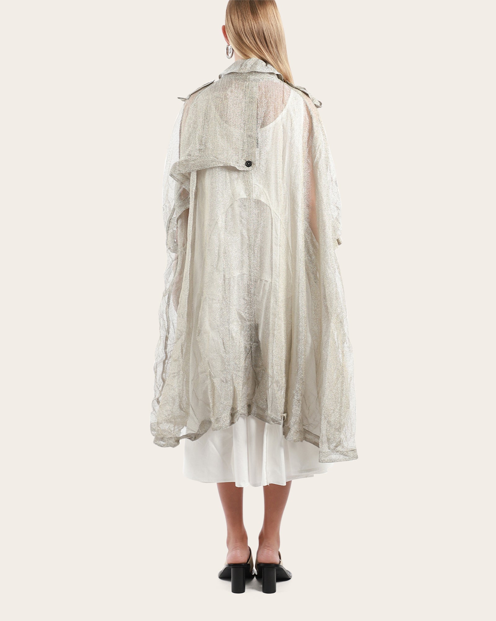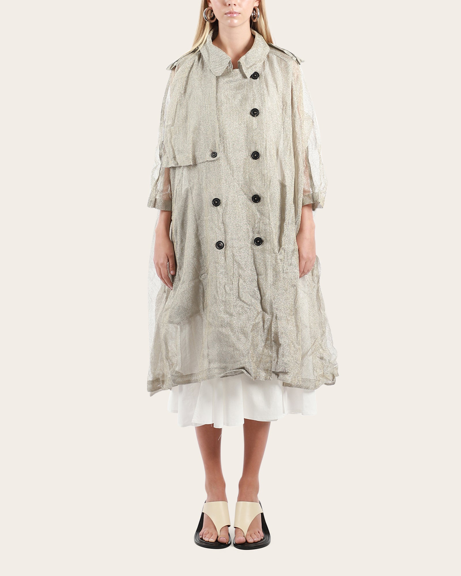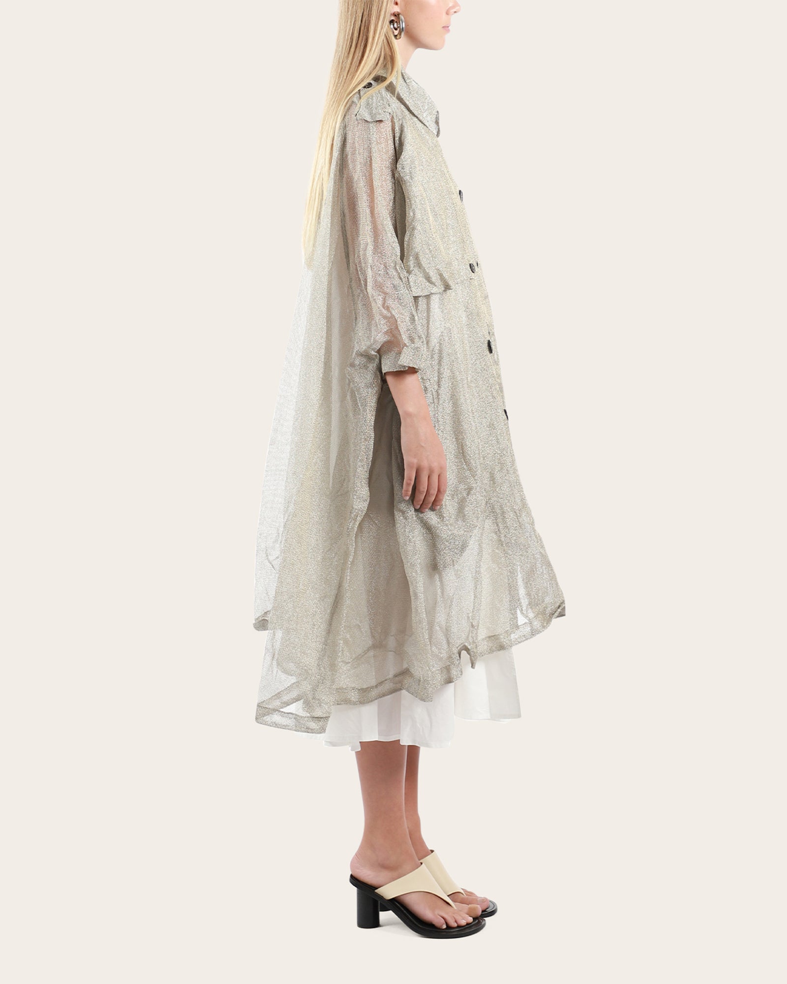 A unique lightweight coat, featuring a classic collar, 3/4 sleeve length, buttons at front to close, sheer fabric, versatile.