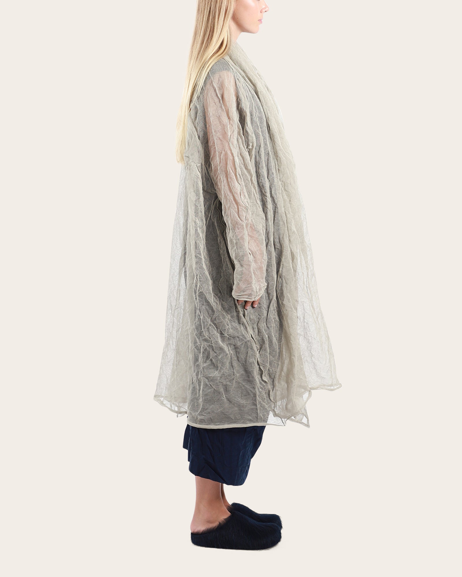 A unique coat, featuring a sheer look, long sleeves, oversized silhouette, no buttons and a relaxed fit.