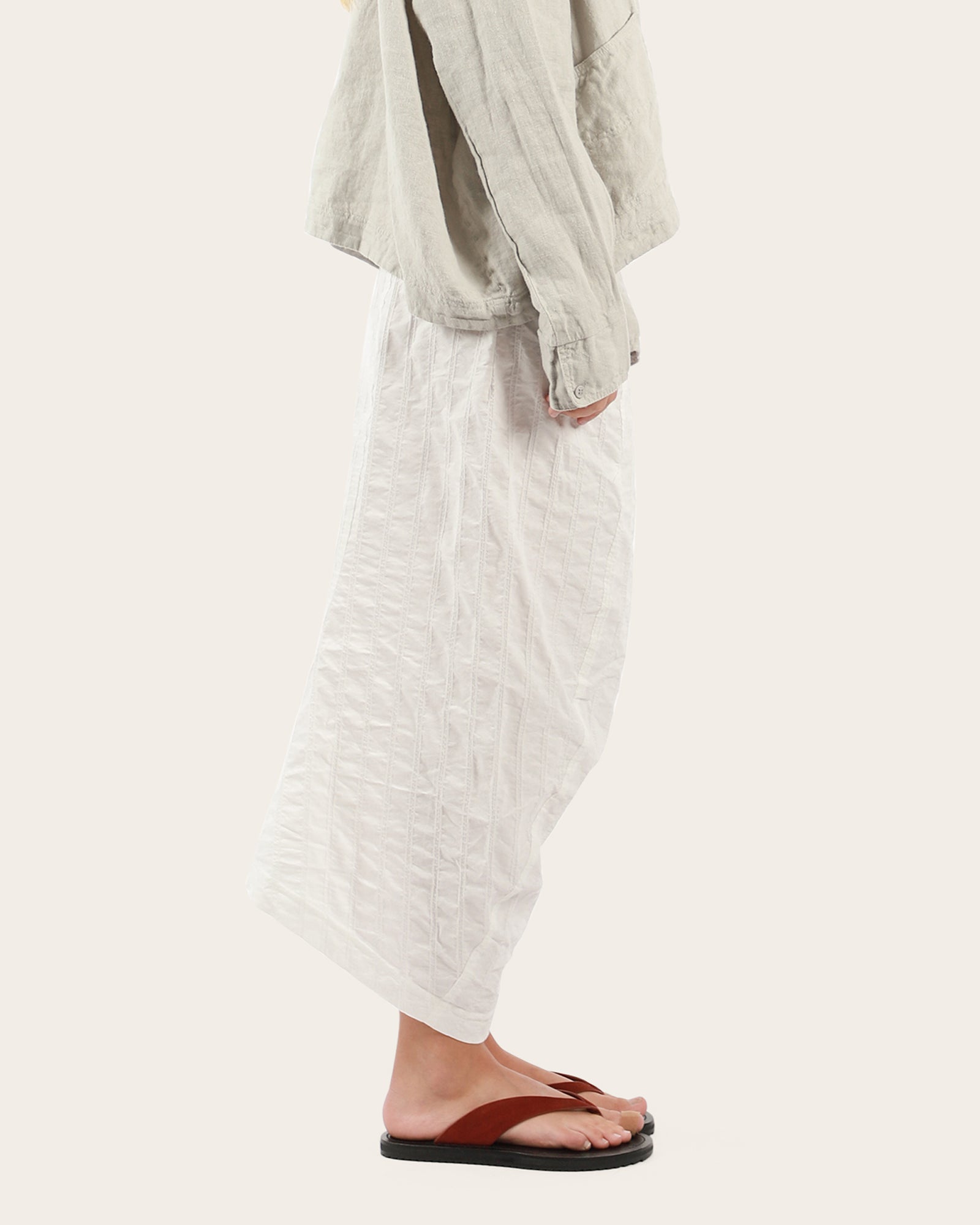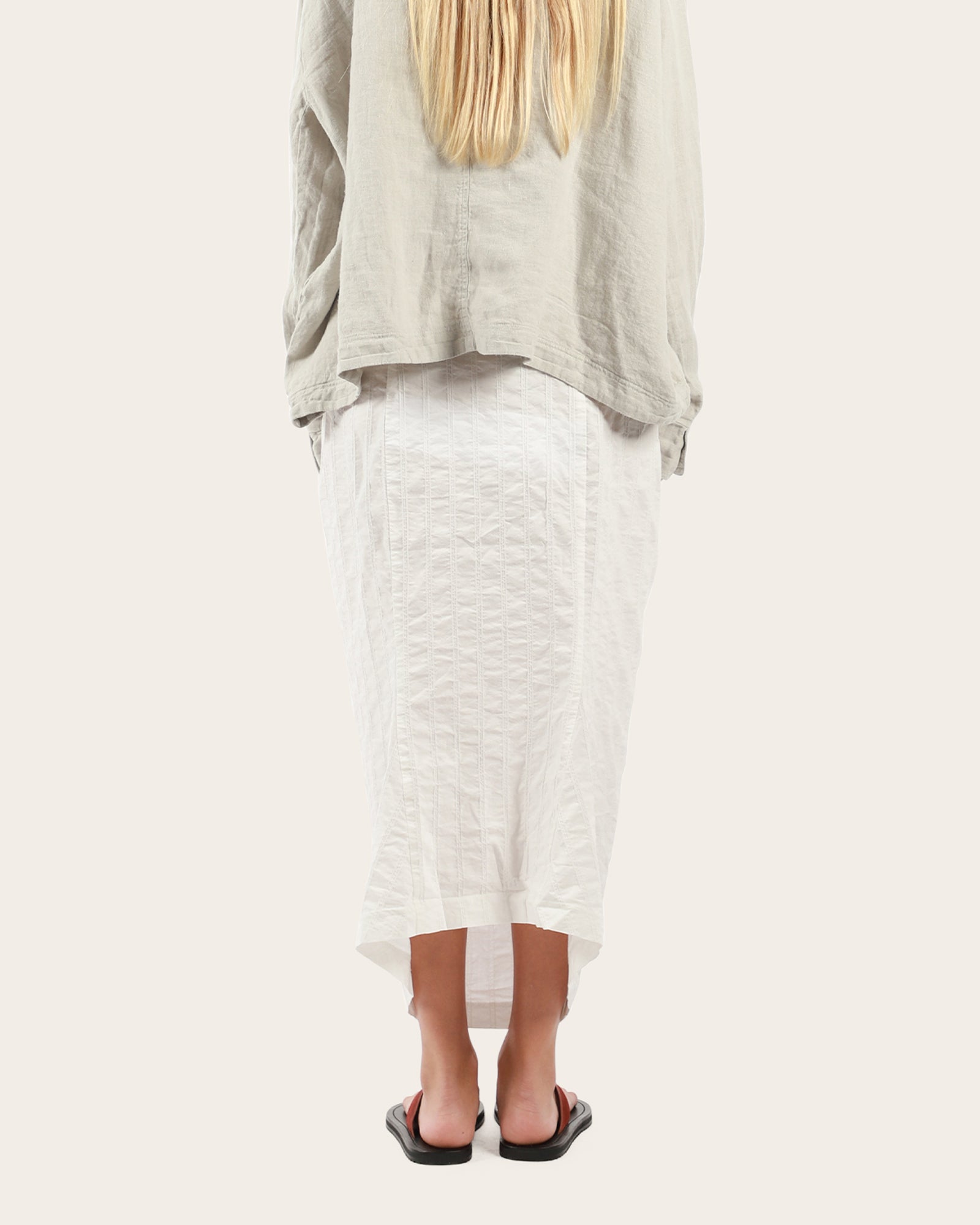 A tapered skirt, featuring stripe details all over, midi length, slightly longer at front, side pockets.