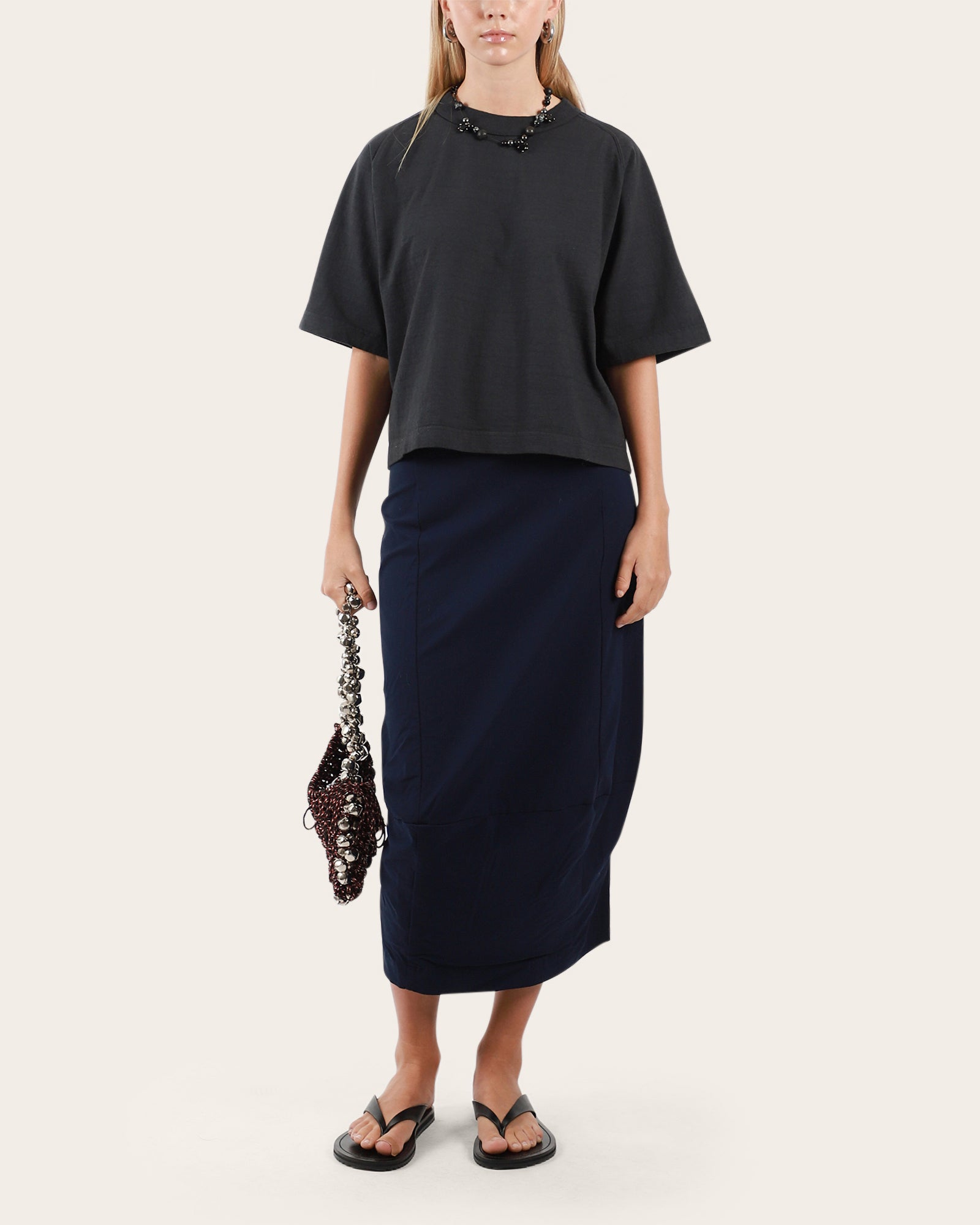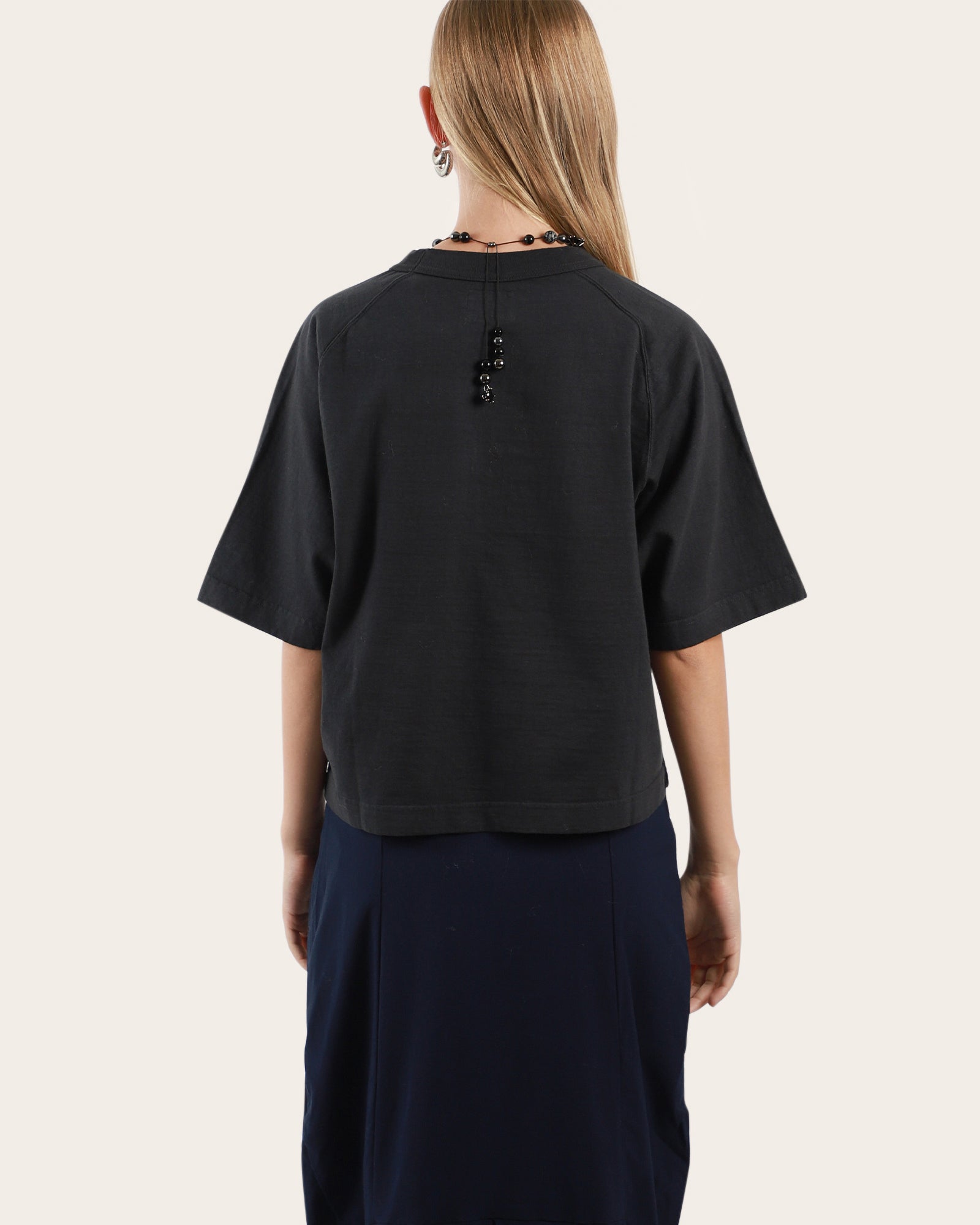 • Elevate your basics with the Mahuna Short Sleeve T-Shirt, crafted from heavyweight Japanese Ochiwata recycled cotton for a soft, durable feel. Featuring oversized short sleeves, a cropped boxy silhouette, and subtle side slits at the hem, this sporty-inspired tee is a versatile wardrobe staple.