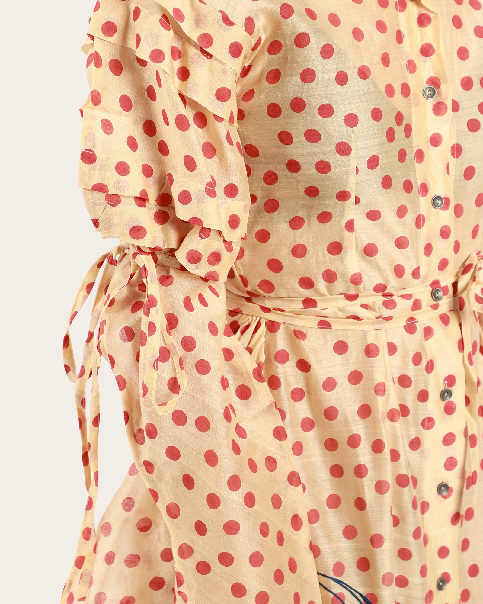 • Crafted from finely hand-woven silk chanderi, this piece features a tea-stain base accented with red hand block–printed dots. A pair of hand-embroidered twin tigers, stitched in blue cotton thread, adds a distinctive artisanal detail to one side of the dress. Handmade in India.