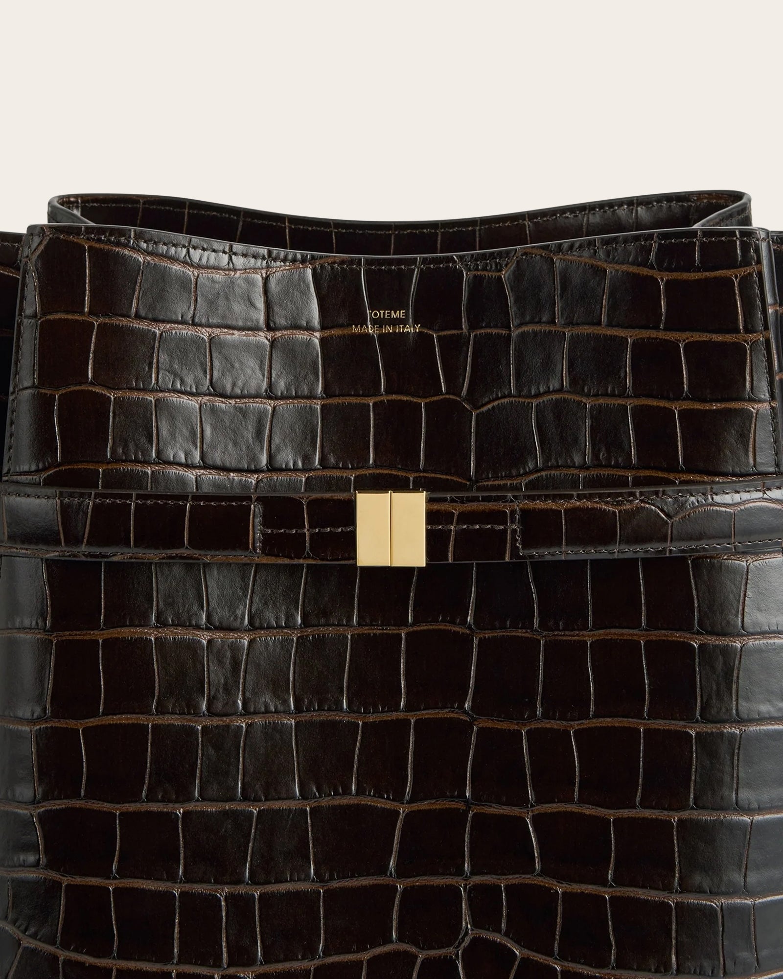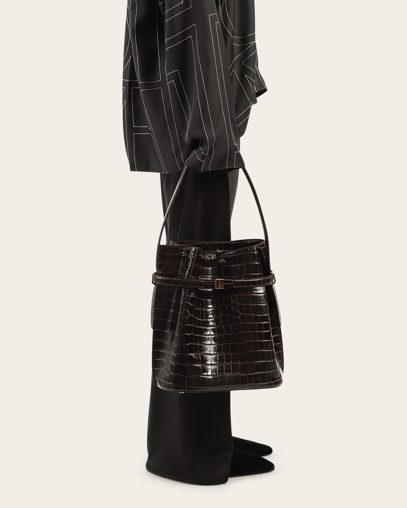 The Belted Buckle Bag is crafted in Italy from croco-embossed leather with gold-tone hardware. Its adjustable belt lets you cinch the bucket silhouette or leave it open for extra space, while two internal slip pockets keep essentials organized. Wear it effortlessly by the shoulder strap.