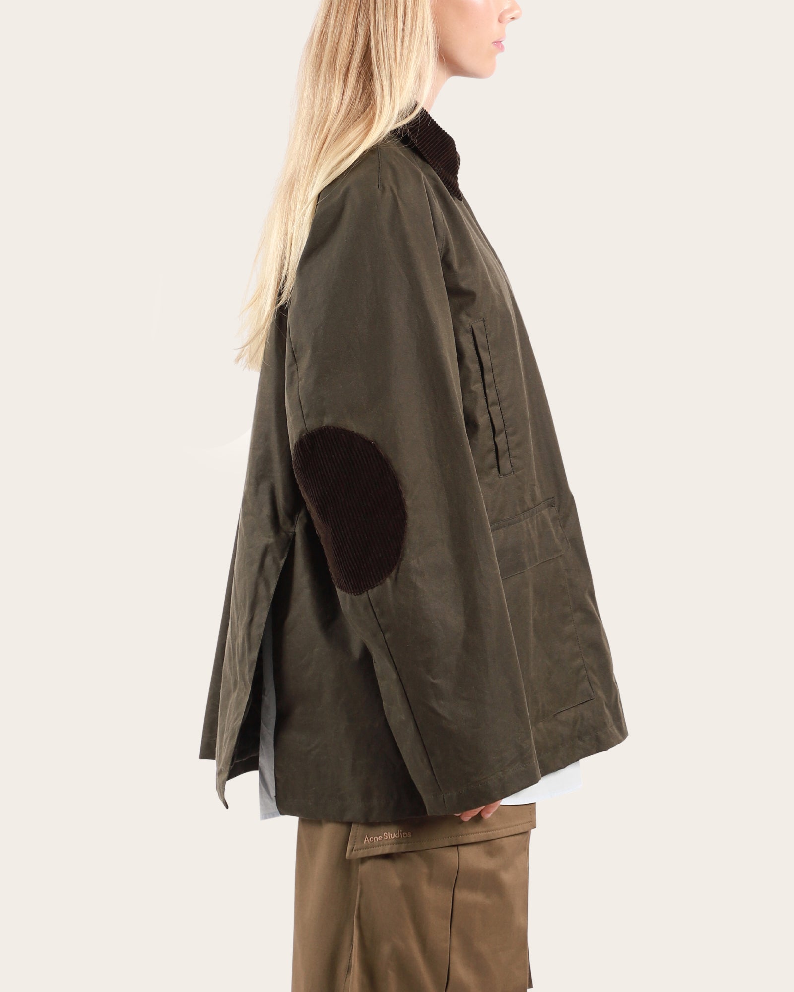 • An oversized jacket crafted from waxed cotton sourced from renowned British weavers and dyed in deep forest green. Designed with a spacious A-line silhouette, it features a brown corduroy collar, elbow patches, a zip and press-stud closure, multiple front pockets, and two back vents. Wear it in its intended oversized fit or size down for a closer silhouette.
