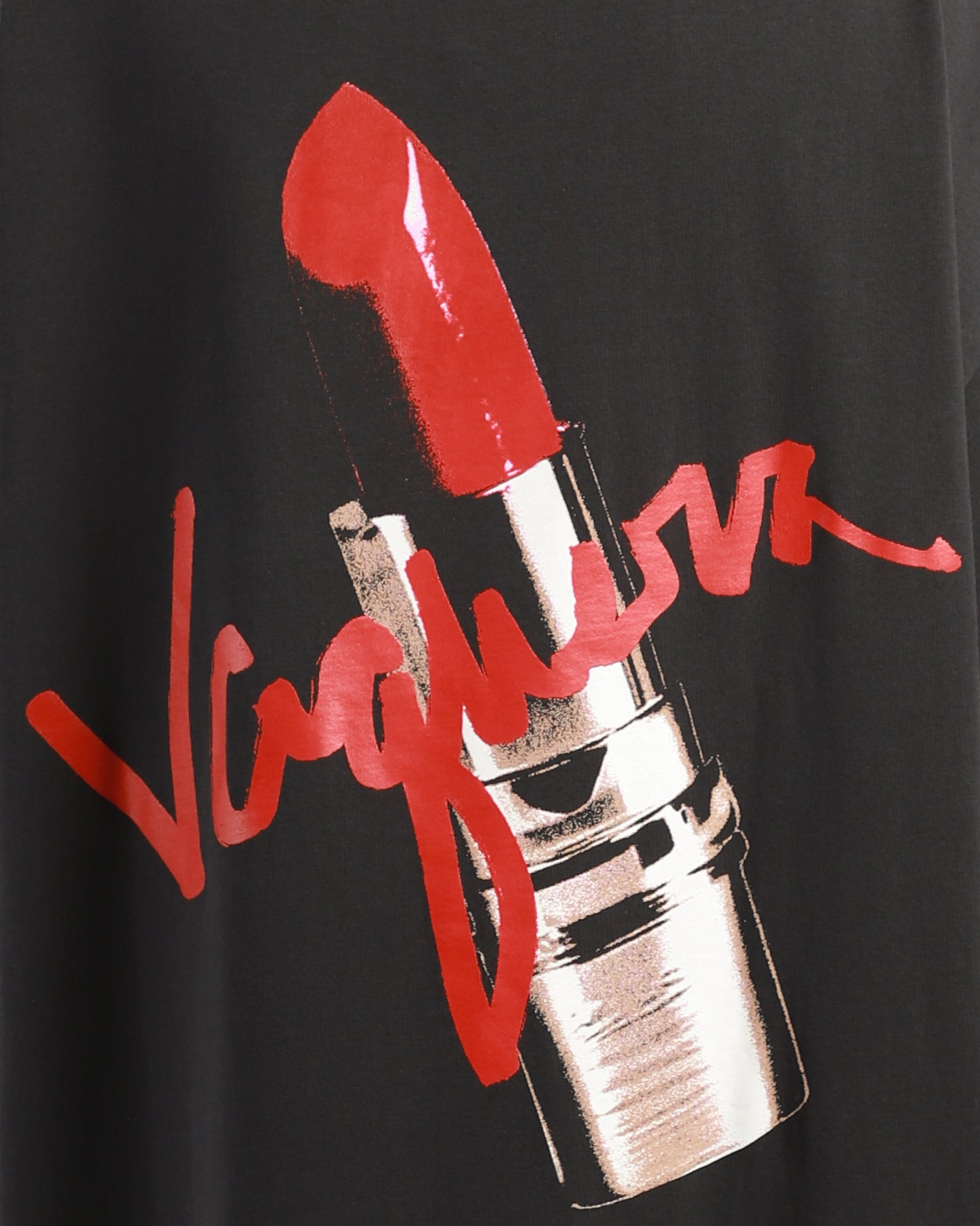 This mid-calf length dress features a relaxed, oversized T-shirt silhouette with a crew neckline, dropped shoulders, and elbow length sleeves. A bold red lipstick graphic with script overlay makes a statement on the back, while a contrast lower panel with black lace trim adds an edgy finish.