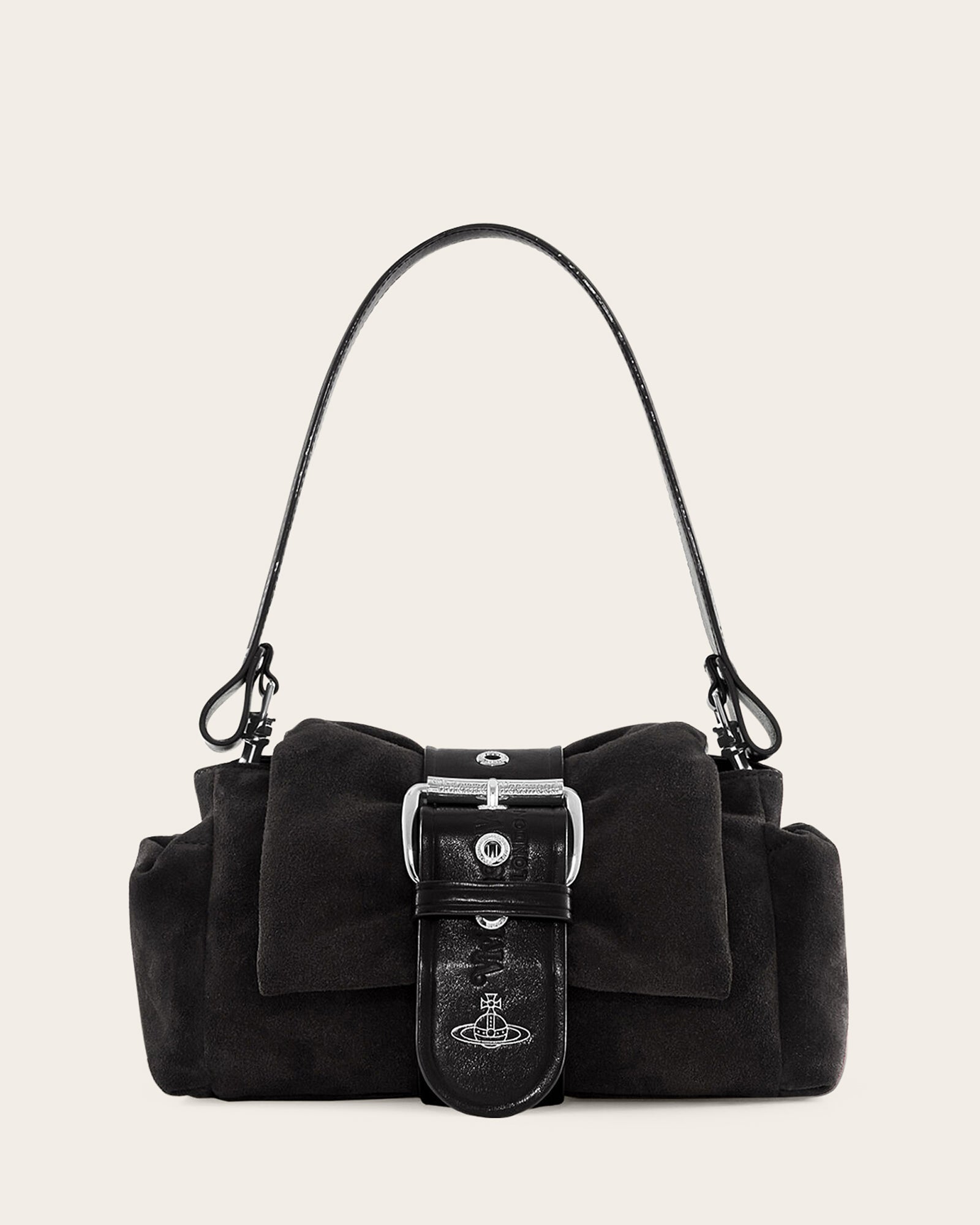 The Hazel Treasure handbag is reimagined in supple suede leather, featuring the house’s iconic archival punk pockets on each side. A sculptural belt strap wraps around the softly structured silhouette, subtly embossed with the signature Orb motif for a distinctive finish.