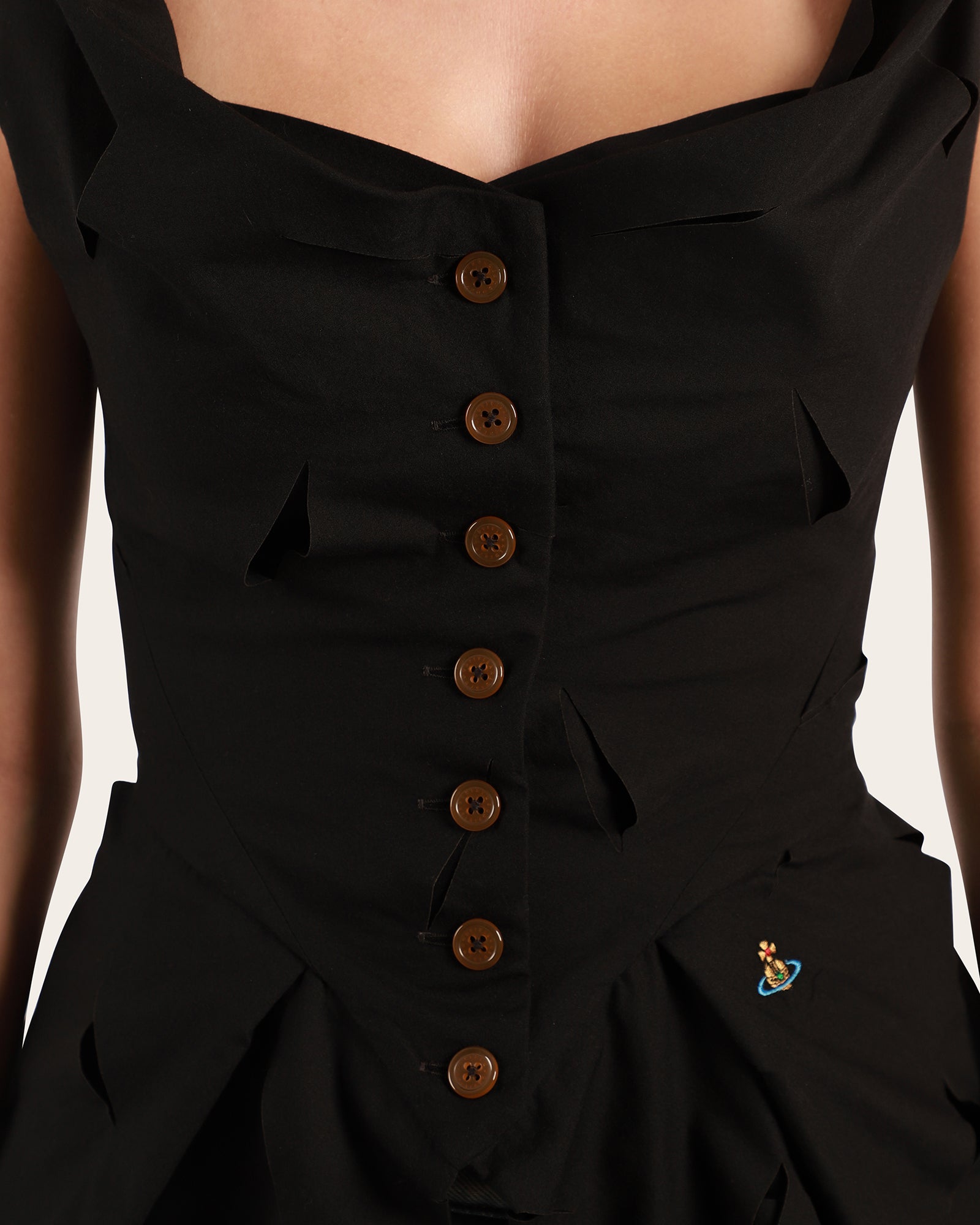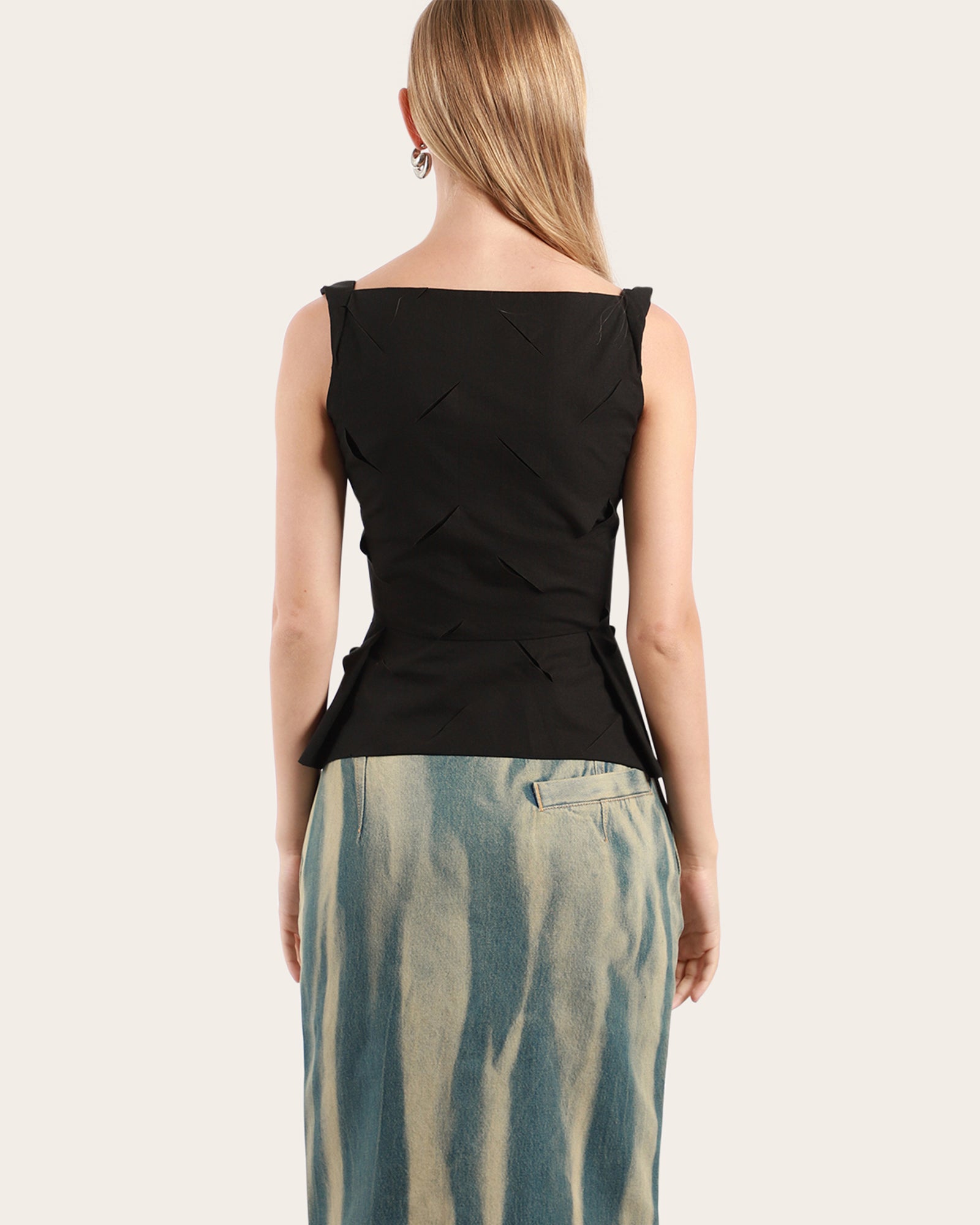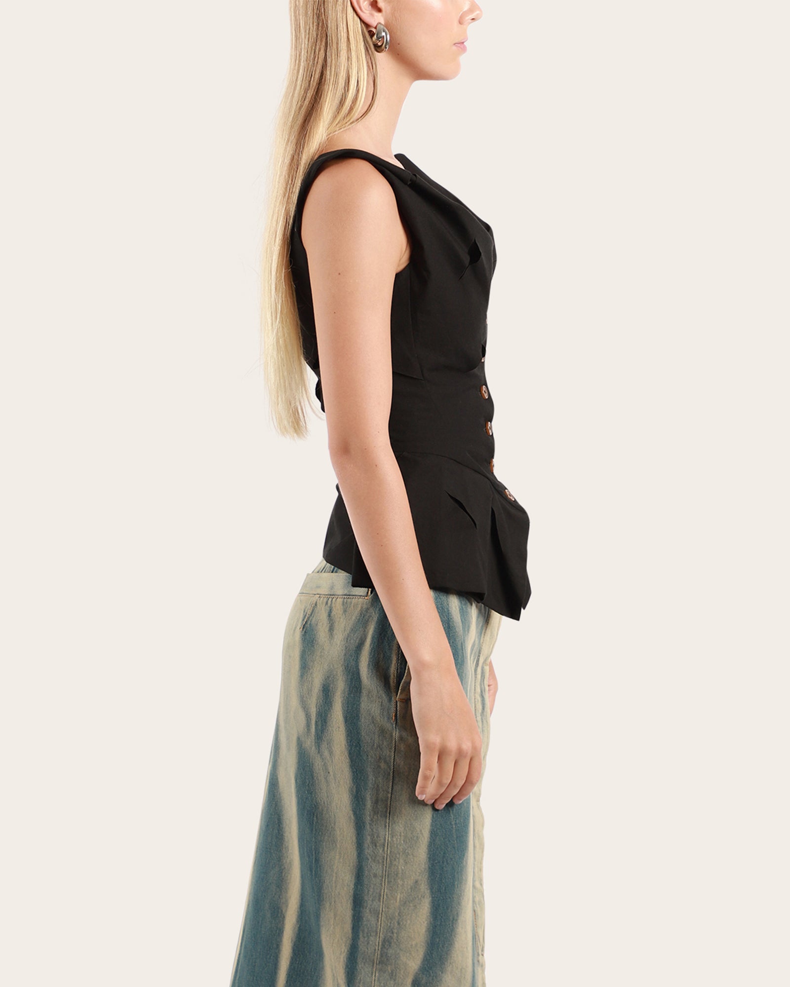 This sleeveless top features a flattering draped neckline and a sculpted, corset-inspired silhouette. Accented with a row of wooden buttons down the front and a pointed peplum hem, it combines elegance with a touch of vintage flair. Finished with the signature Orb logo for a distinctive touch. Made in Italy.