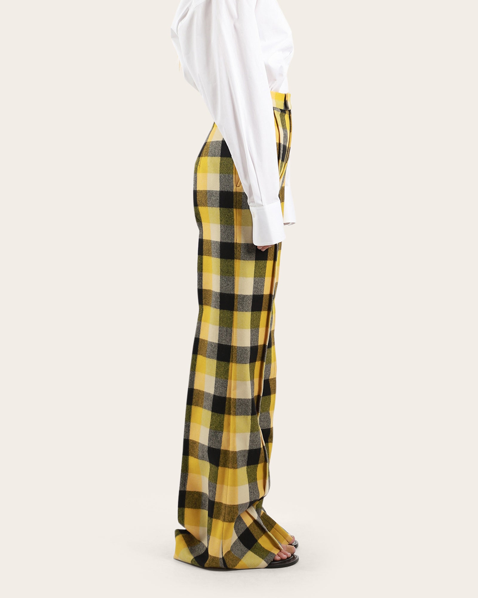 These wide leg trousers feature, a lightweight wool fabric, fluid flared silhouette accentuated with pixel check finish, folded front stitching detail, side pockets, sits around waistline. Made in Italy.