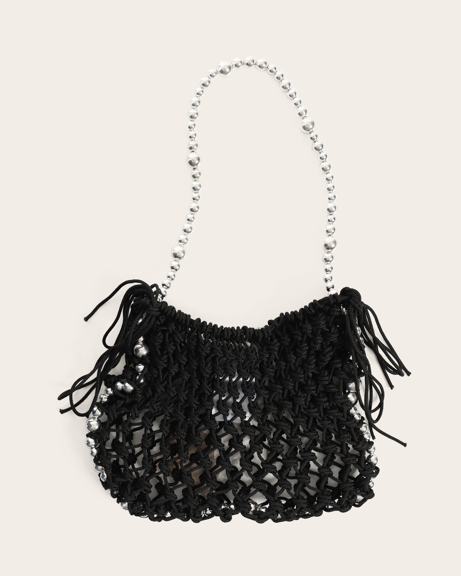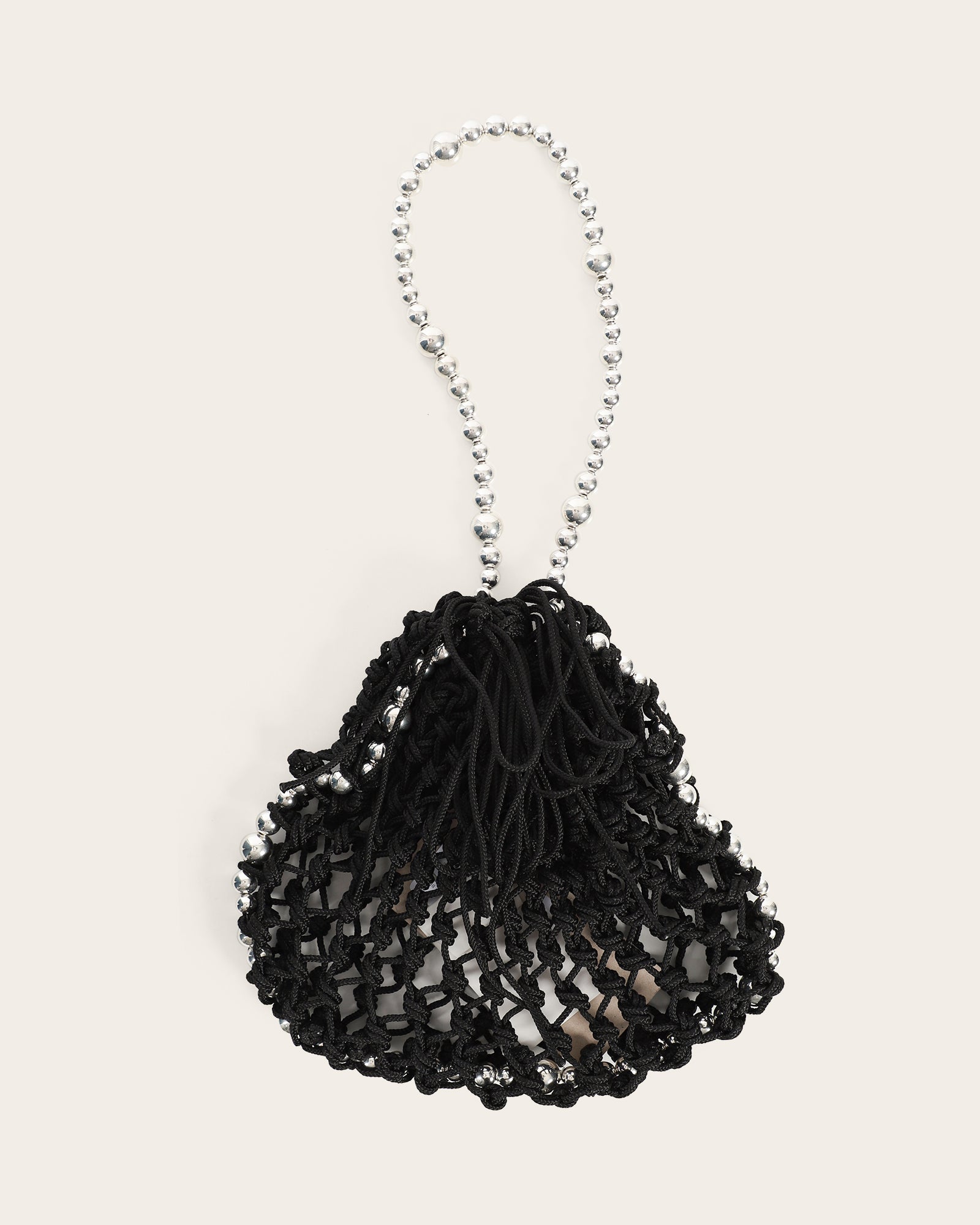 Designed by Niccolò Pasqualetti, this structured mini bag effortlessly blends minimalist design with refined functionality. Featuring a sleek, architectural silhouette, it includes a practical top handle with little silver tone beads in different sizes attached together, draped strap detailing on each side, main compartment, with a woven design. Perfect from day to evening, this sophisticated piece adds a touch of effortless polish to any outfit. Handmade in Italy.