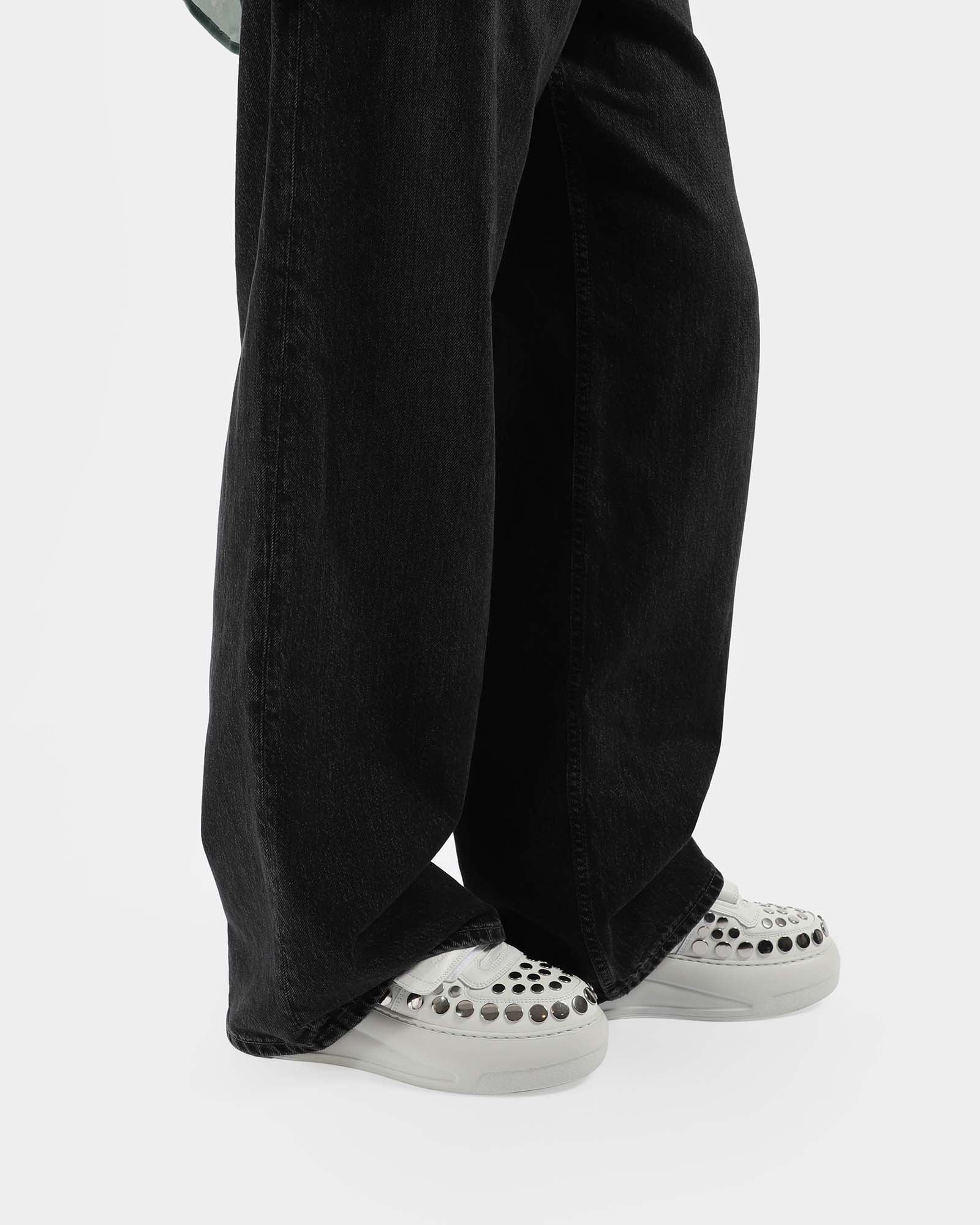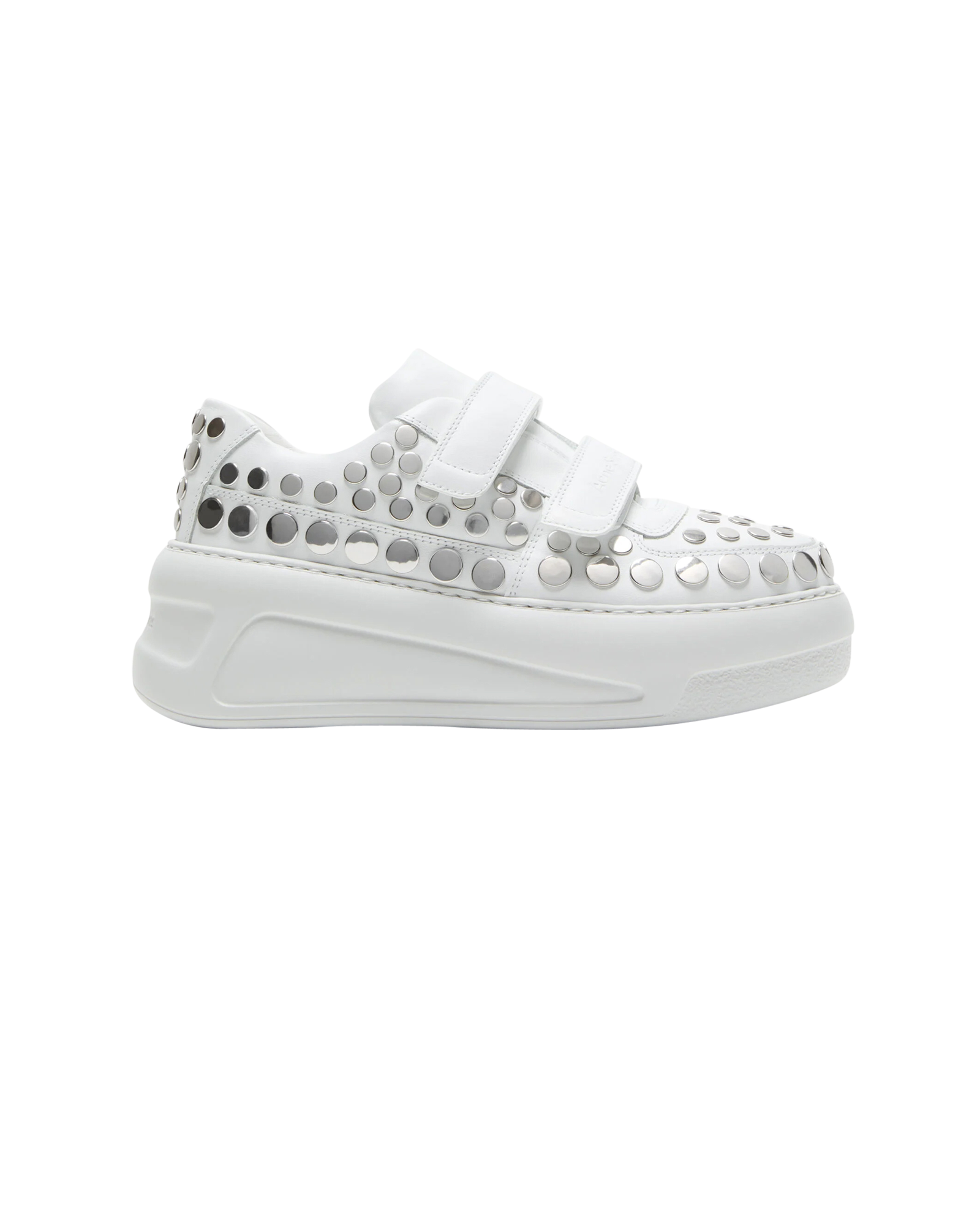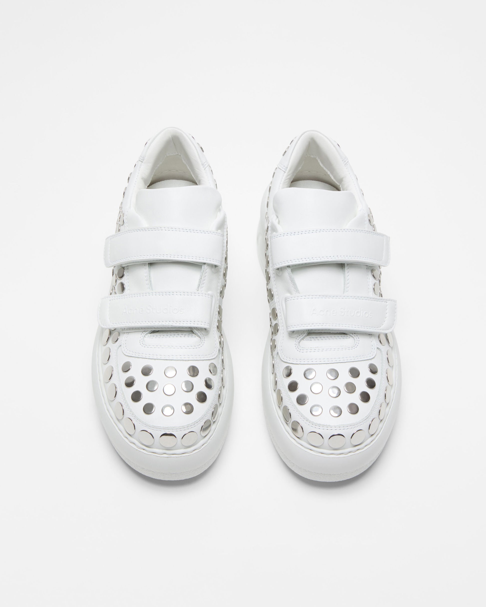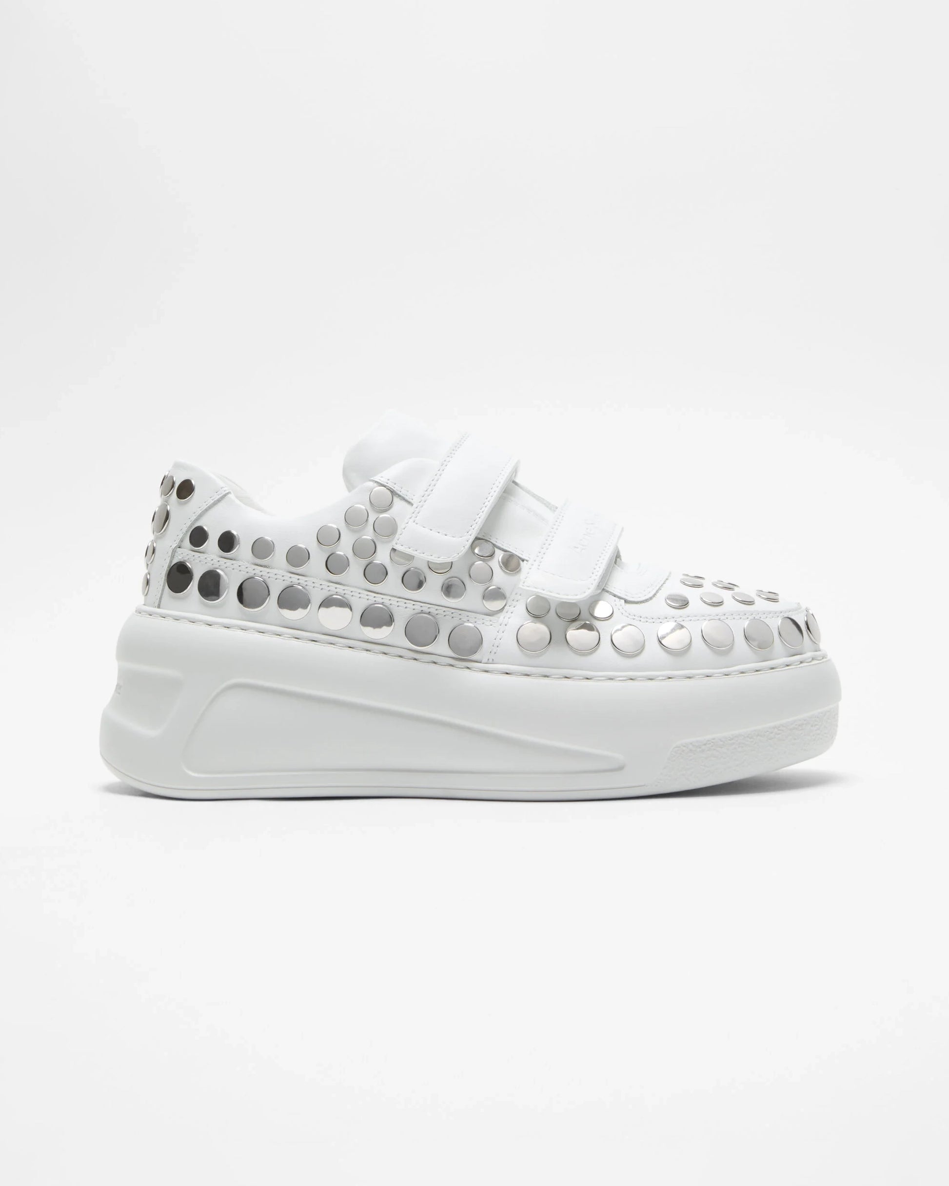 Velcro sneakers with 80s tennis-inspired design, stud details, embossed logo, smooth leather, and platform soles.