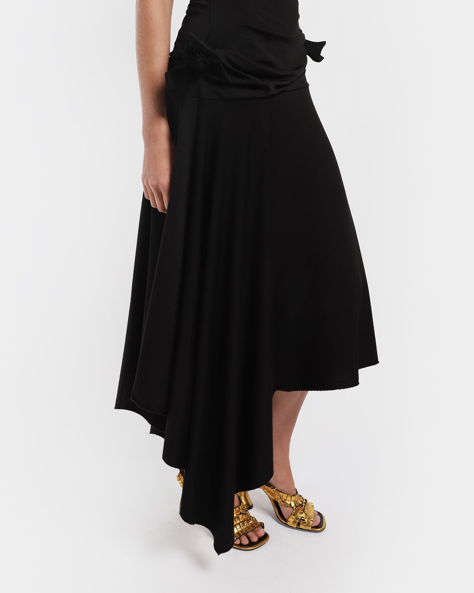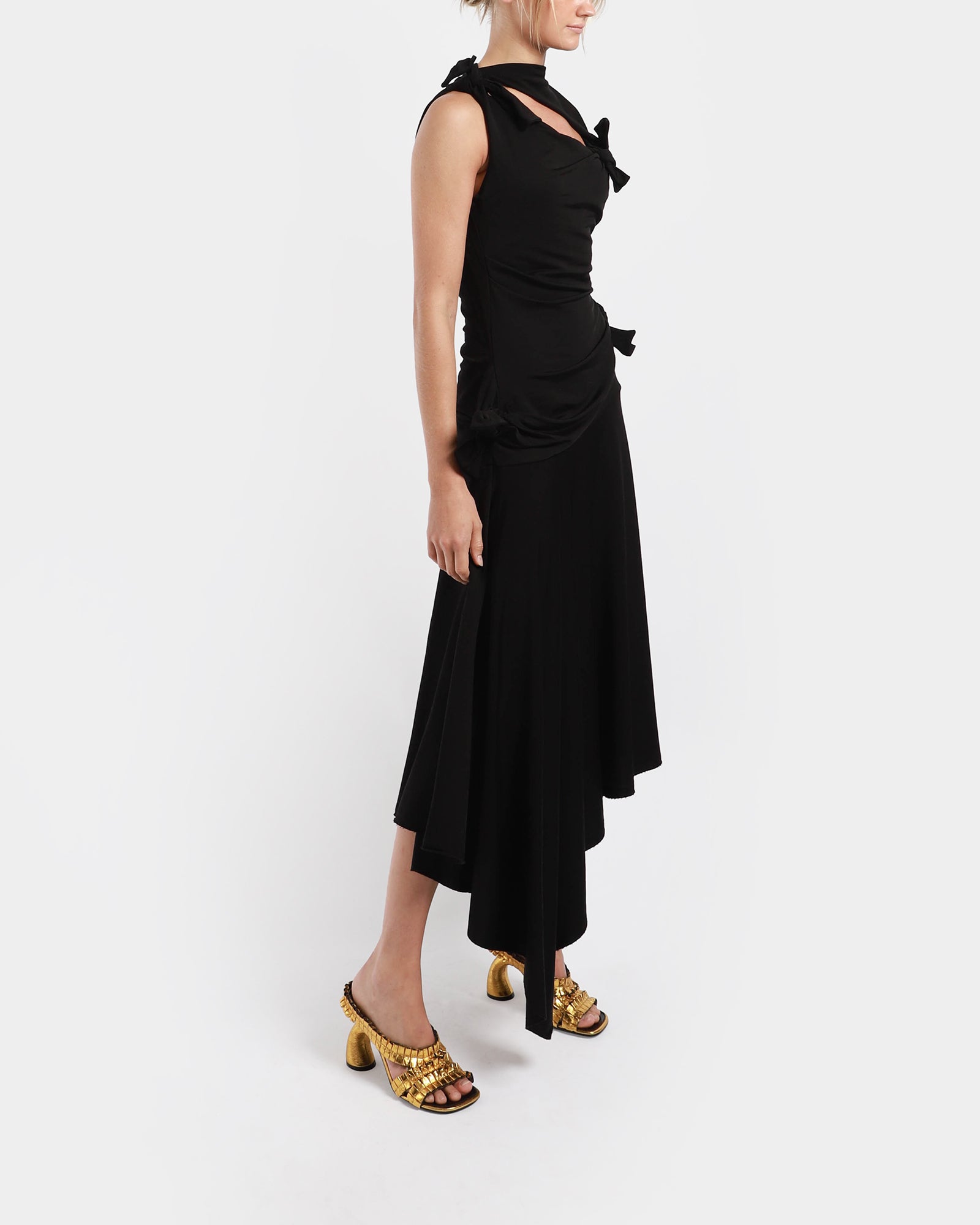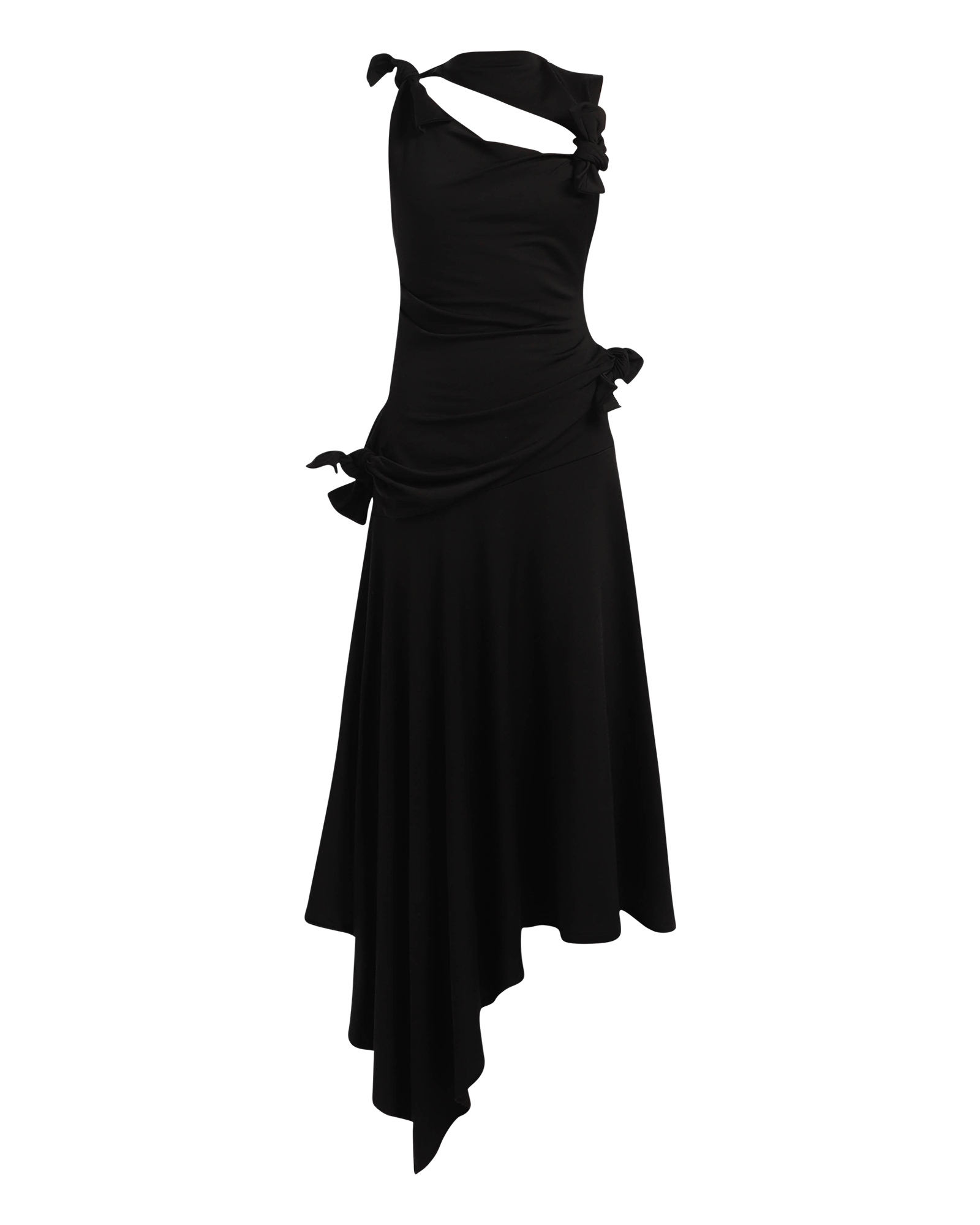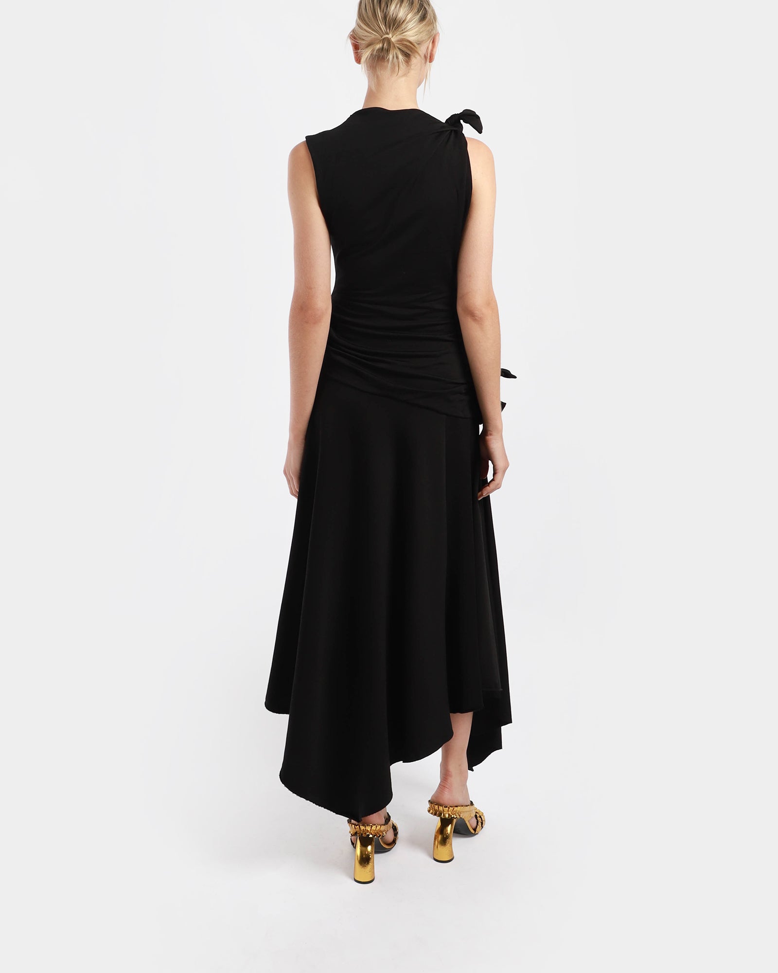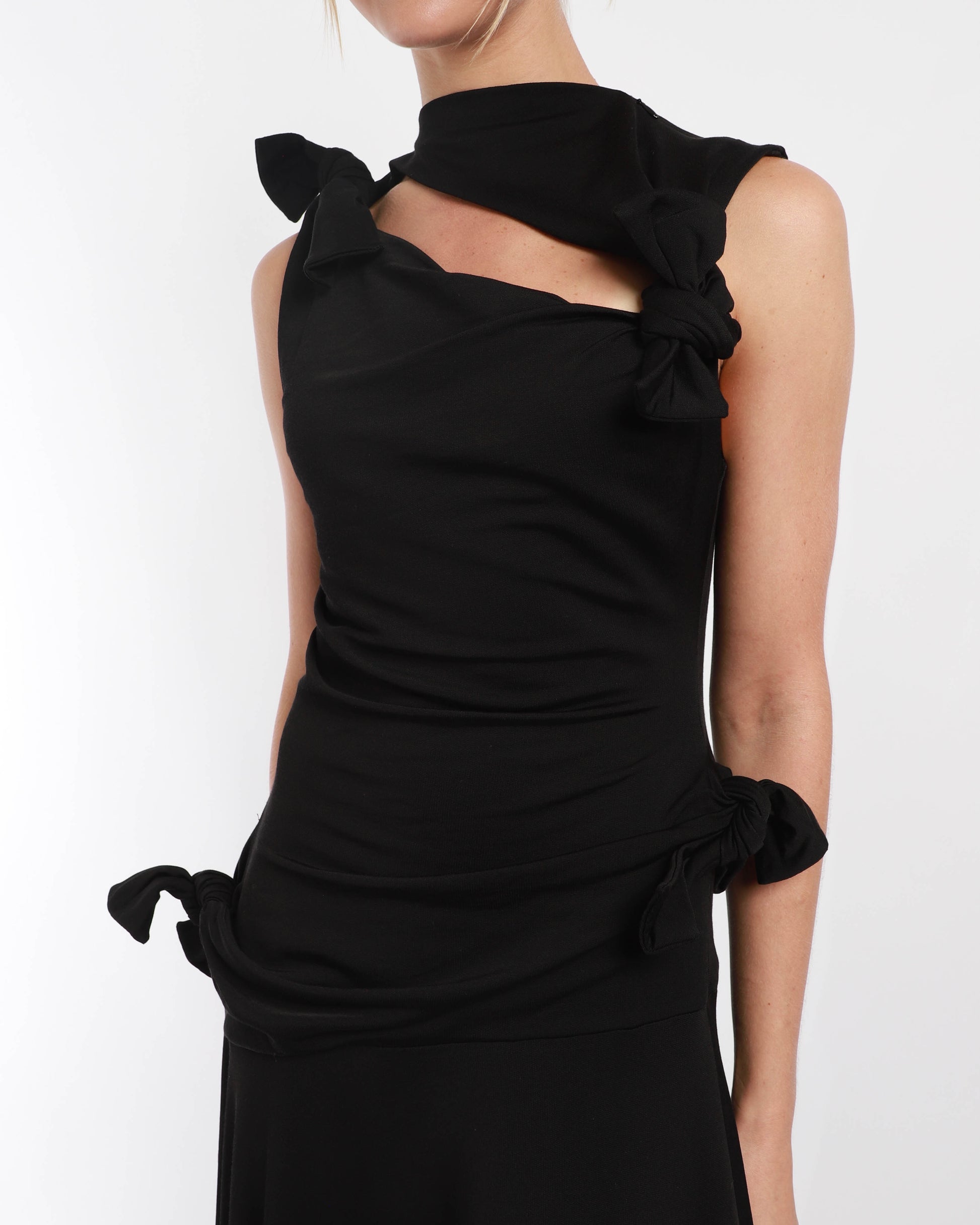 A sleeveless dress crafted from a soft stretch cotton blend, featuring tie-up knots details with an asymmetric structure and hemline and a mid length cut.