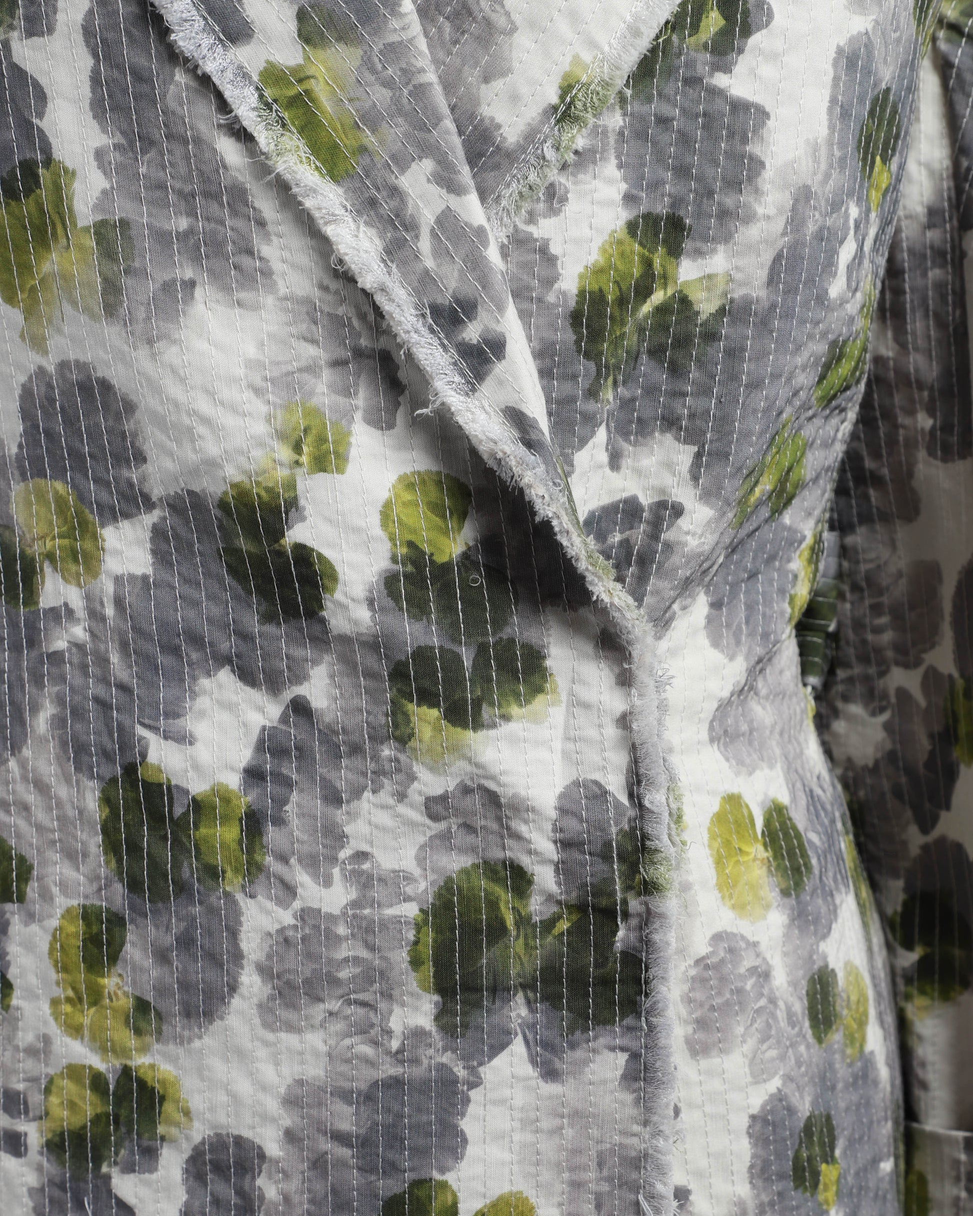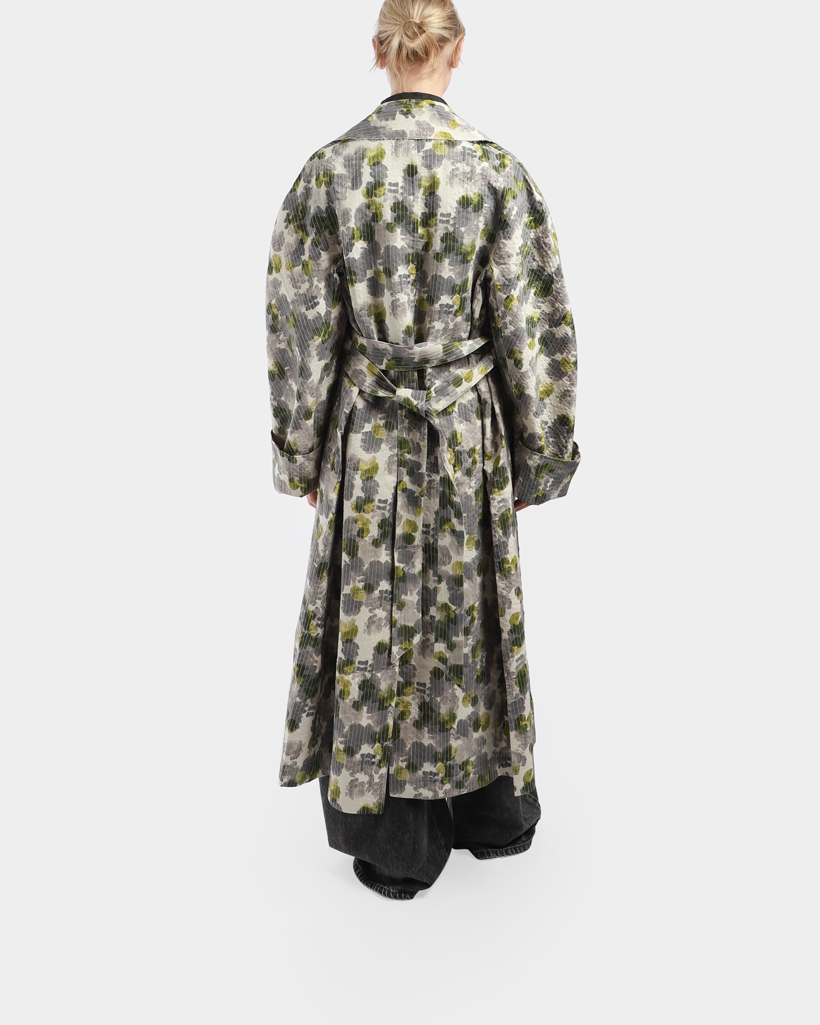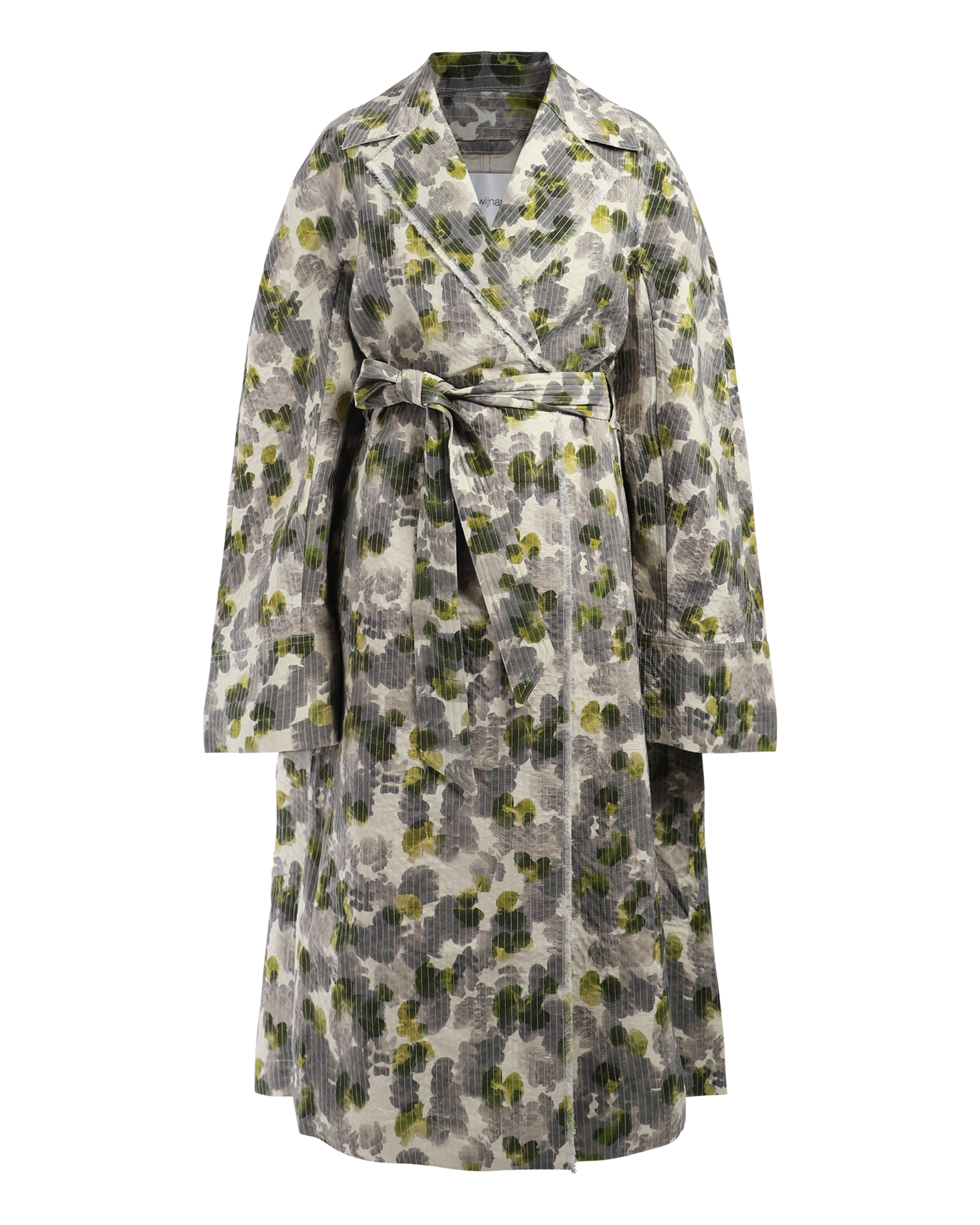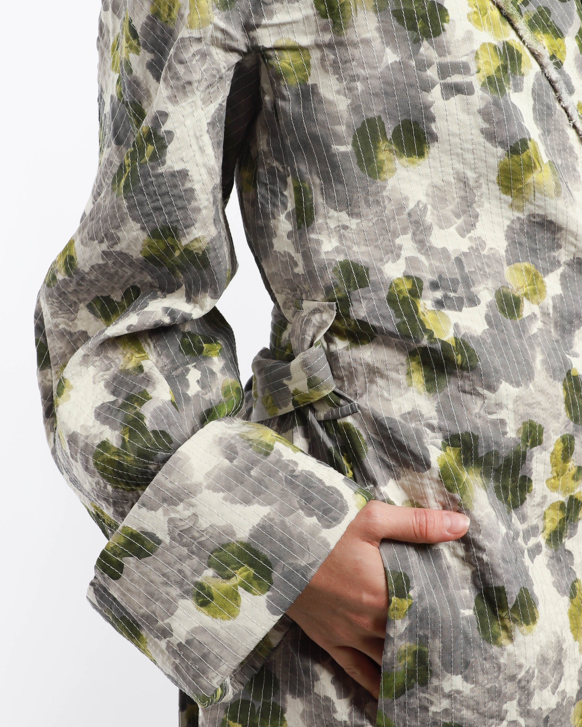 This quilted coat features a lapel collar, waist belt, and side pockets, offering a sleek, slightly oversized silhouette and making it an essential layering piece for the season. The abstract floral print and contrast stitching add a seasonal touch.