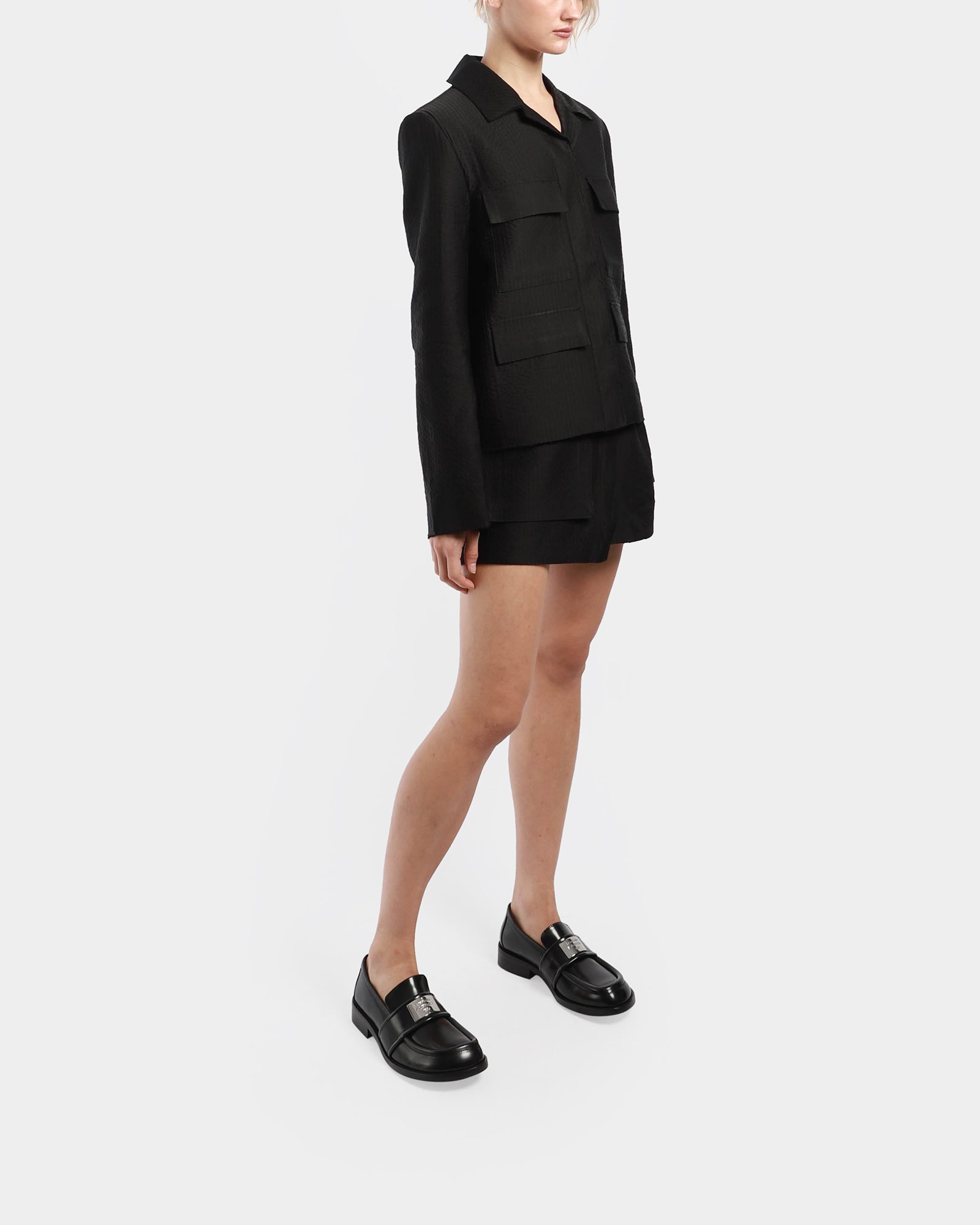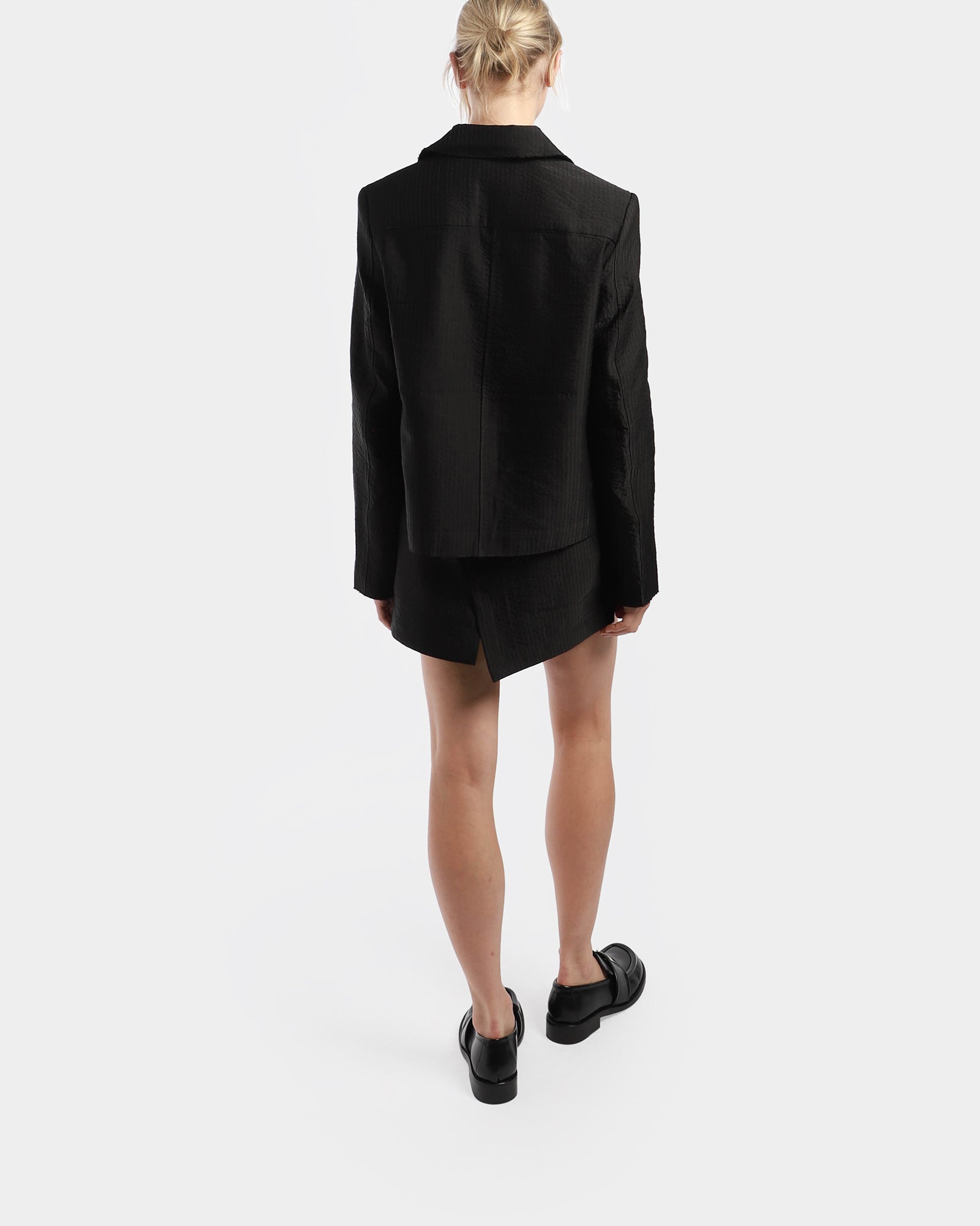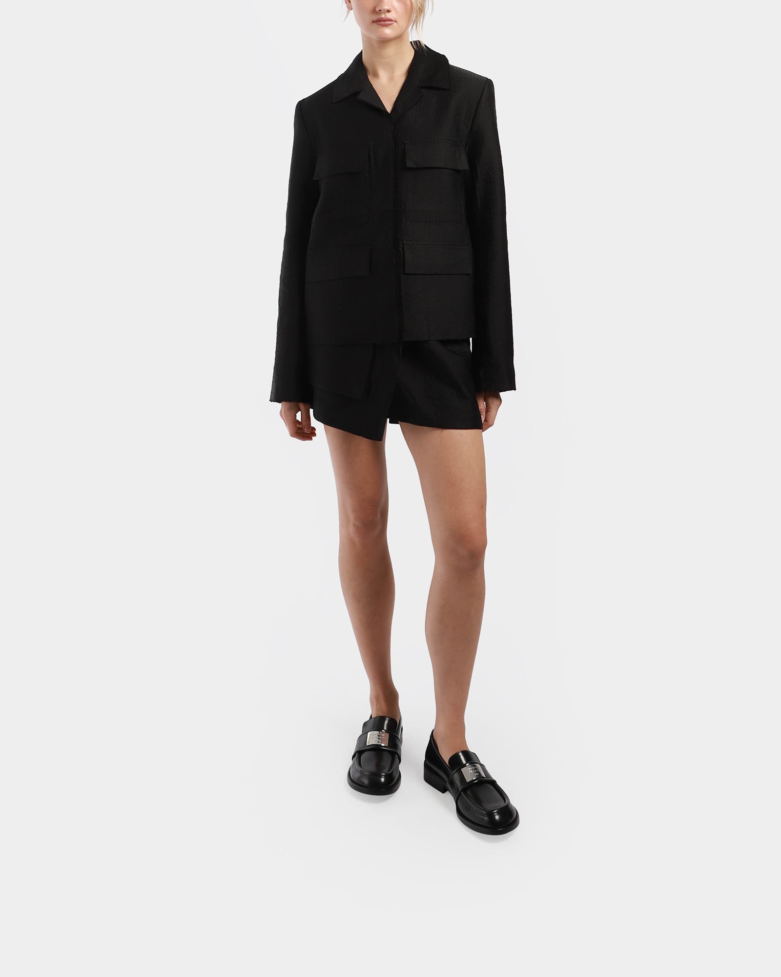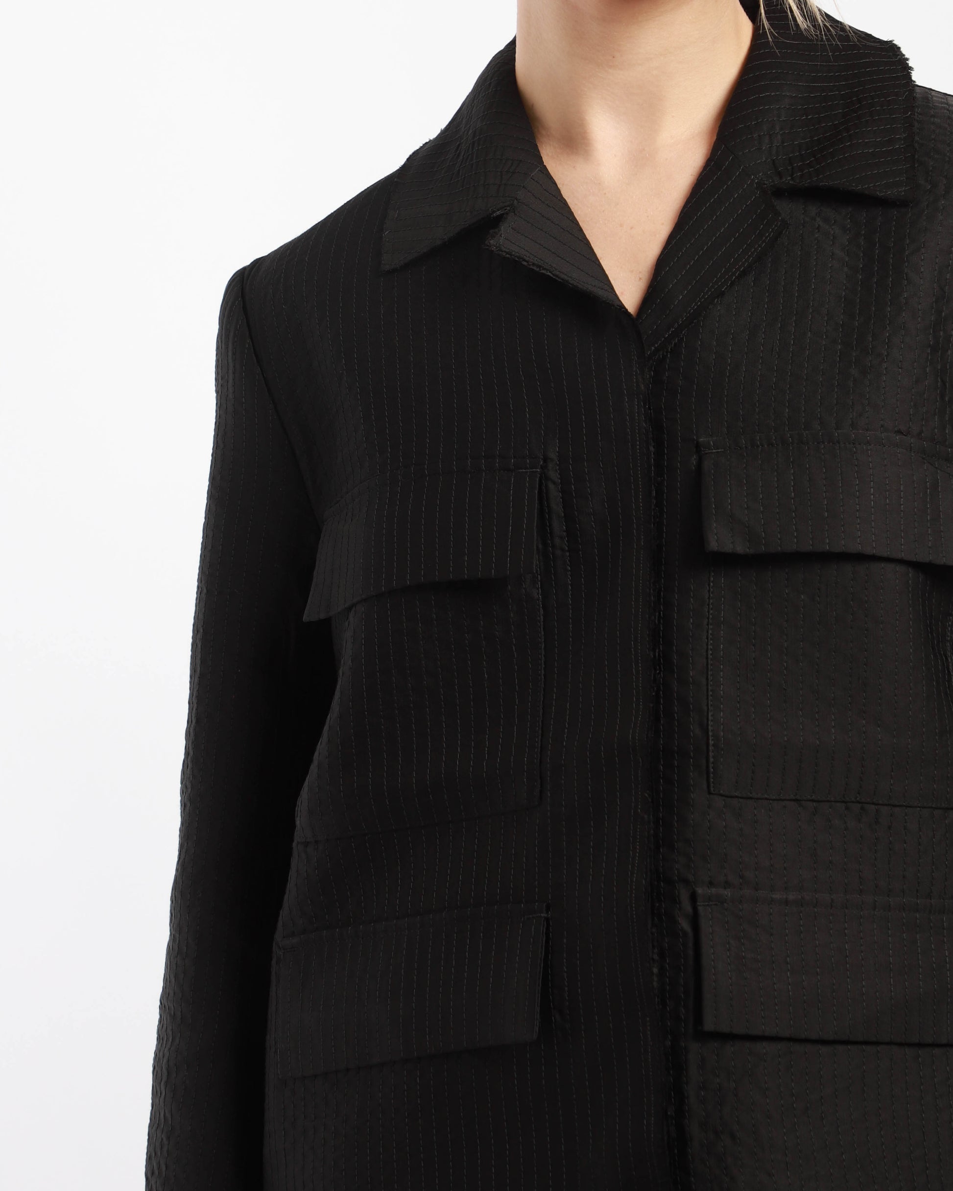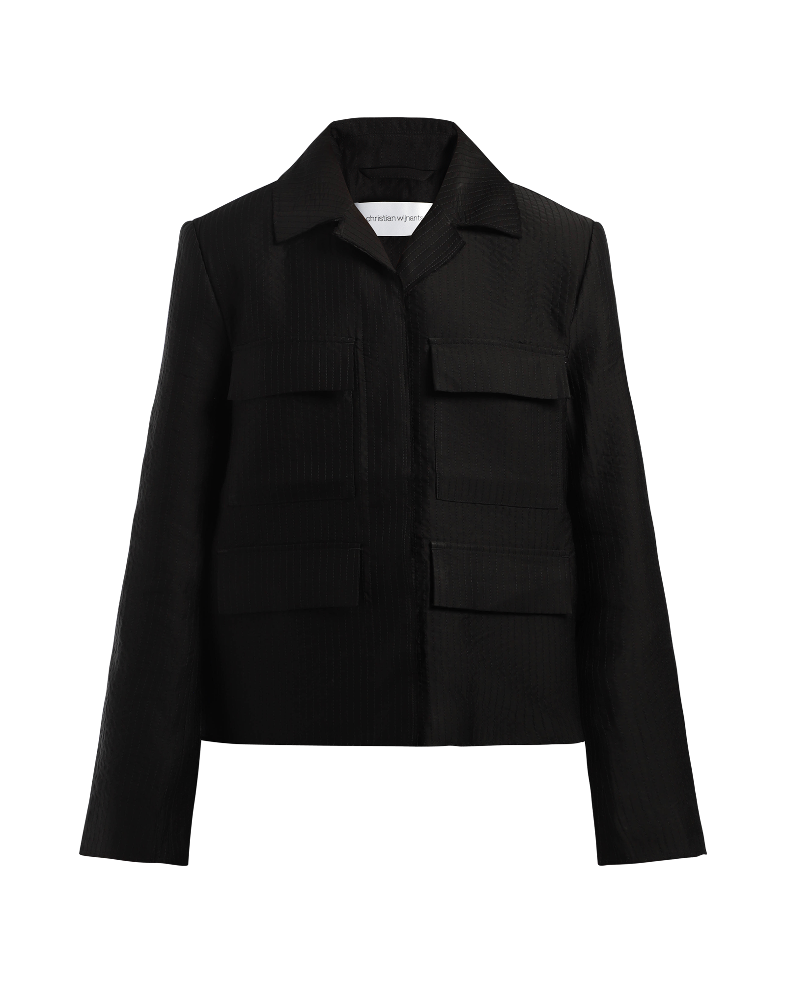 This cropped quilted jacket features a classic collar, a concealed button closure, large front pockets, and unfinished hem details for a modern twist on classic outerwear.
