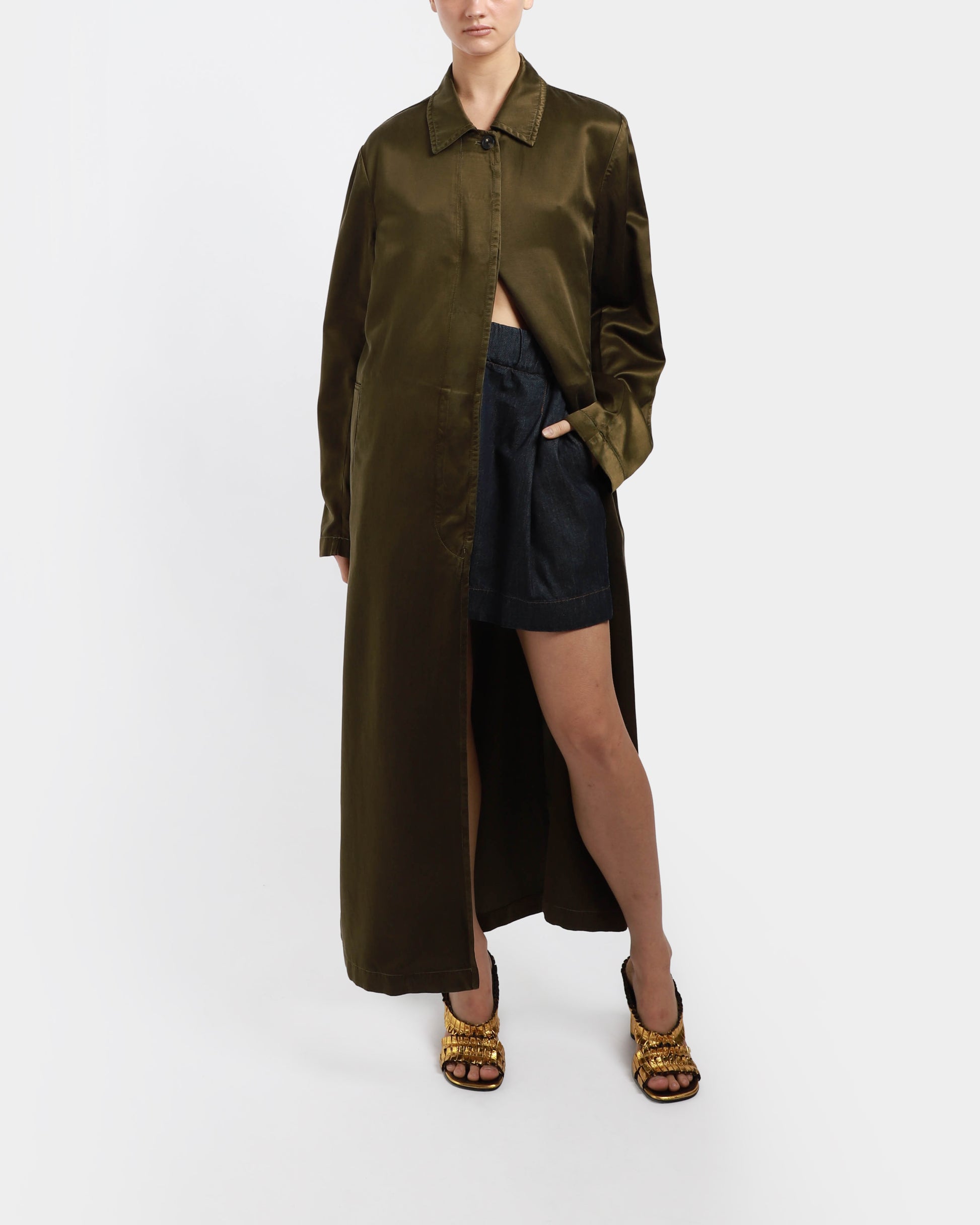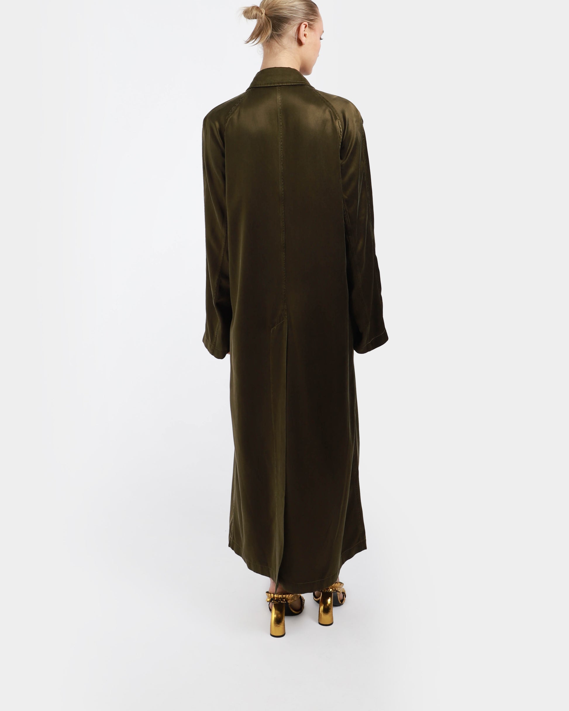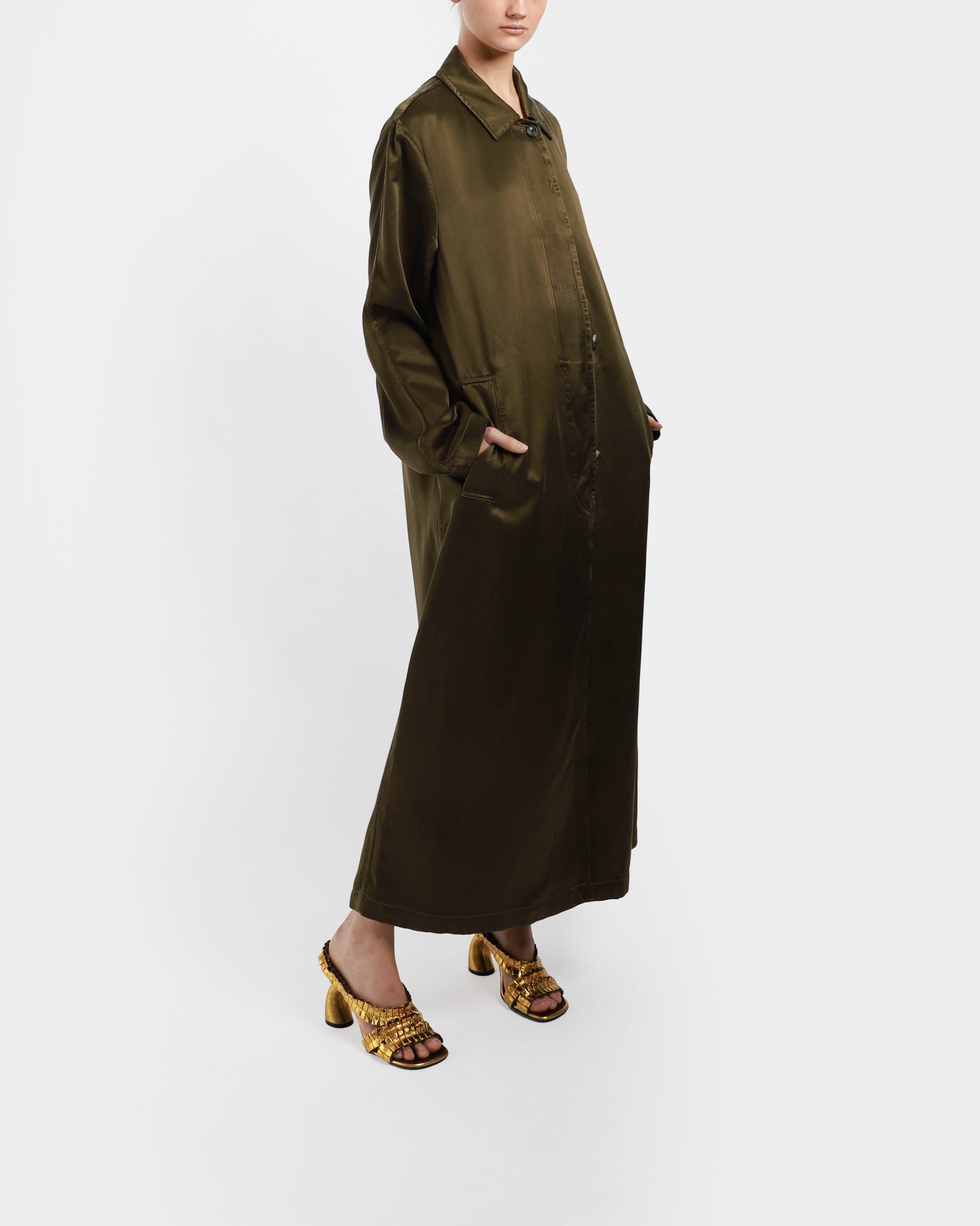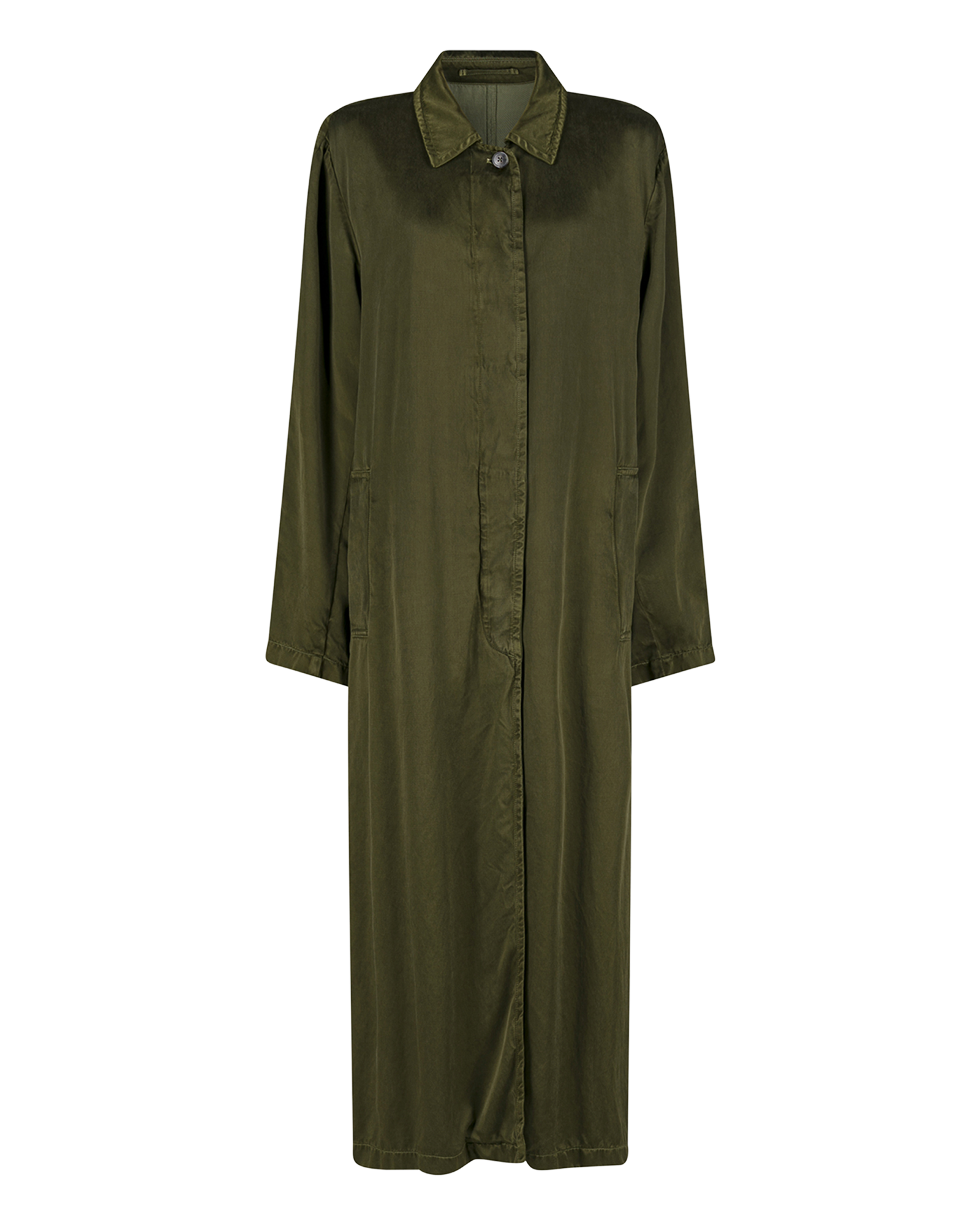A silky feel coat, featuring a classic collar, a single button closure with a concealed placket and two side-slip pockets. This piece offers dropped shoulders, a relaxed fit and straight cut.