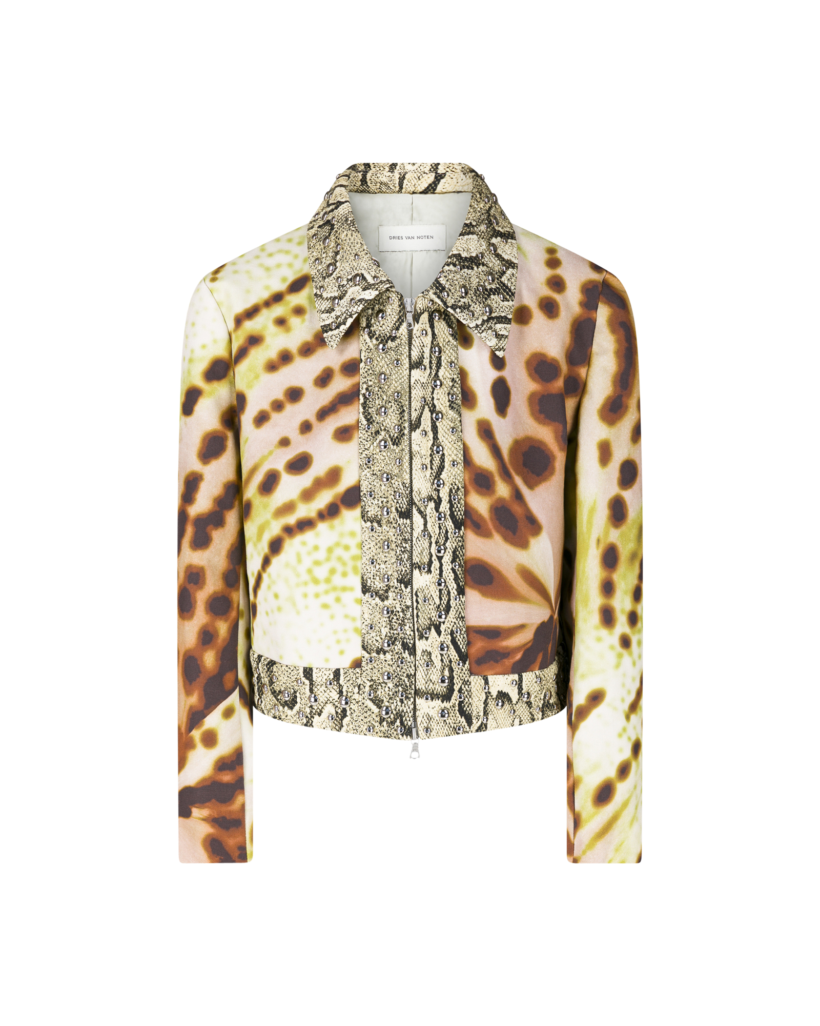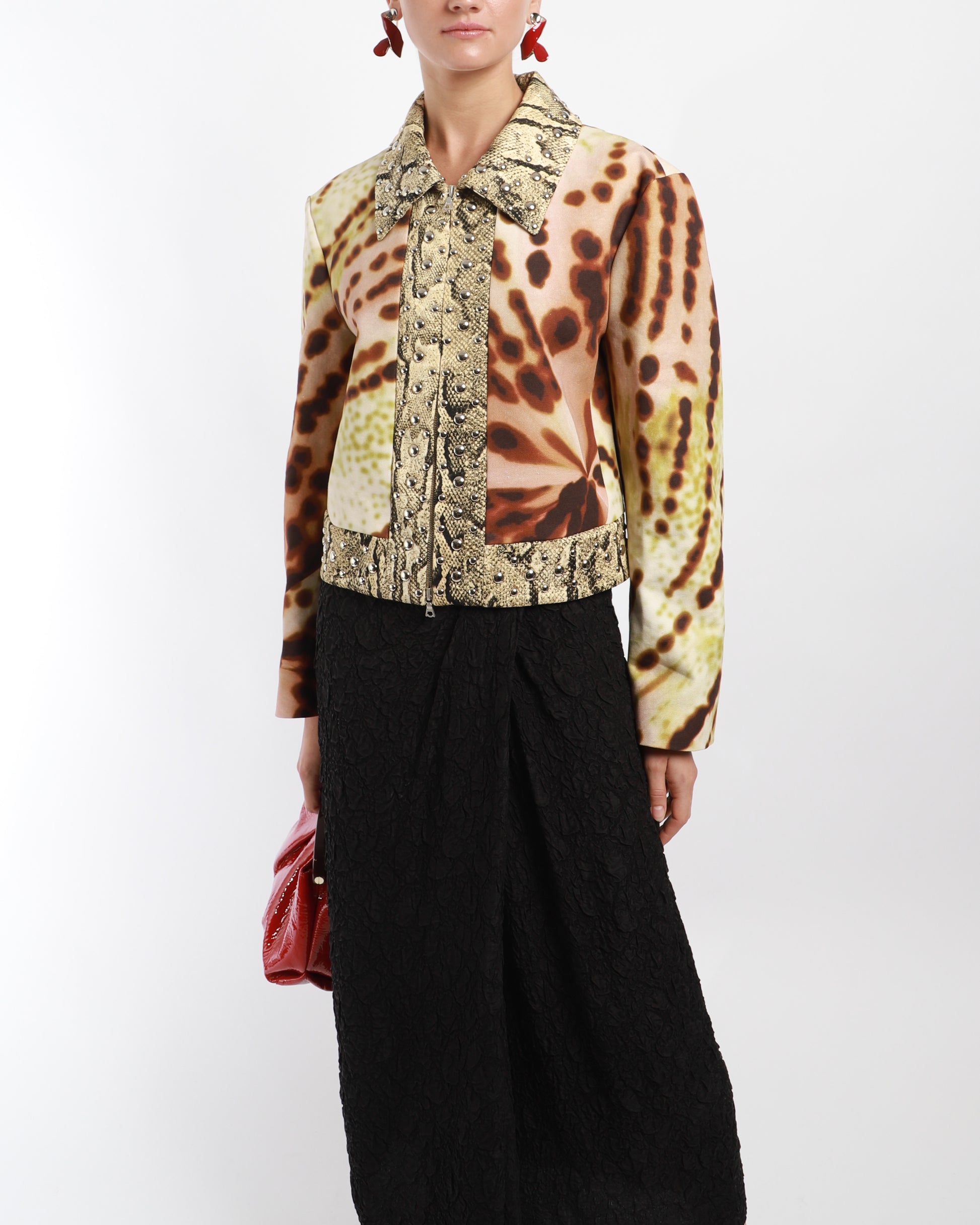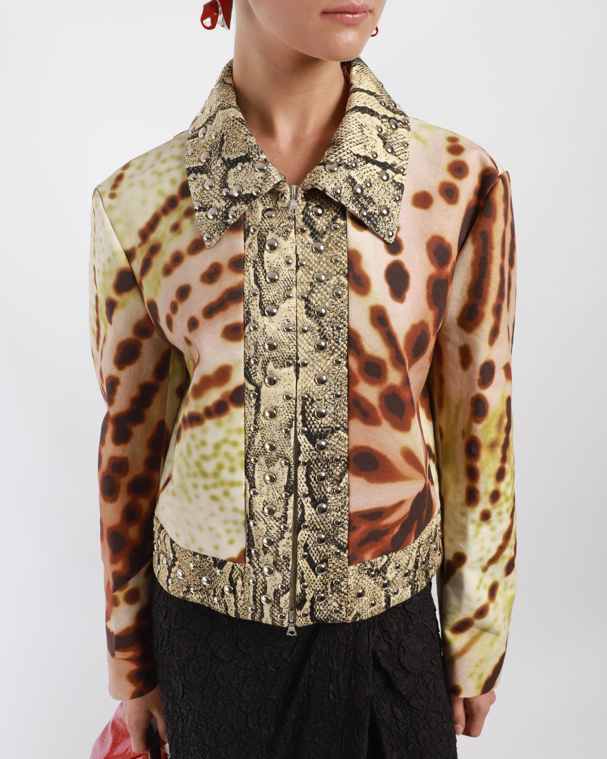 A stunning cropped jacket, featuring a combination of different fabrics and prints. It offers a snakeskin printed trim embellished with silverstone studs. It has a large pointy collar with a two-way zip at front. The abstract print offers a different dimension to the garment.