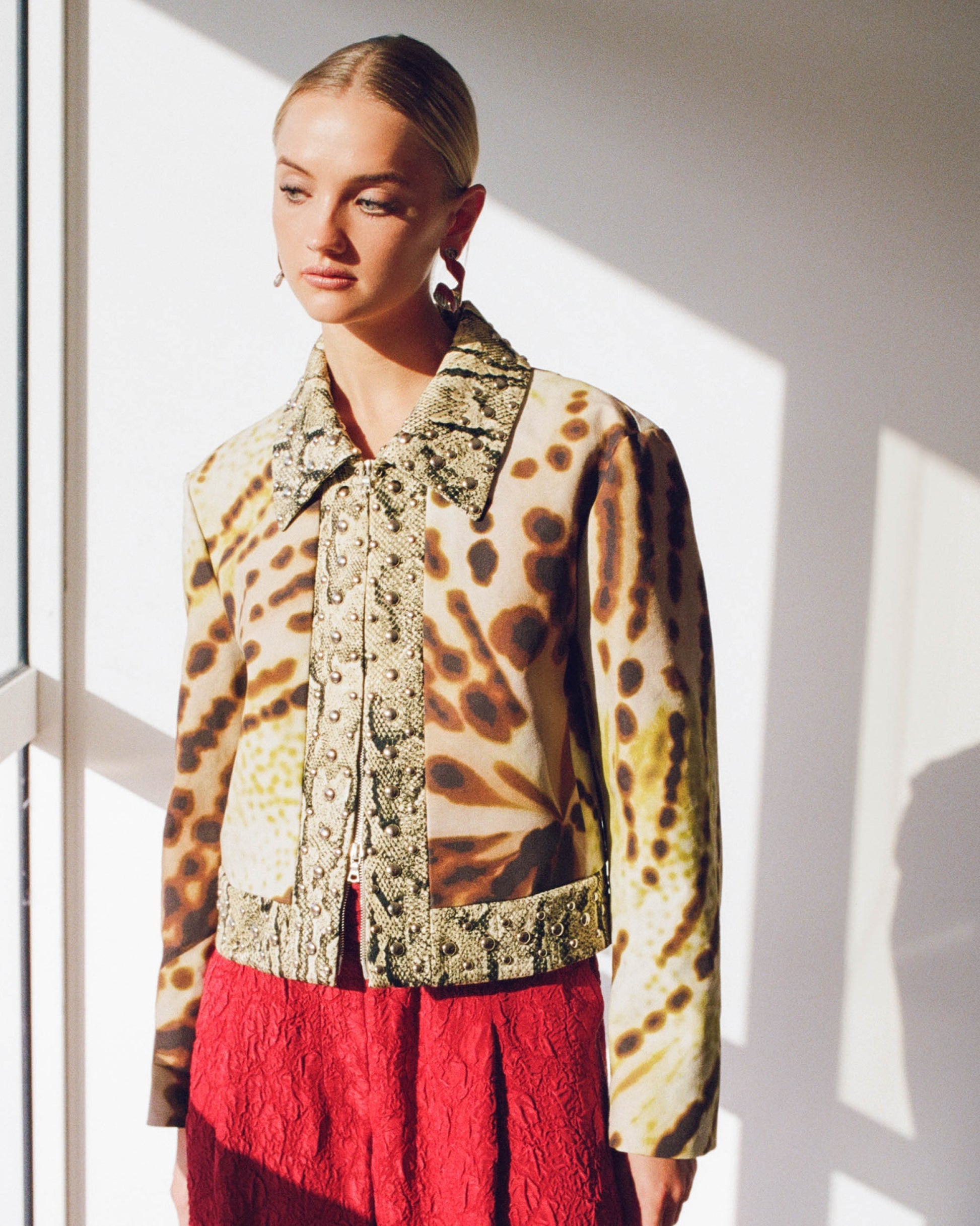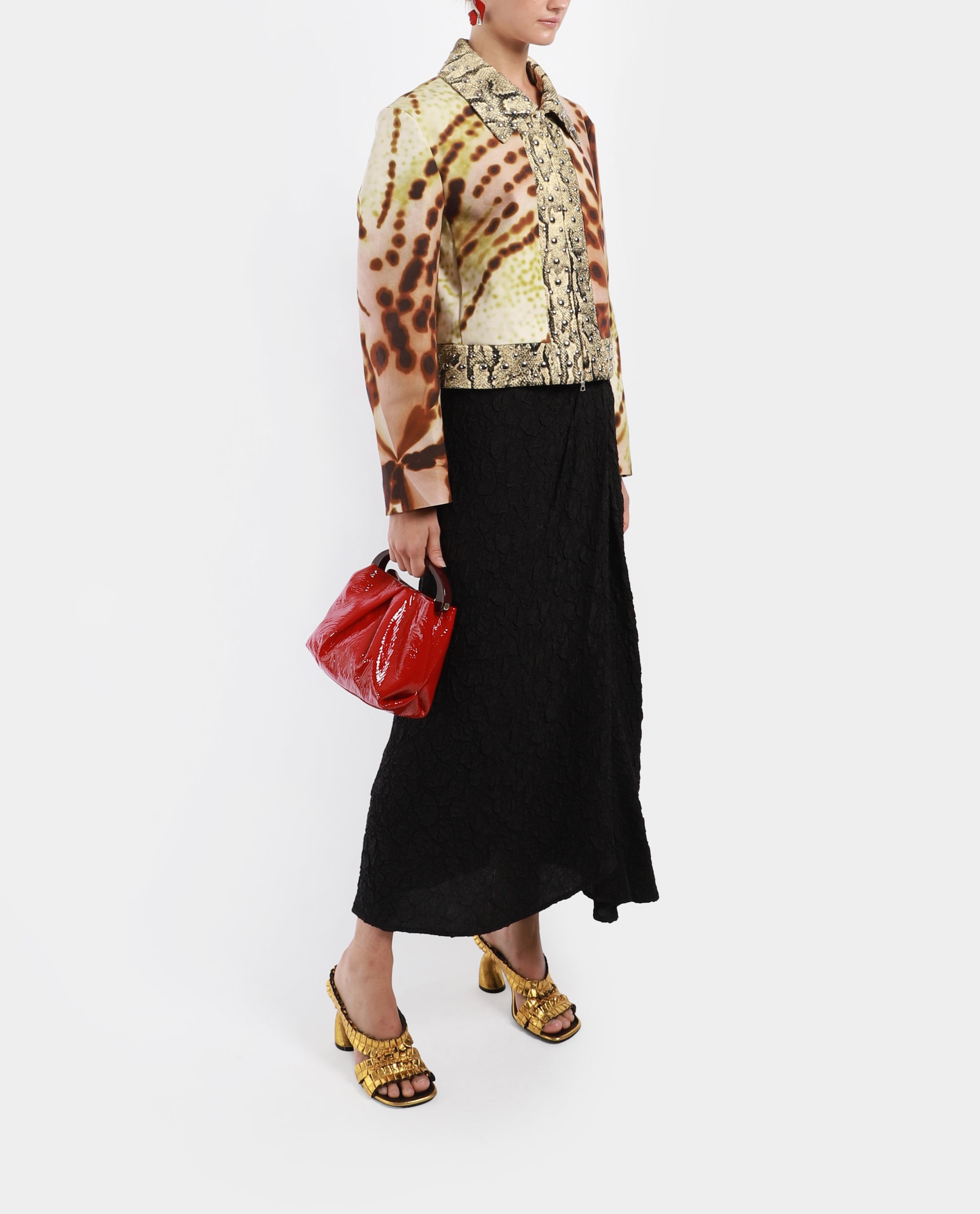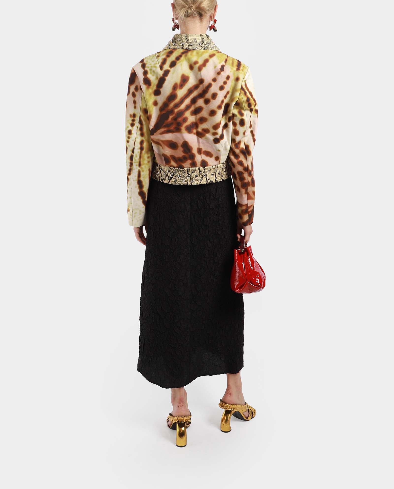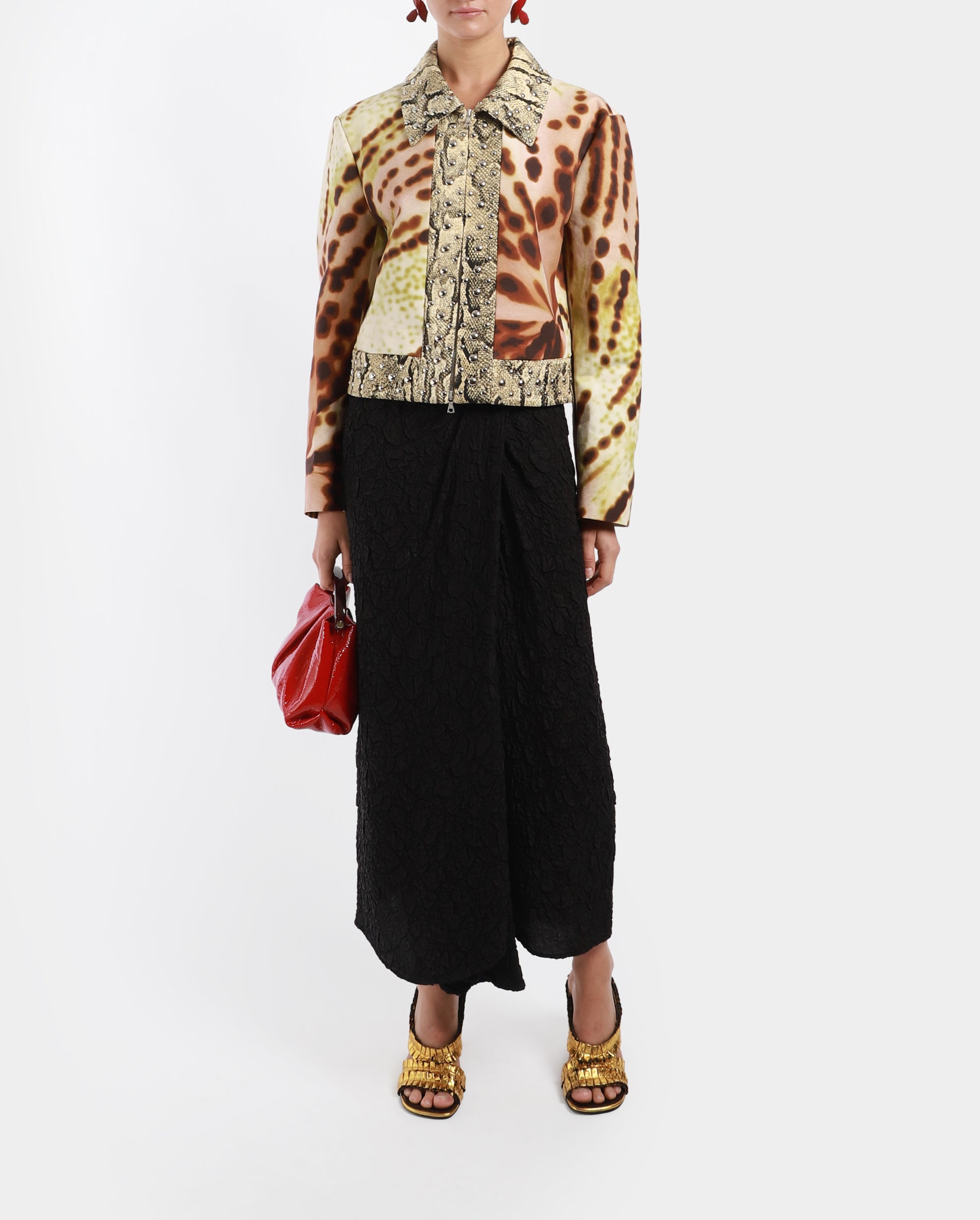 A stunning cropped jacket, featuring a combination of different fabrics and prints. It offers a snakeskin printed trim embellished with silverstone studs. It has a large pointy collar with a two-way zip at front. The abstract print offers a different dimension to the garment.