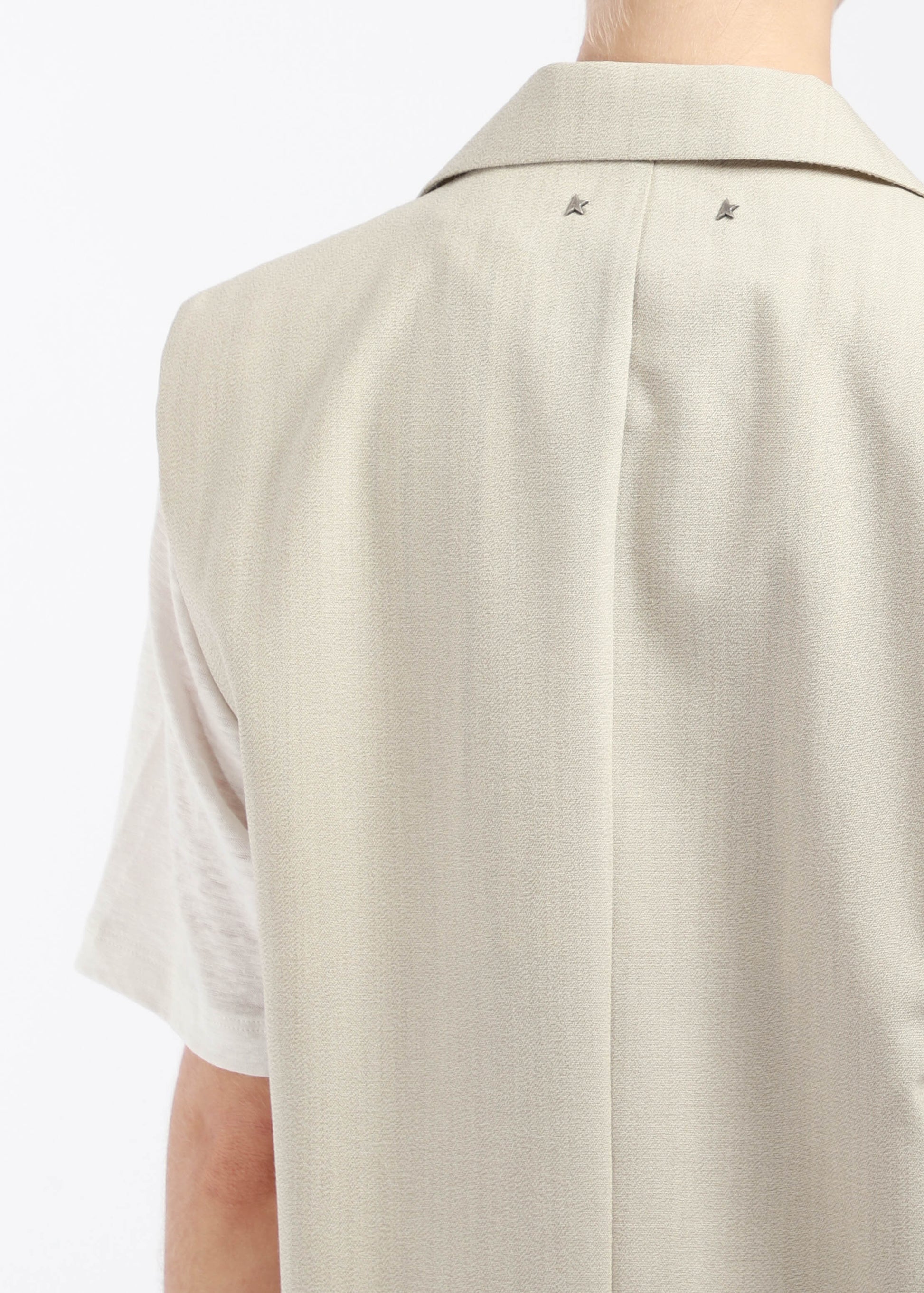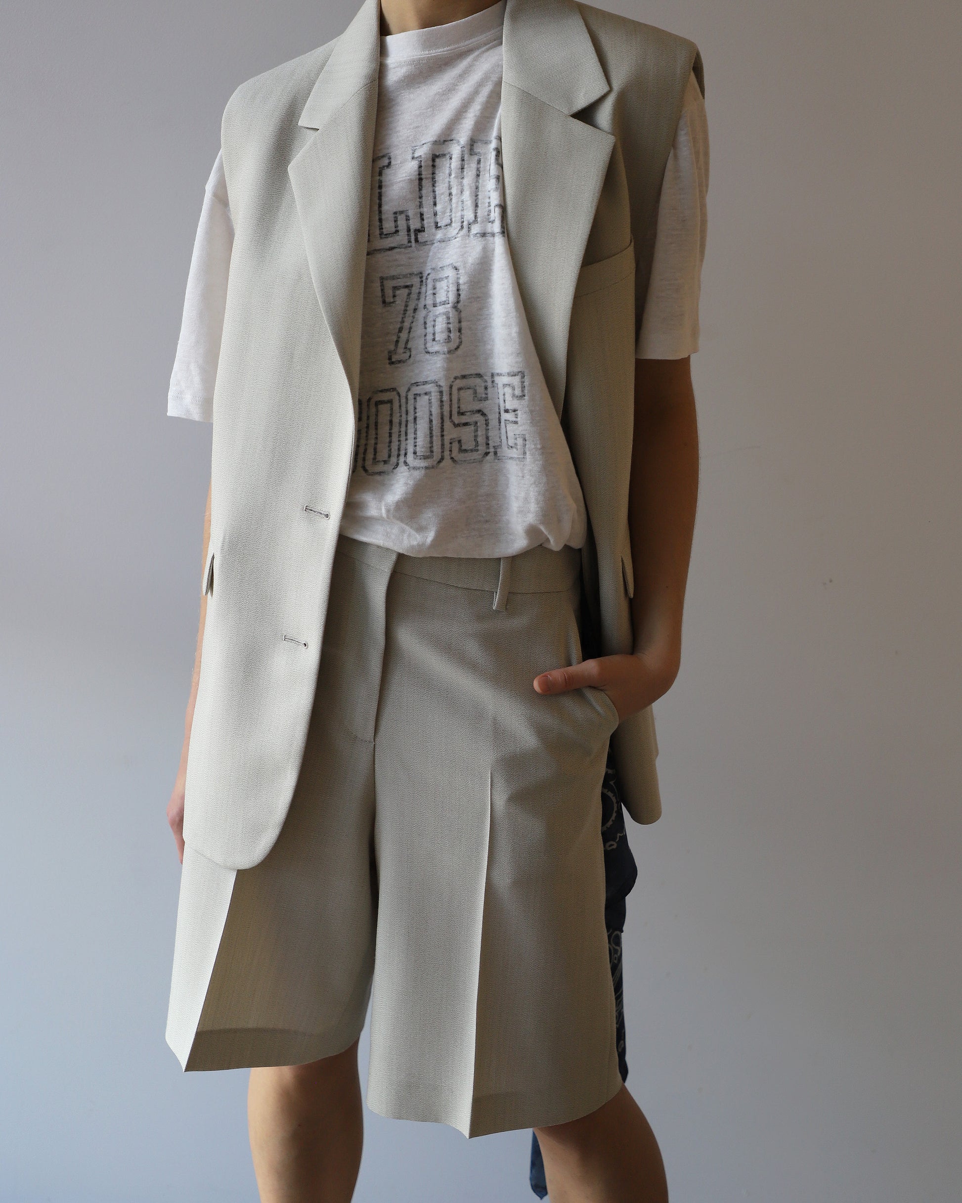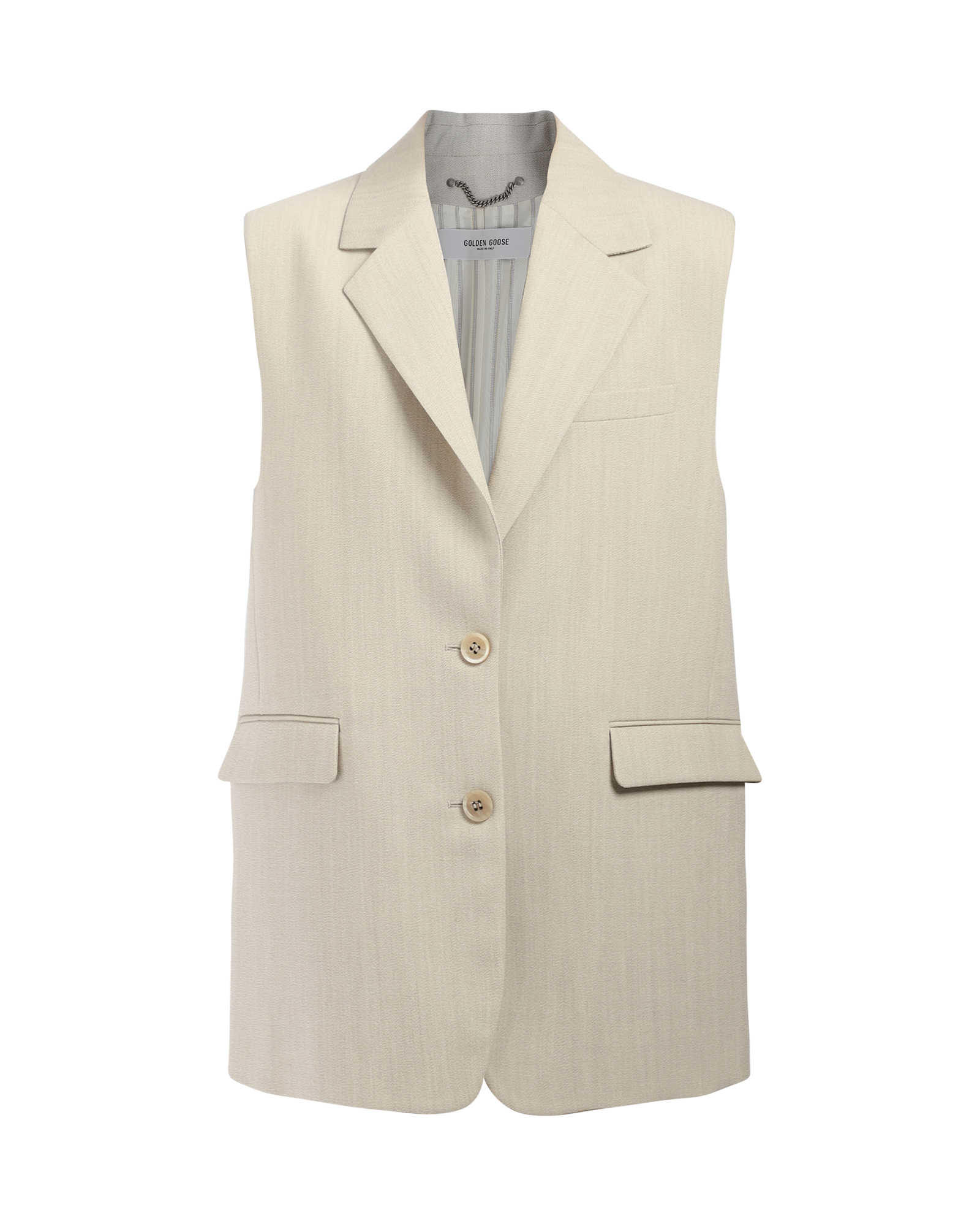 The Journey Nicole vest, made in Italy, featuring notched lapels, two front buttons, sleeveless, chest welt pocket, inside pocket with button to close and two side flap pockets.