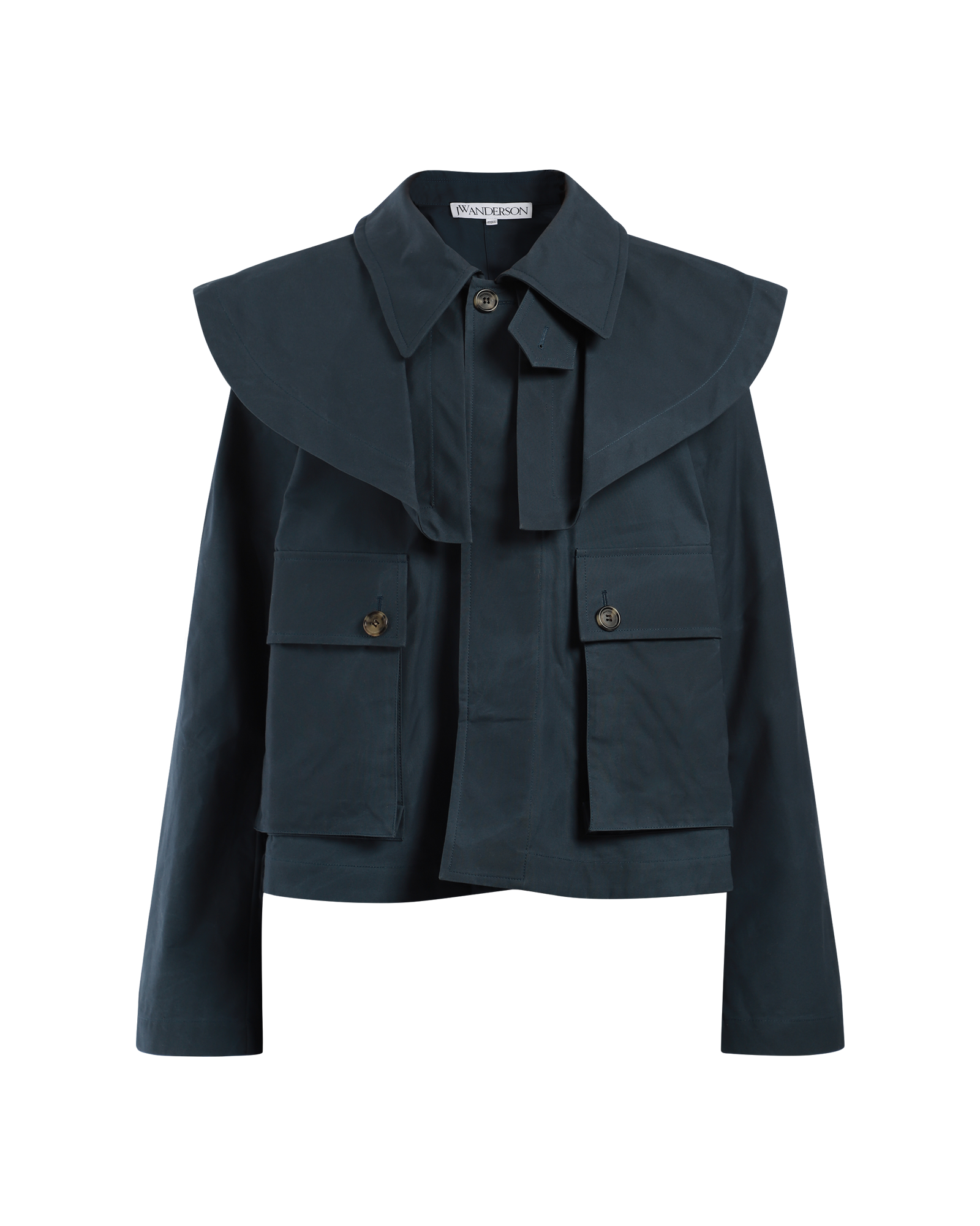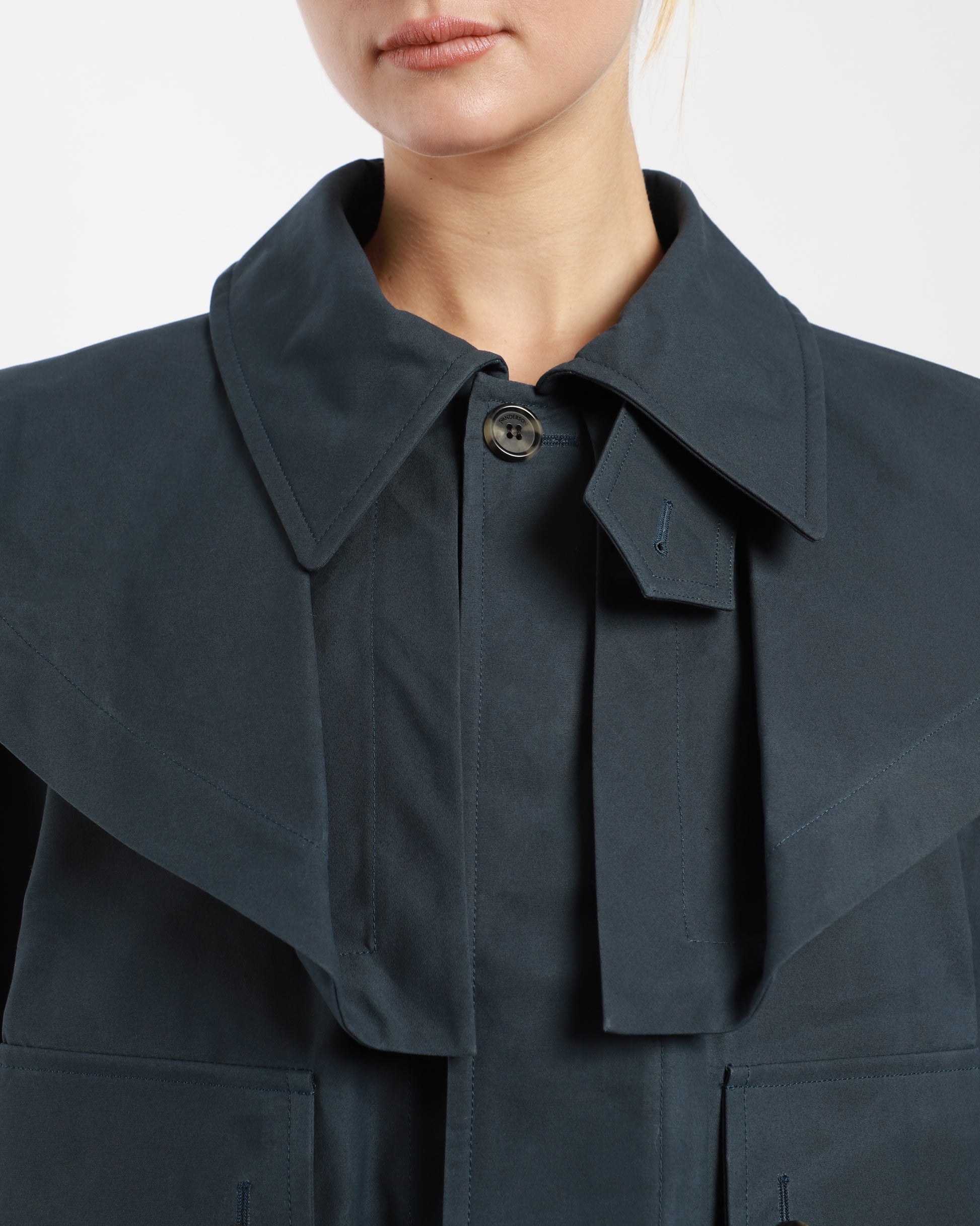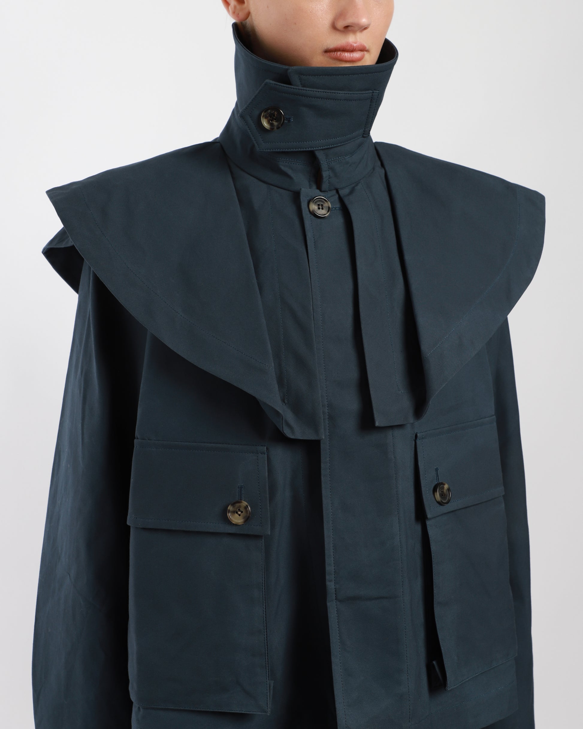 The Waxed Cotton Jacket is made from waxed cotton, which brings a unique structured texture. It has a relaxed-fit with oversized long sleeve and a cape style overlay on the shoulders. The spread collar converts to funnel neck with button to secure. It has concealed horn button closure at front, two large flap pockets with buttons to close on the side and is unlined.