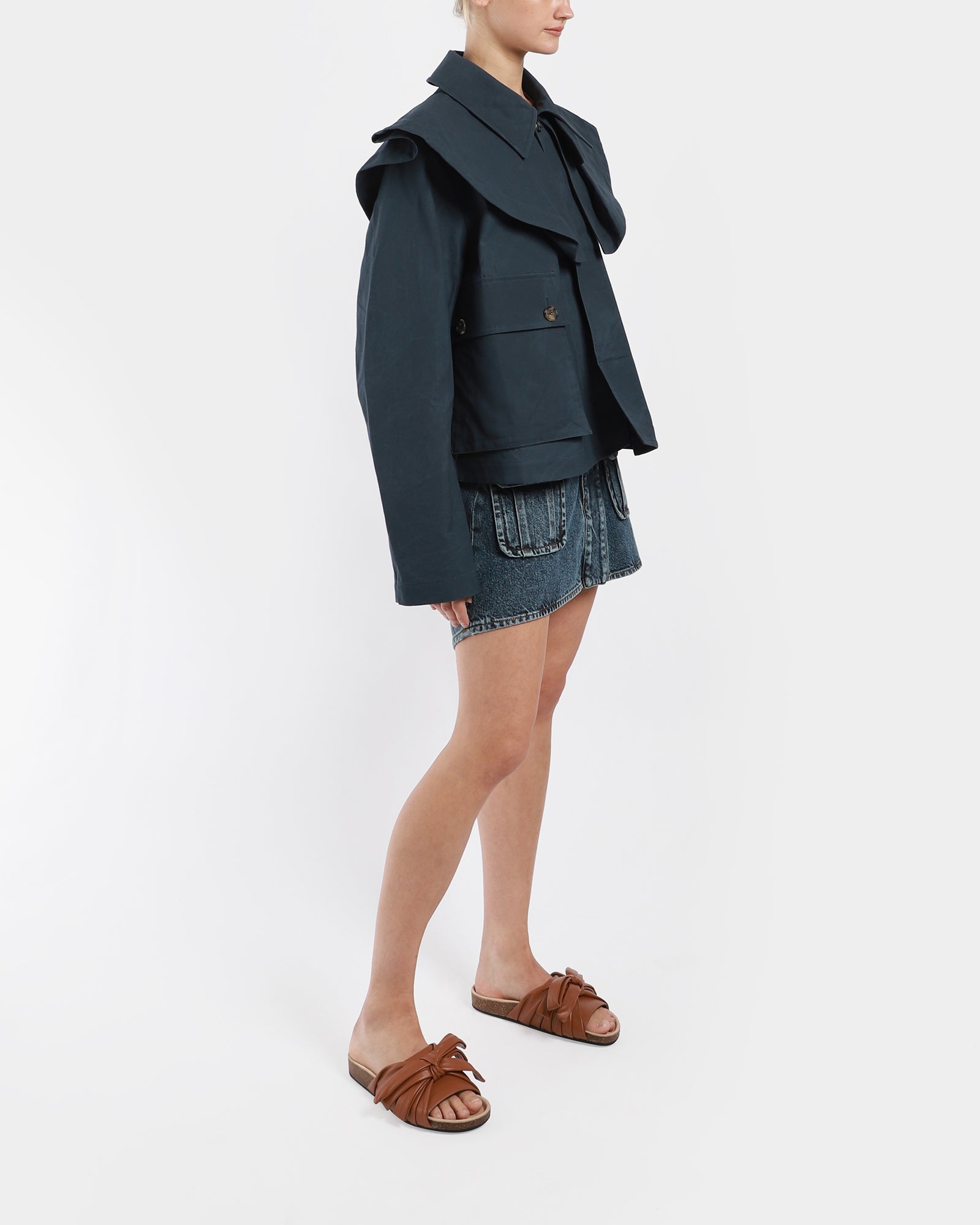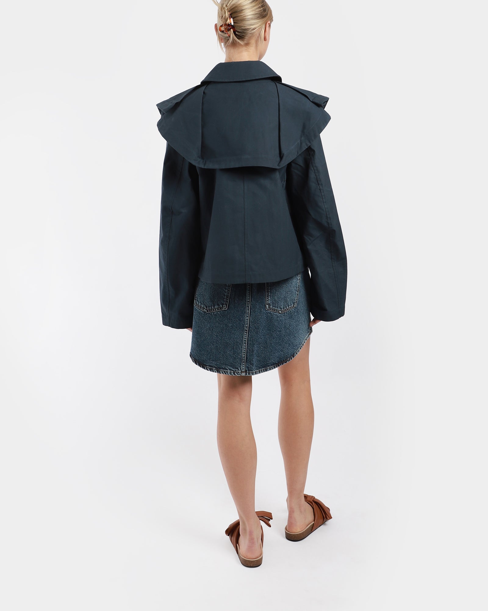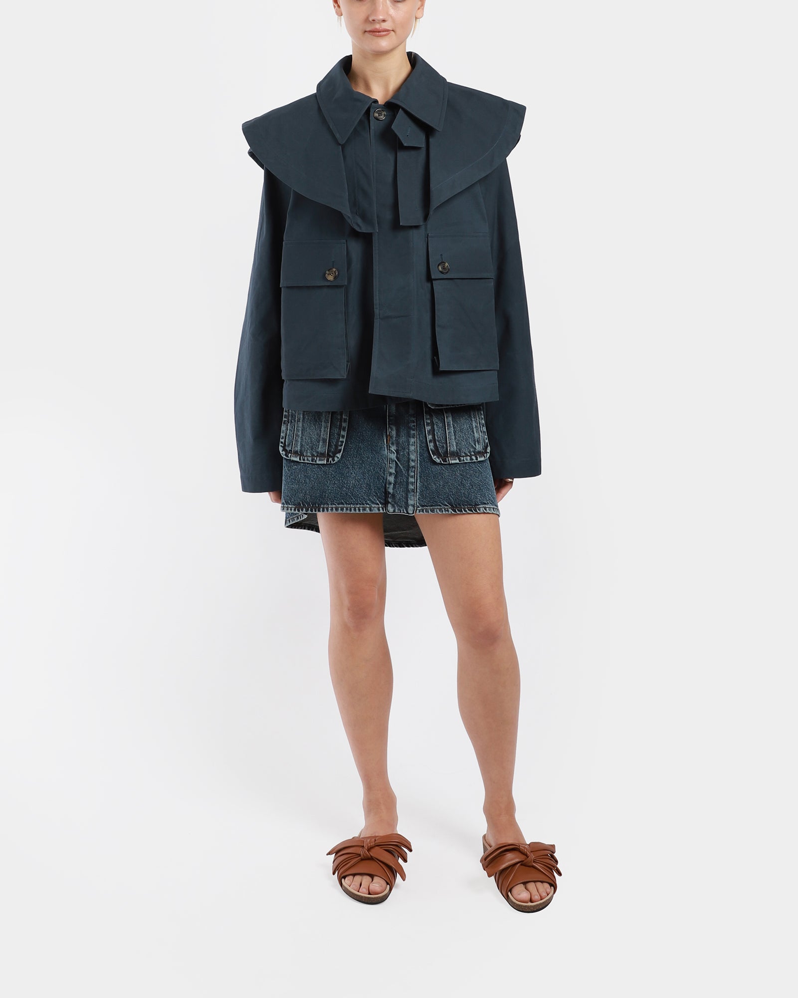 The Waxed Cotton Jacket is made from waxed cotton, which brings a unique structured texture. It has a relaxed-fit with oversized long sleeve and a cape style overlay on the shoulders. The spread collar converts to funnel neck with button to secure. It has concealed horn button closure at front, two large flap pockets with buttons to close on the side and is unlined.