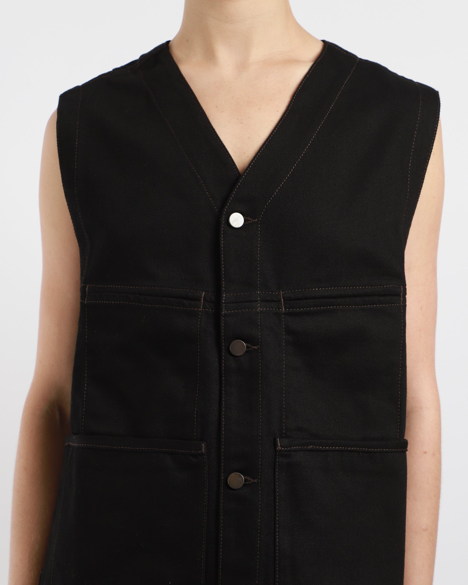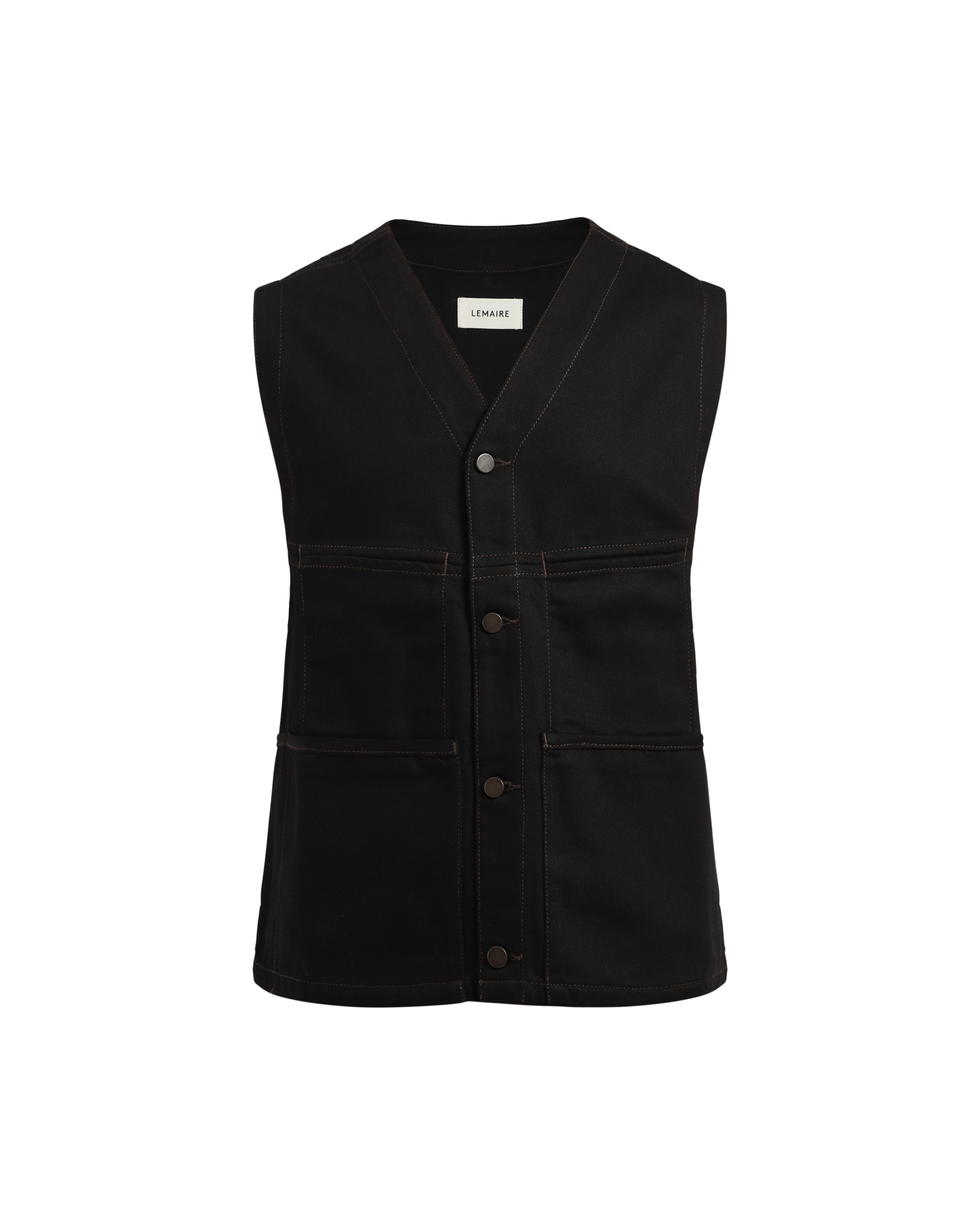 This Sleeveless Gilet is made of a classic Lemaire fabric with a thick, round hand. Multiple contrast stitching run along the lines of this utility-inspired V-neck silhouette closing with four denim-style metal buttons. There are six front pockets at the front and waist adjusters at the back.