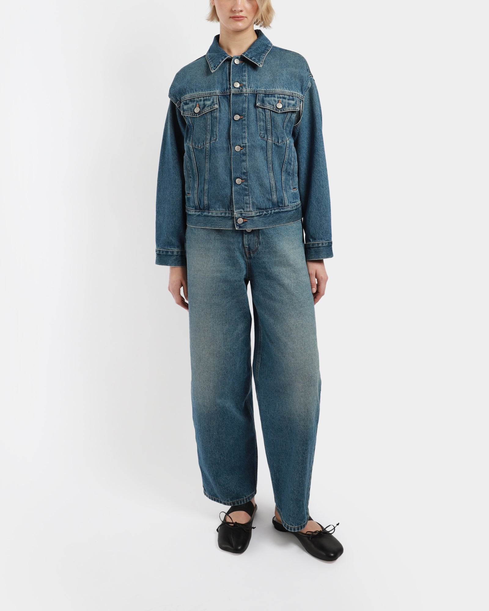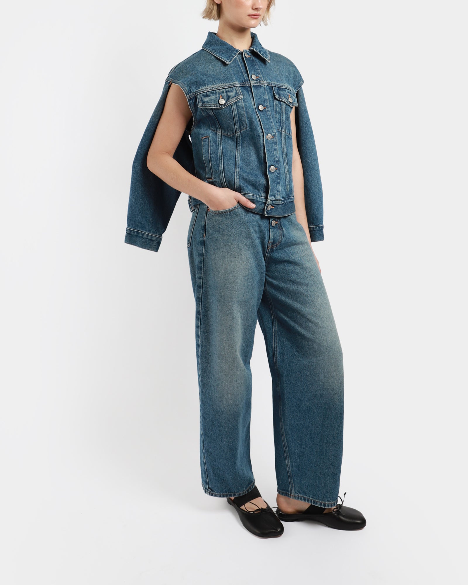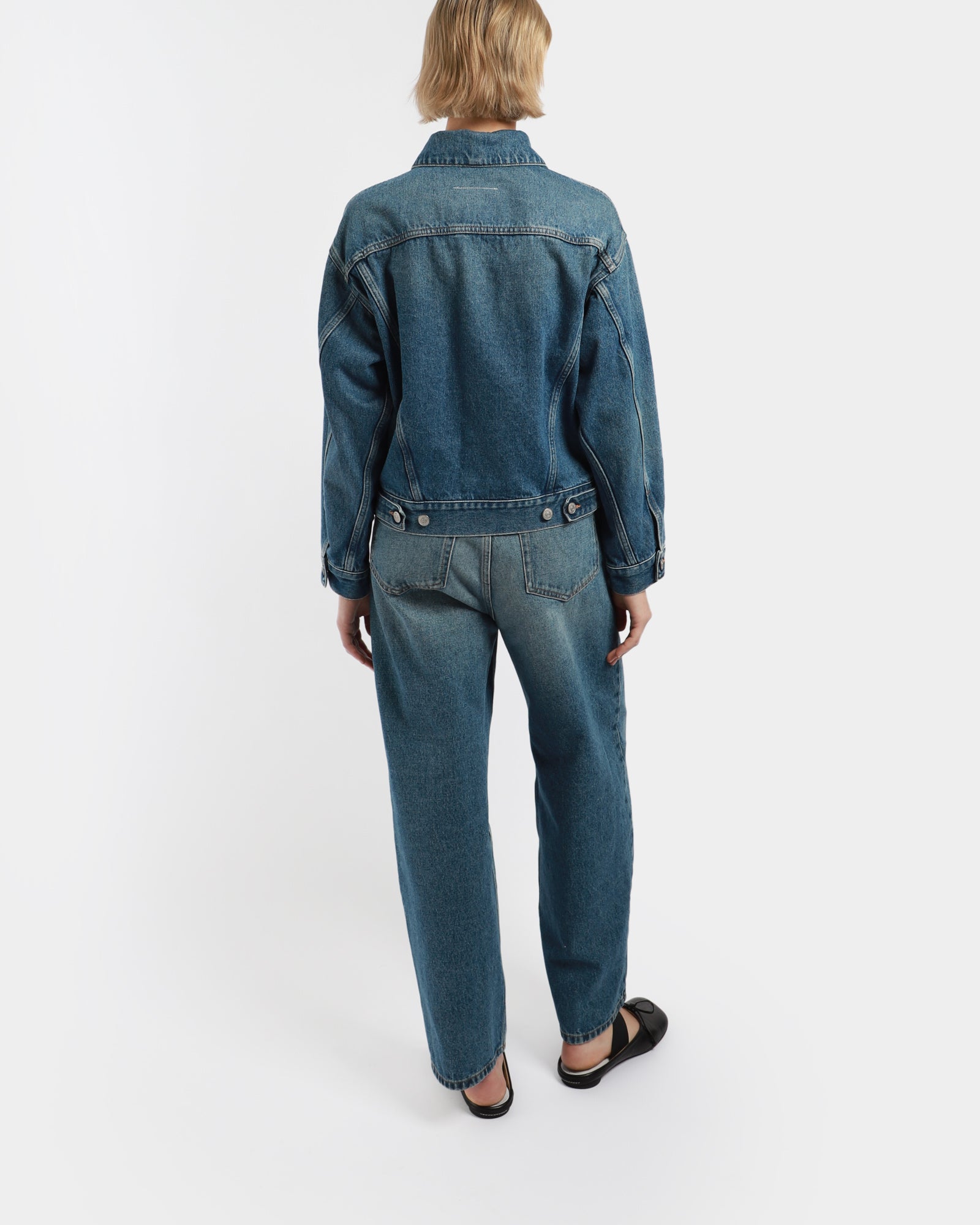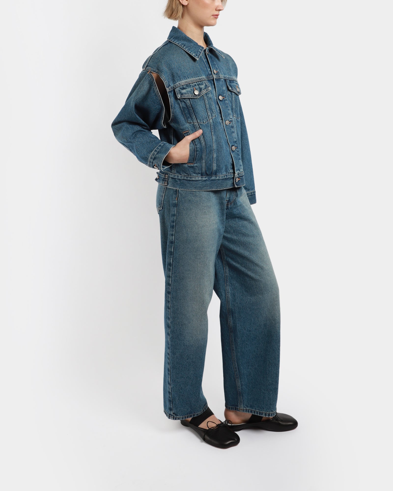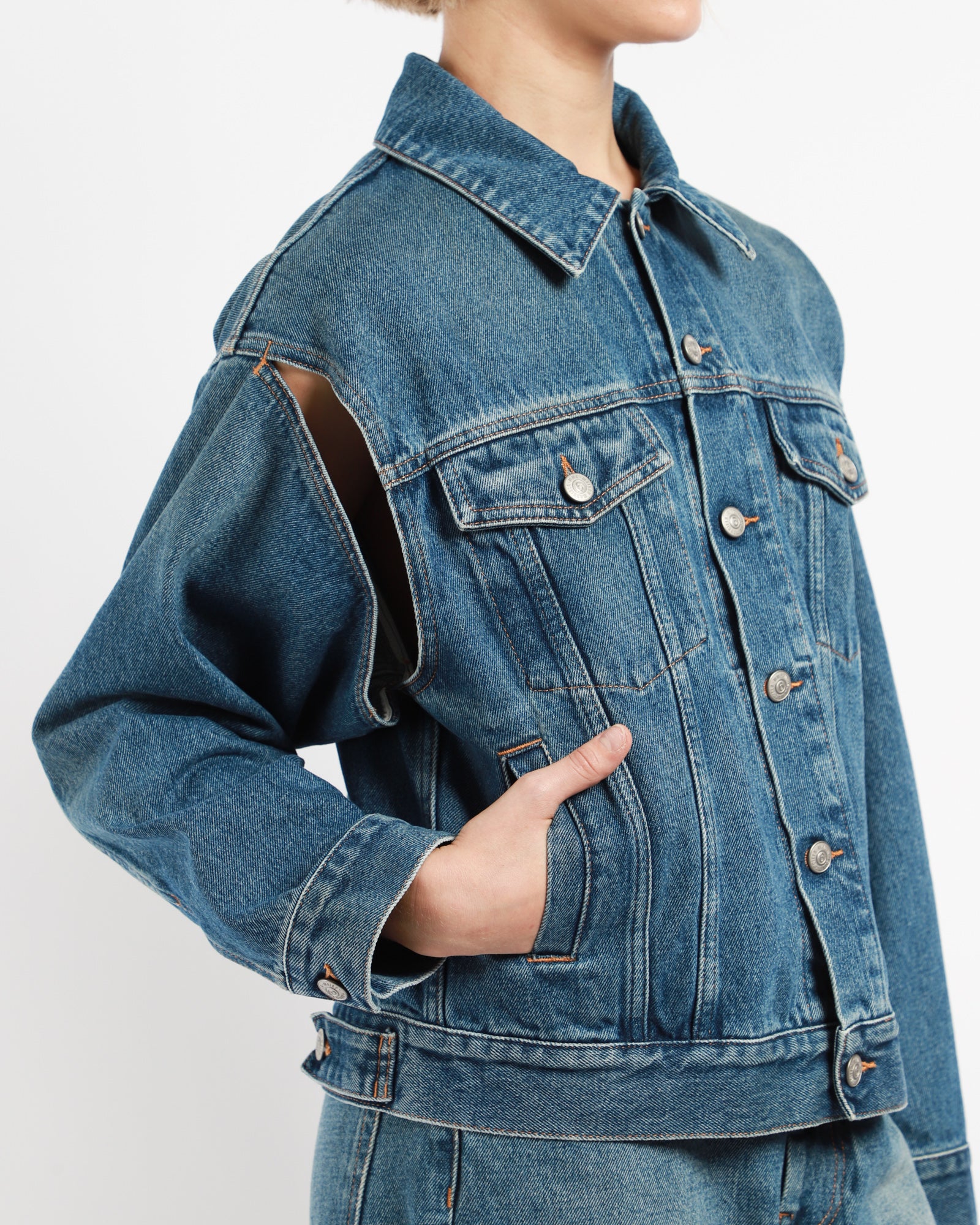 MM6's blue denim jacket features open armhole detailing, a buttoned closure and cuffs, four pockets at the front, and adjustable waist tabs. It is finished with a vintage treatment.