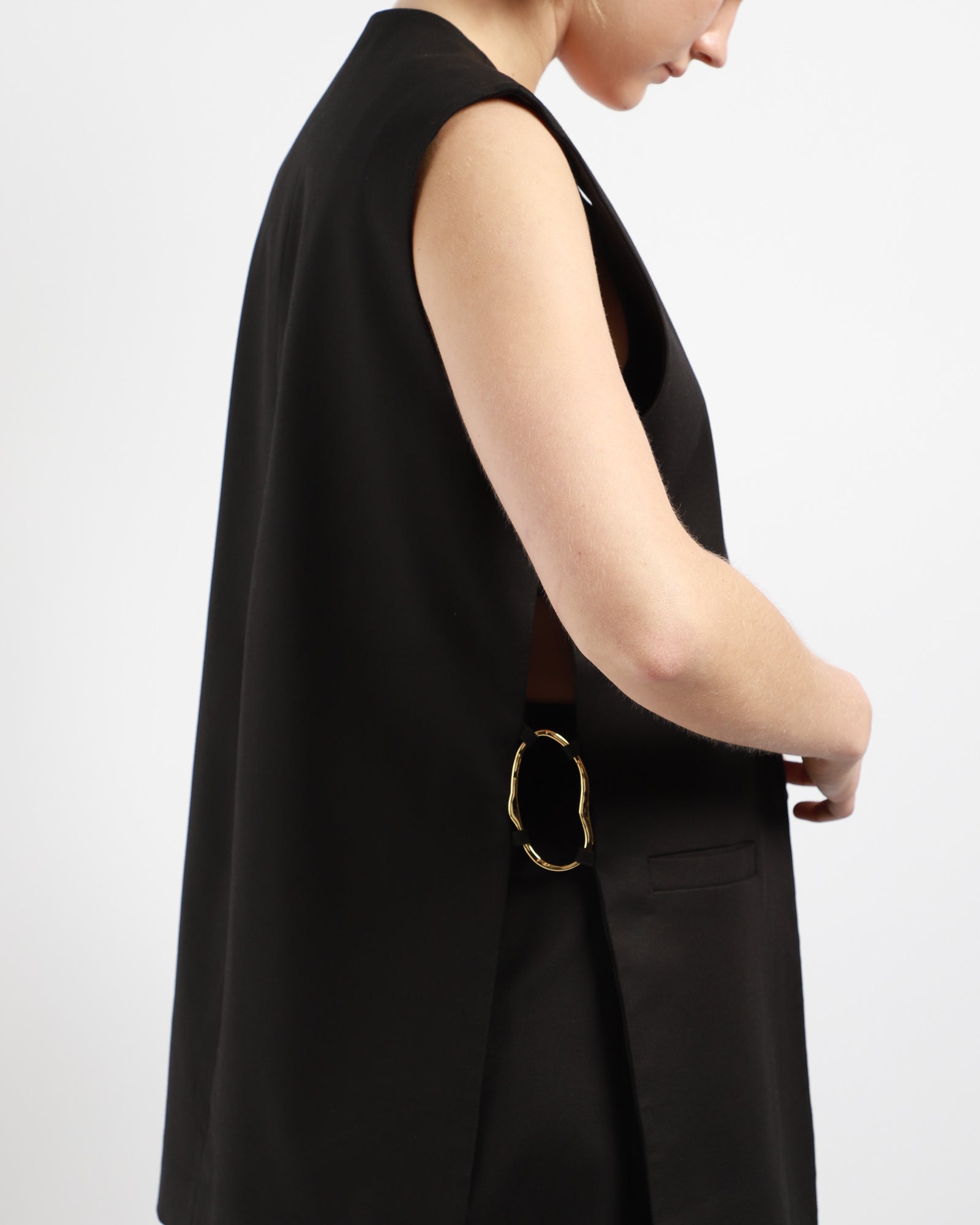 This oversized waistcoat features deep side slits and elegant gold rings on the sides, complemented by two front pockets and a single snap button closure. Crafted from sustainable and organic fabrics, it combines style with eco-friendly materials.