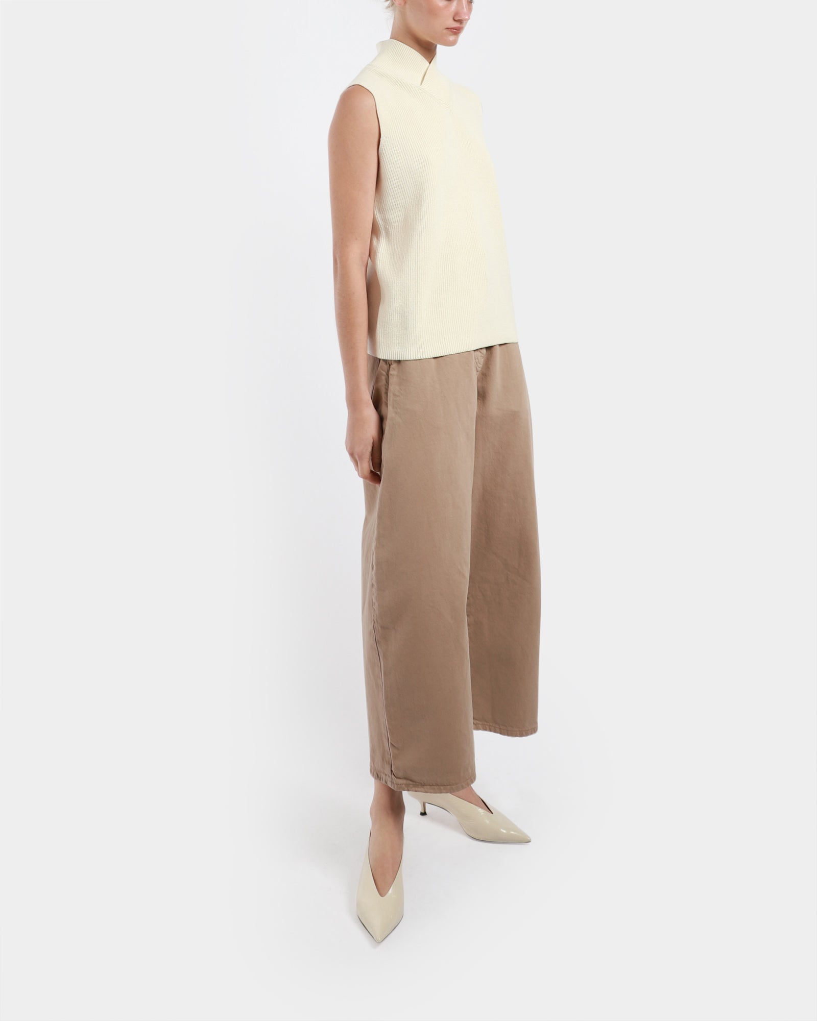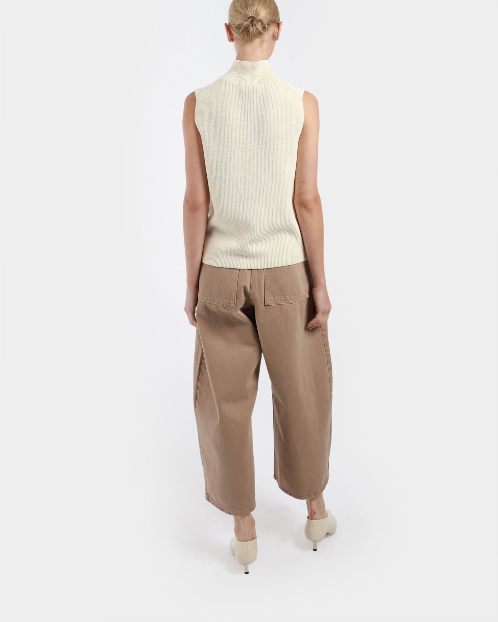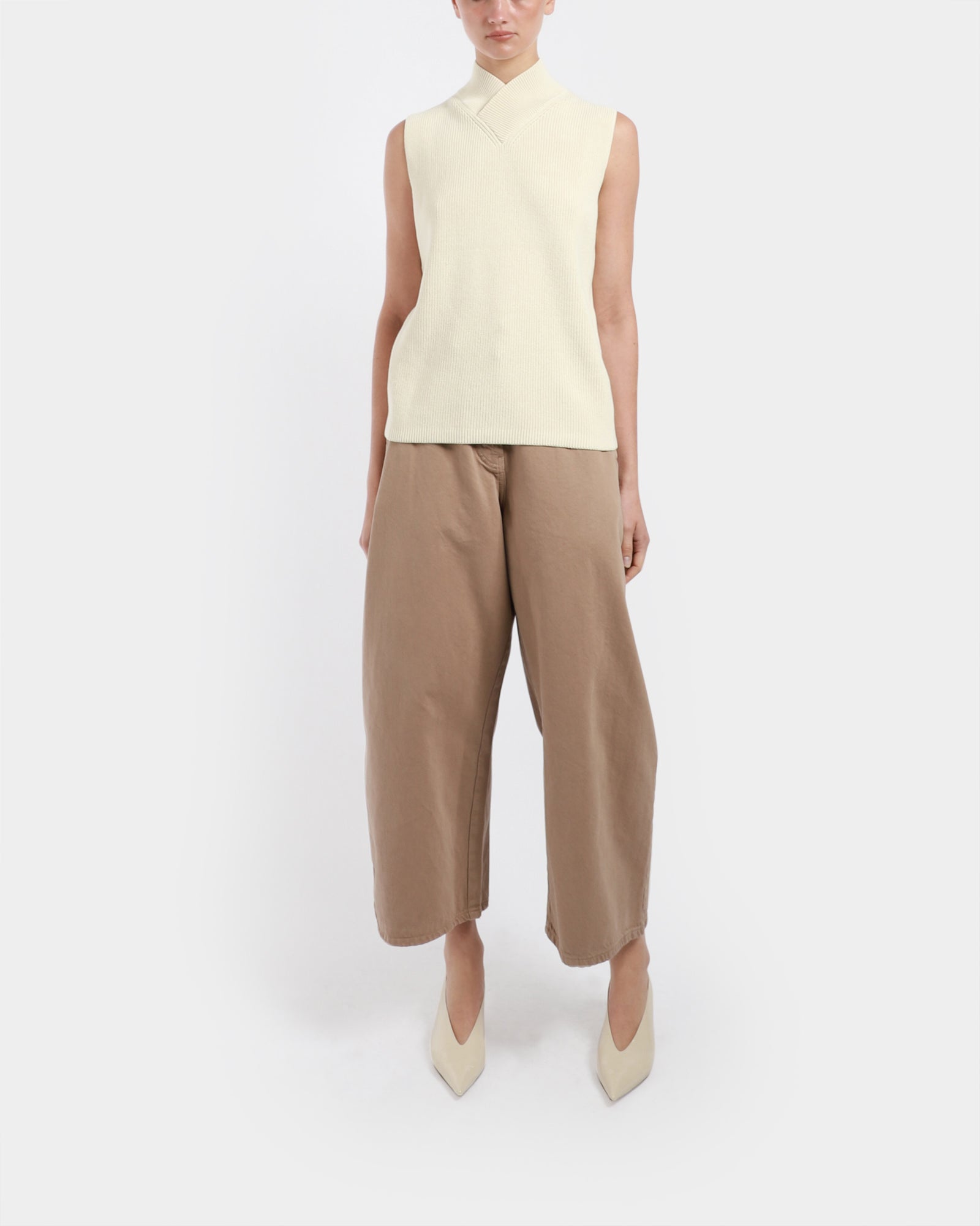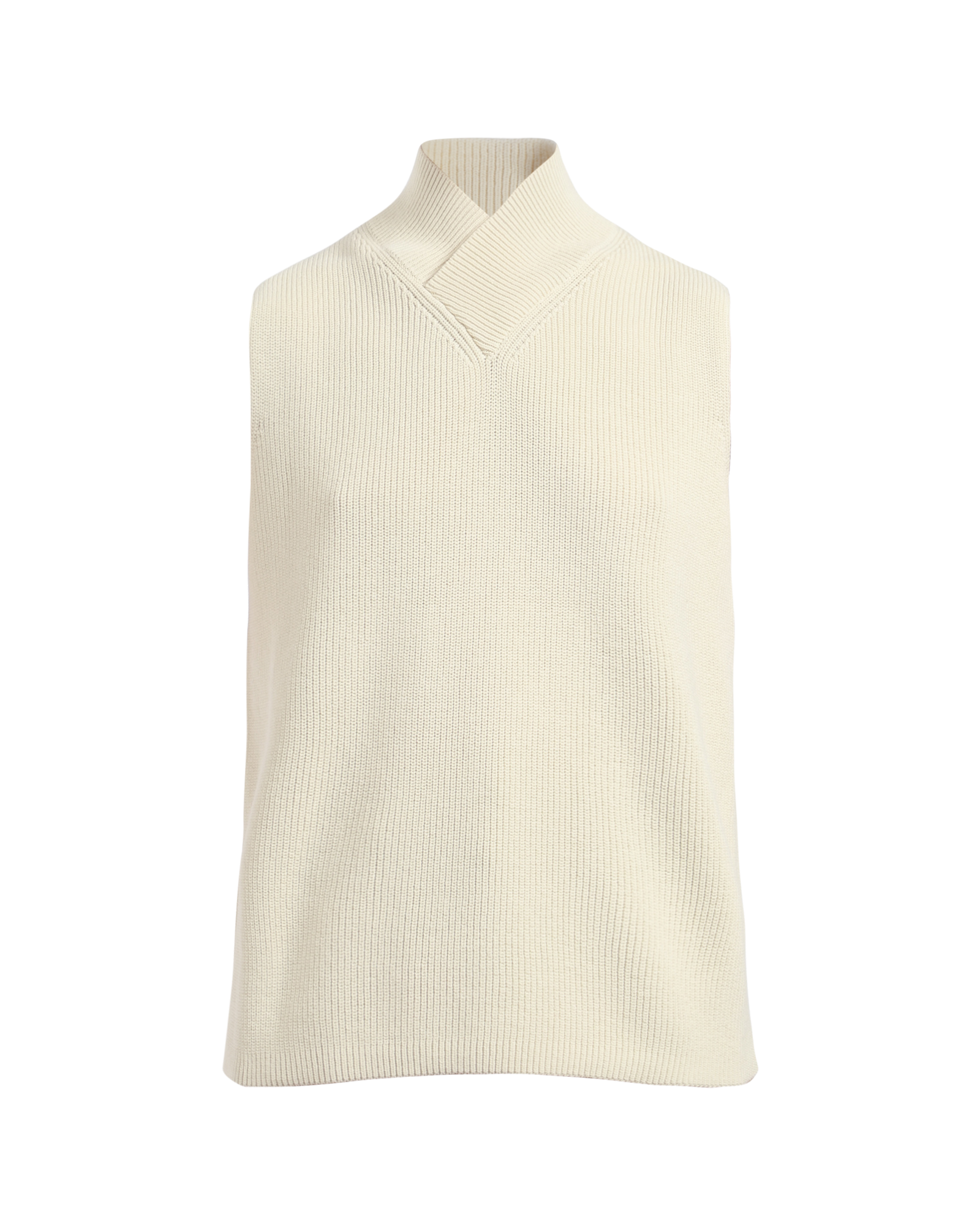The Ceres Knit Vest is crafted from cotton, featuring a high V-neckline, a sleeveless silhouette, and refined rib-knit detailing.