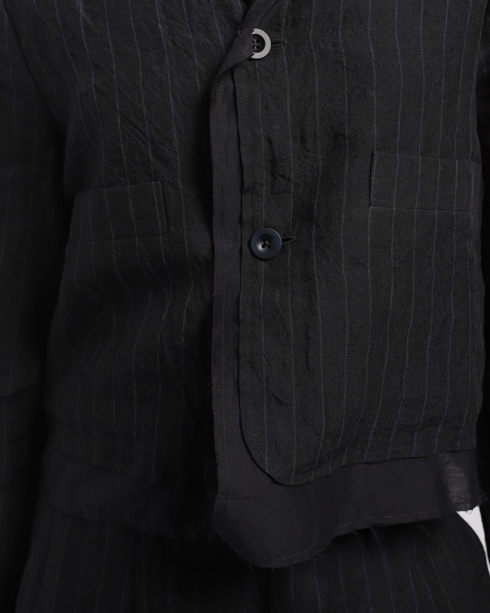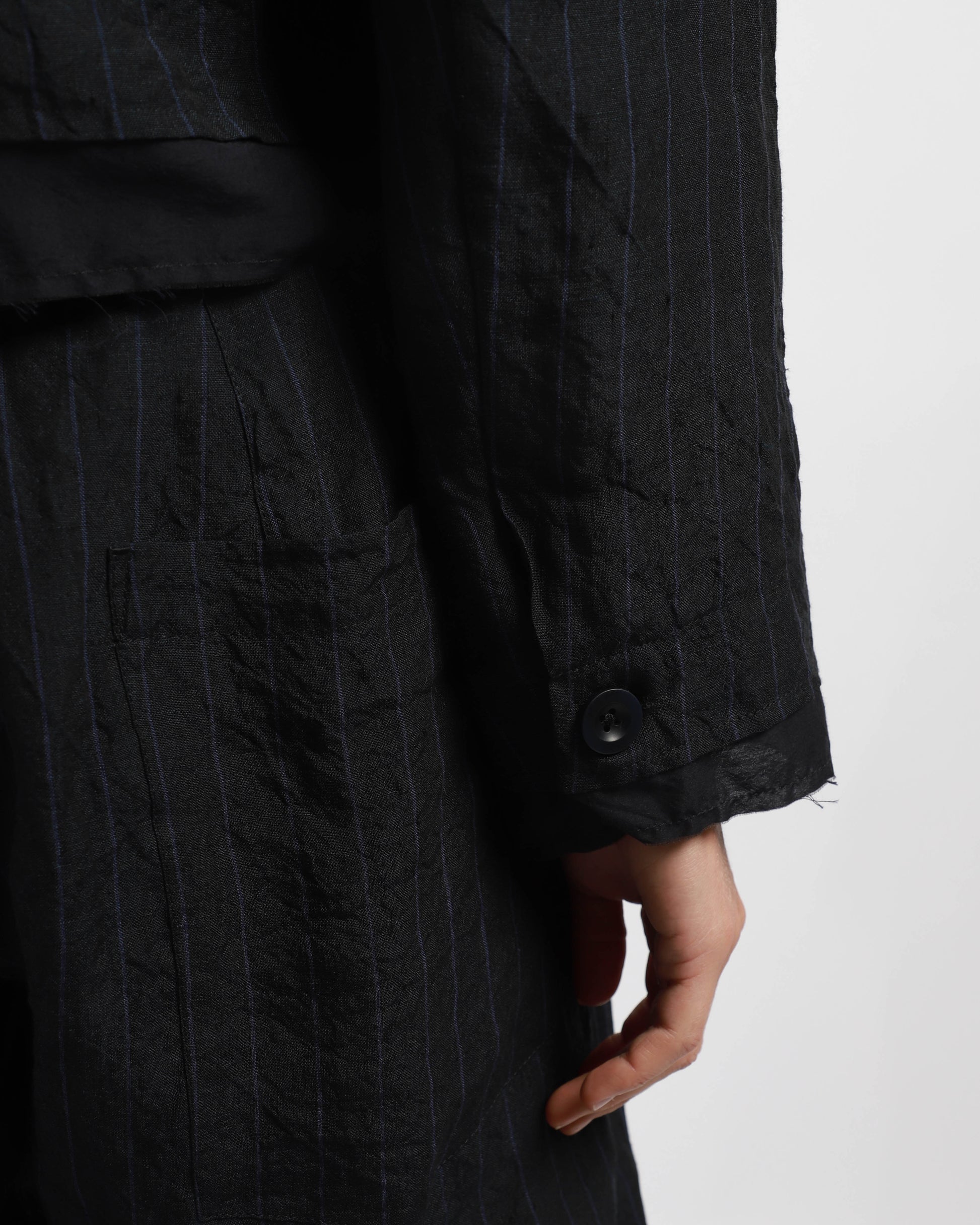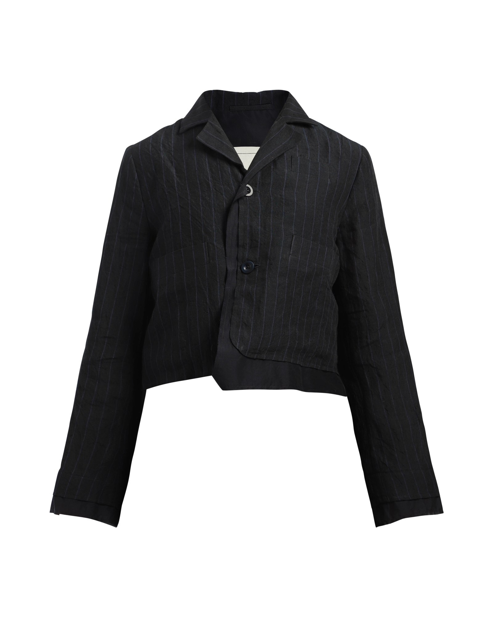 Crafted from linen, the Potter jacket is inspired by the traditional striped aprons of the Butcher's trade. It offers a cropped and fitted silhouette, raw edge detailing around body and cuff. The garment has a subtle open collar with two buttons to close and two pockets at front.