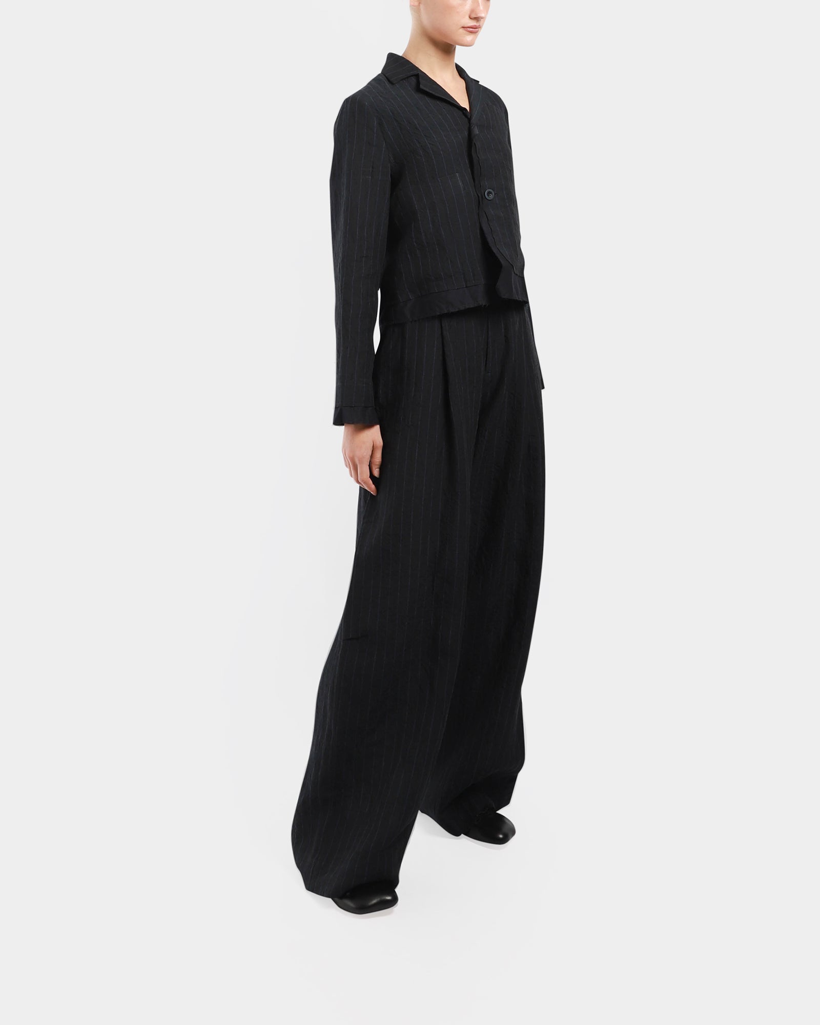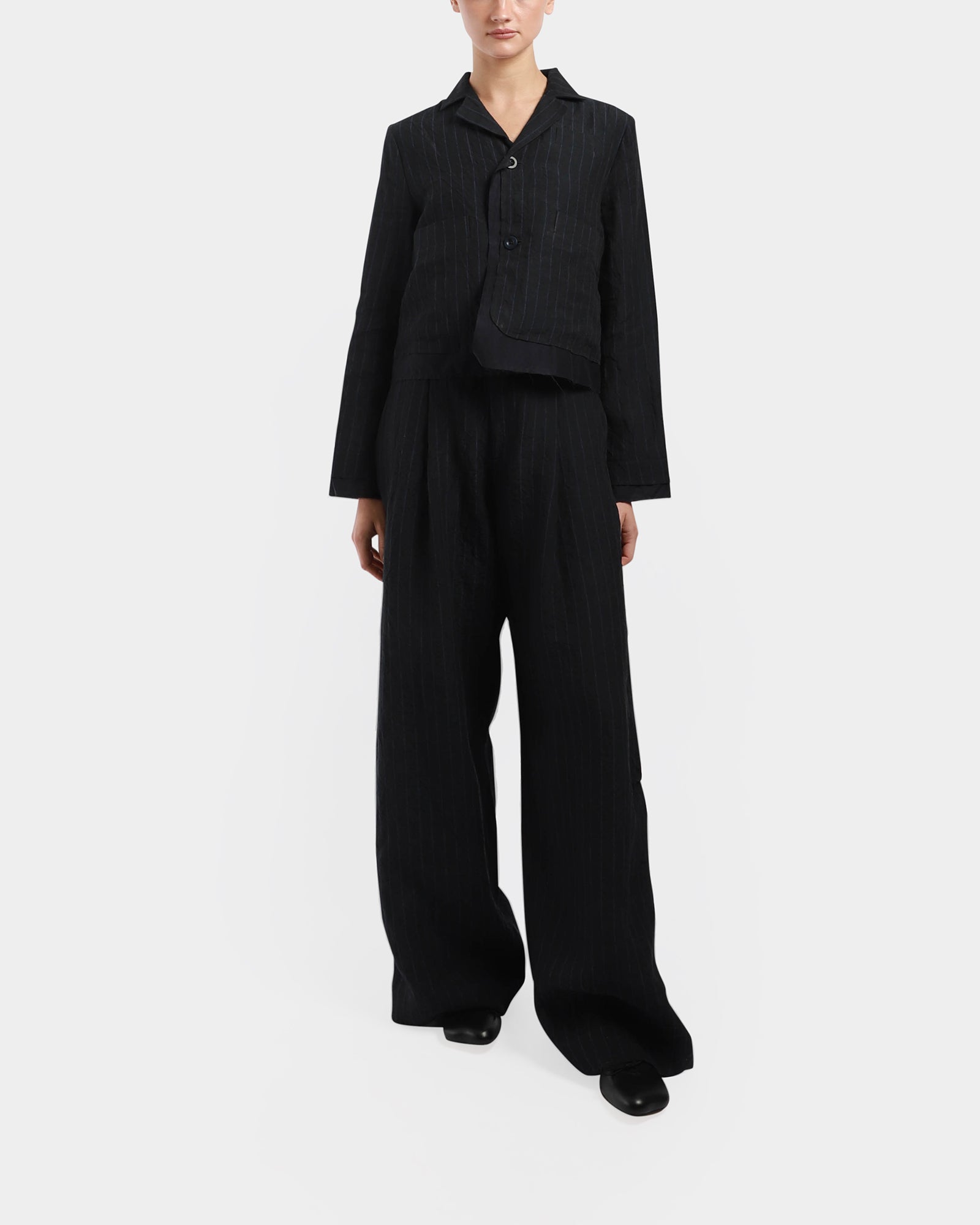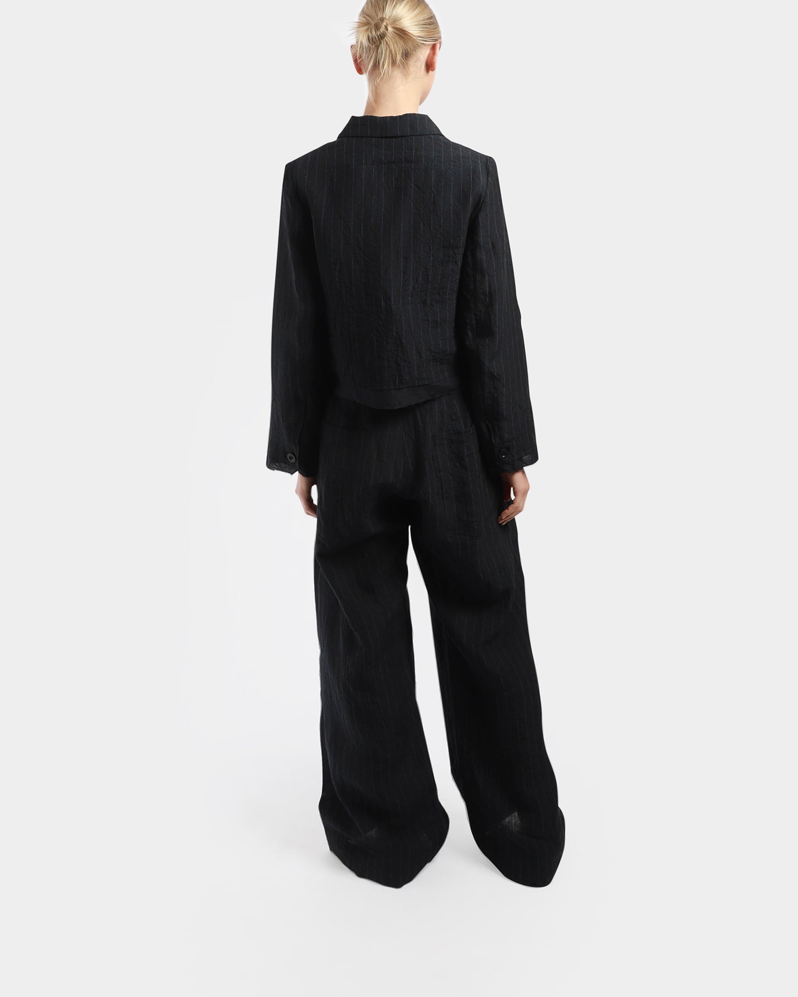 Crafted from linen, the Potter jacket is inspired by the traditional striped aprons of the Butcher's trade. It offers a cropped and fitted silhouette, raw edge detailing around body and cuff. The garment has a subtle open collar with two buttons to close and two pockets at front.