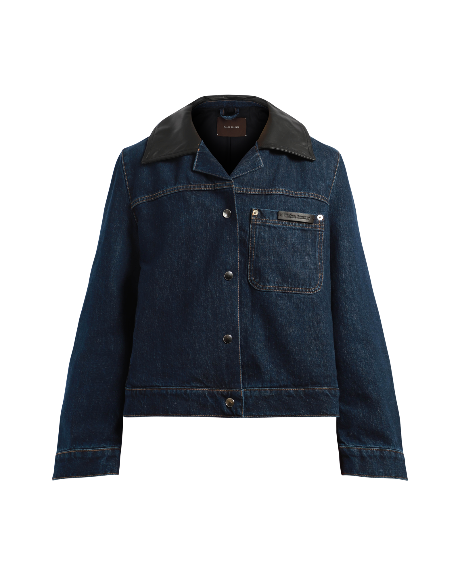 A cropped denim jacket, embellished with leather oversized collar detail. It features press-stud at front to close, wide long sleeves, seam side pockets and chest pocket with leather logo patch, single press-stud at cuffs and full twill lining. Made in Portugal.
