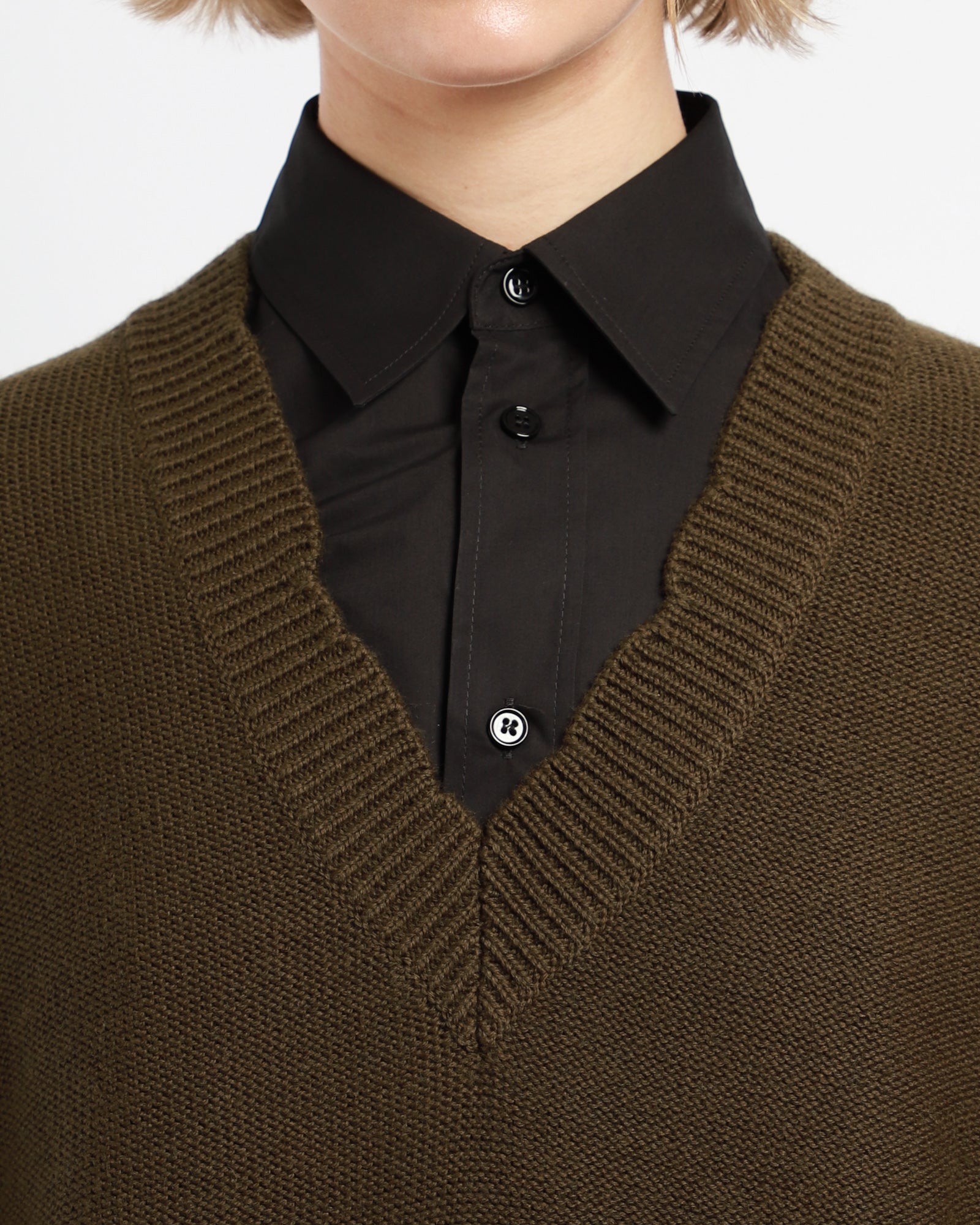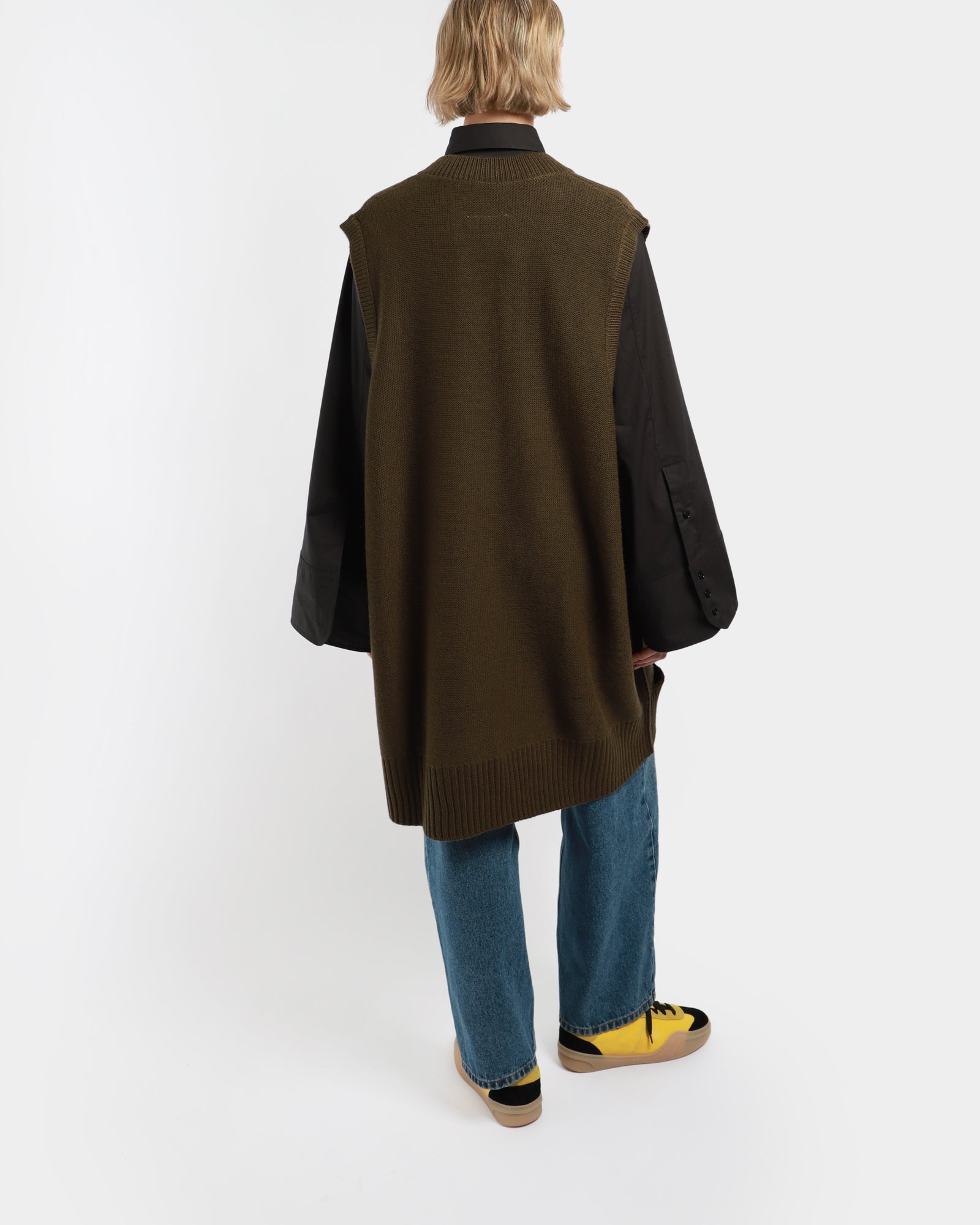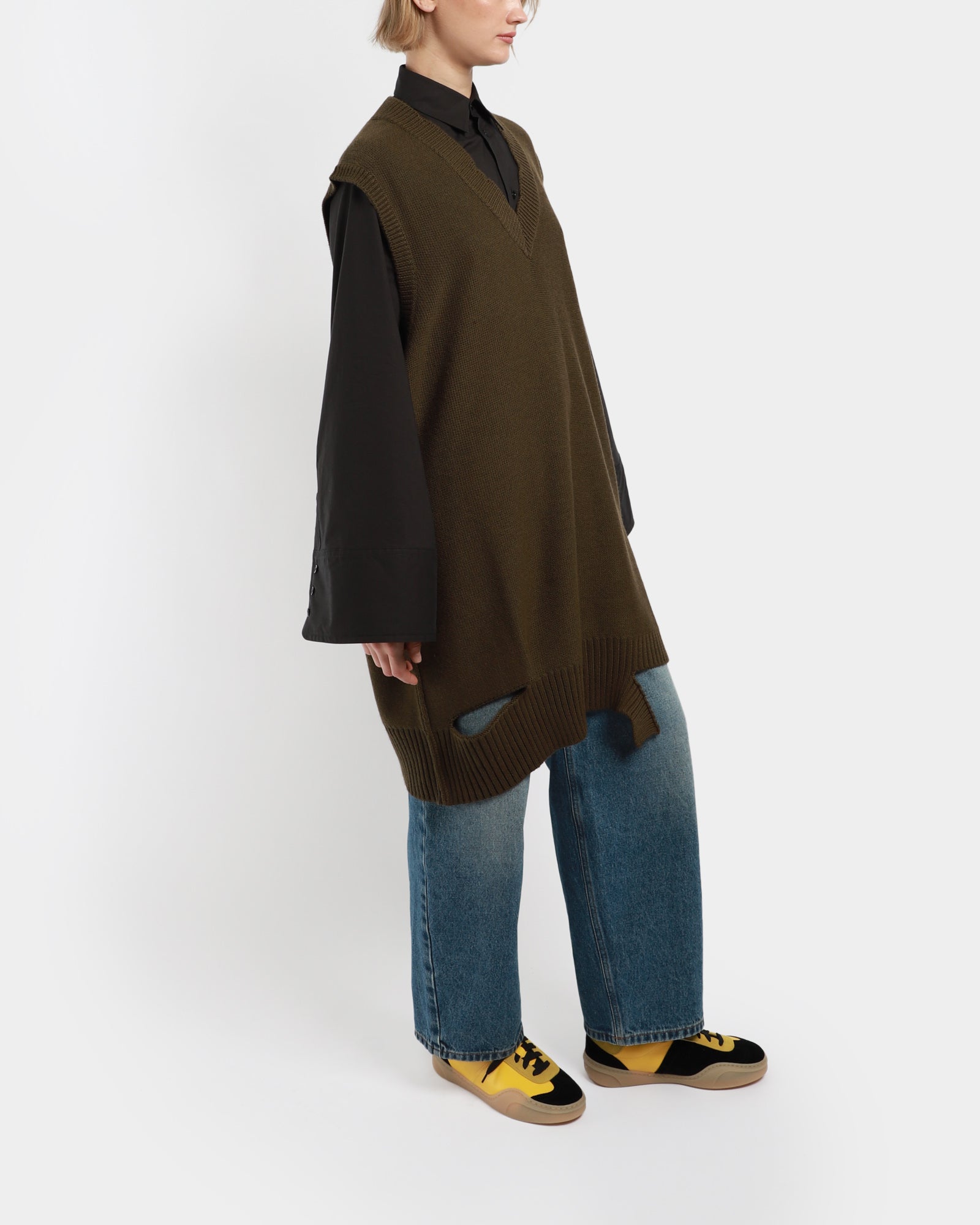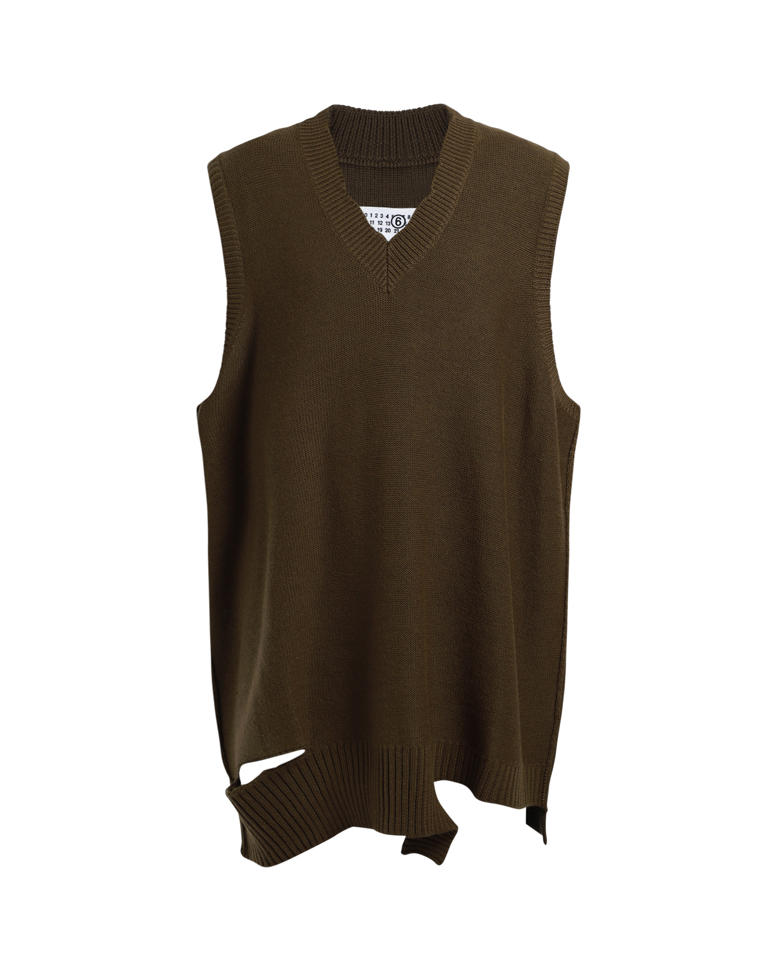 This knit vest is designed for a slightly oversized fit. It is sleeveless, with a ribbed V-neckline and a deconstructed ribbed hemline.