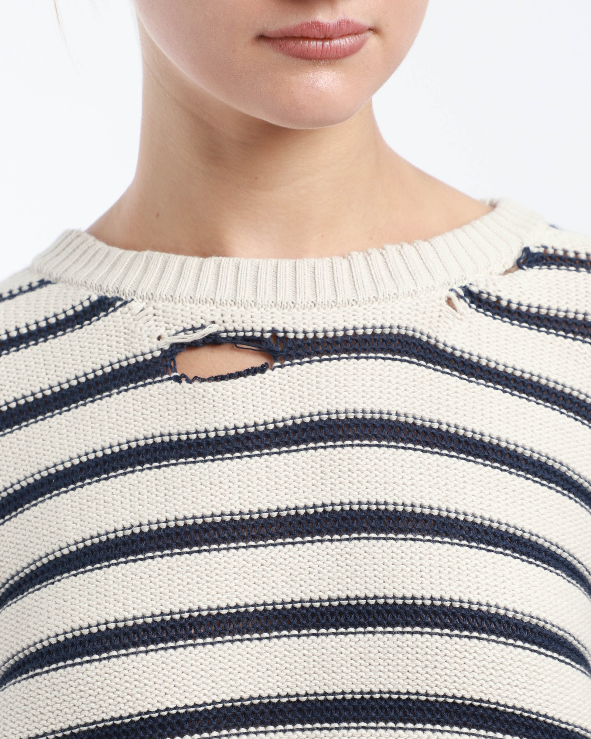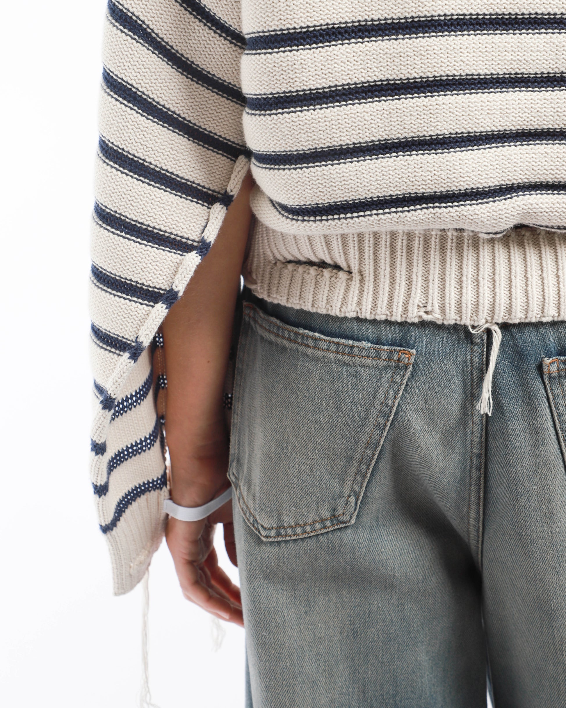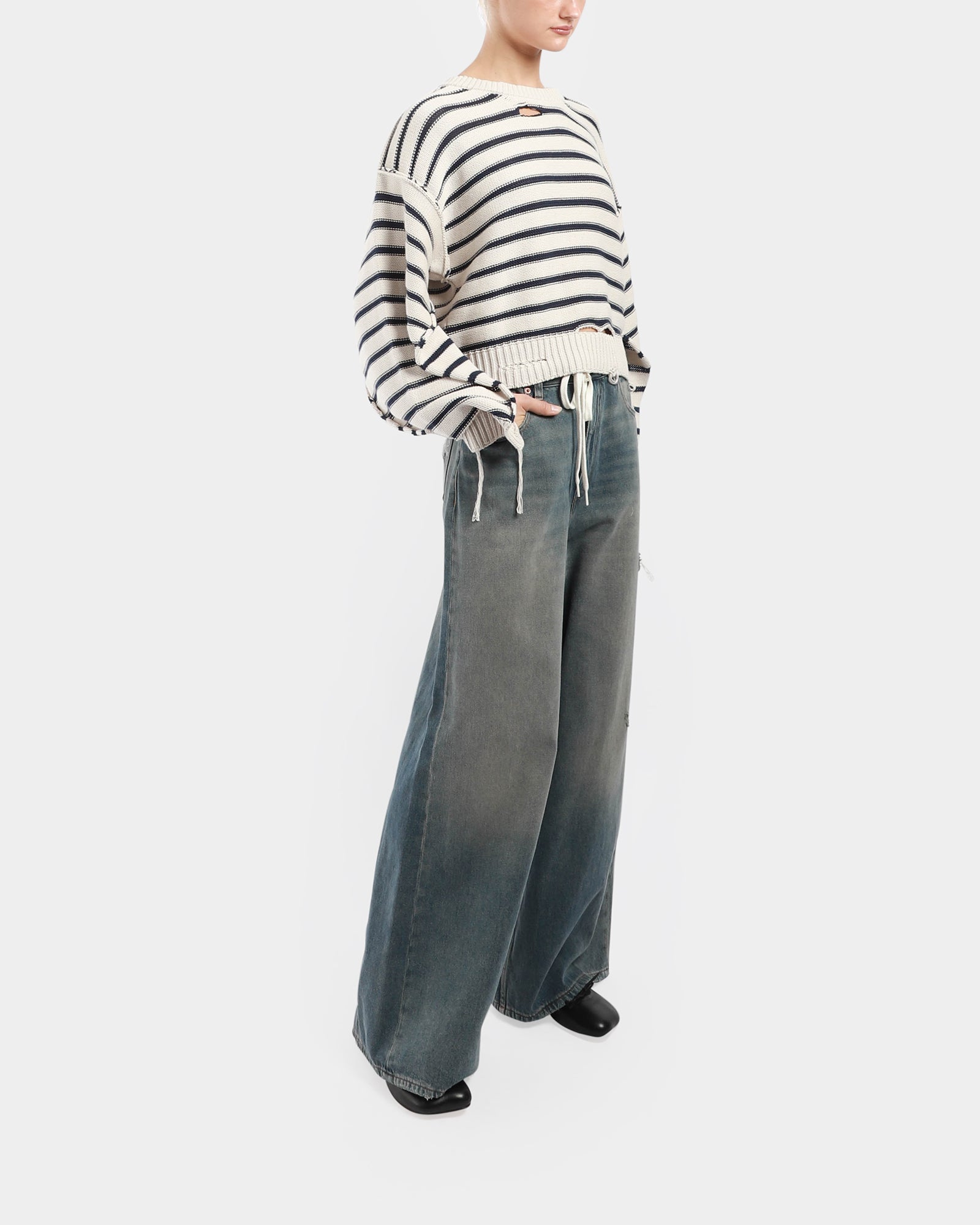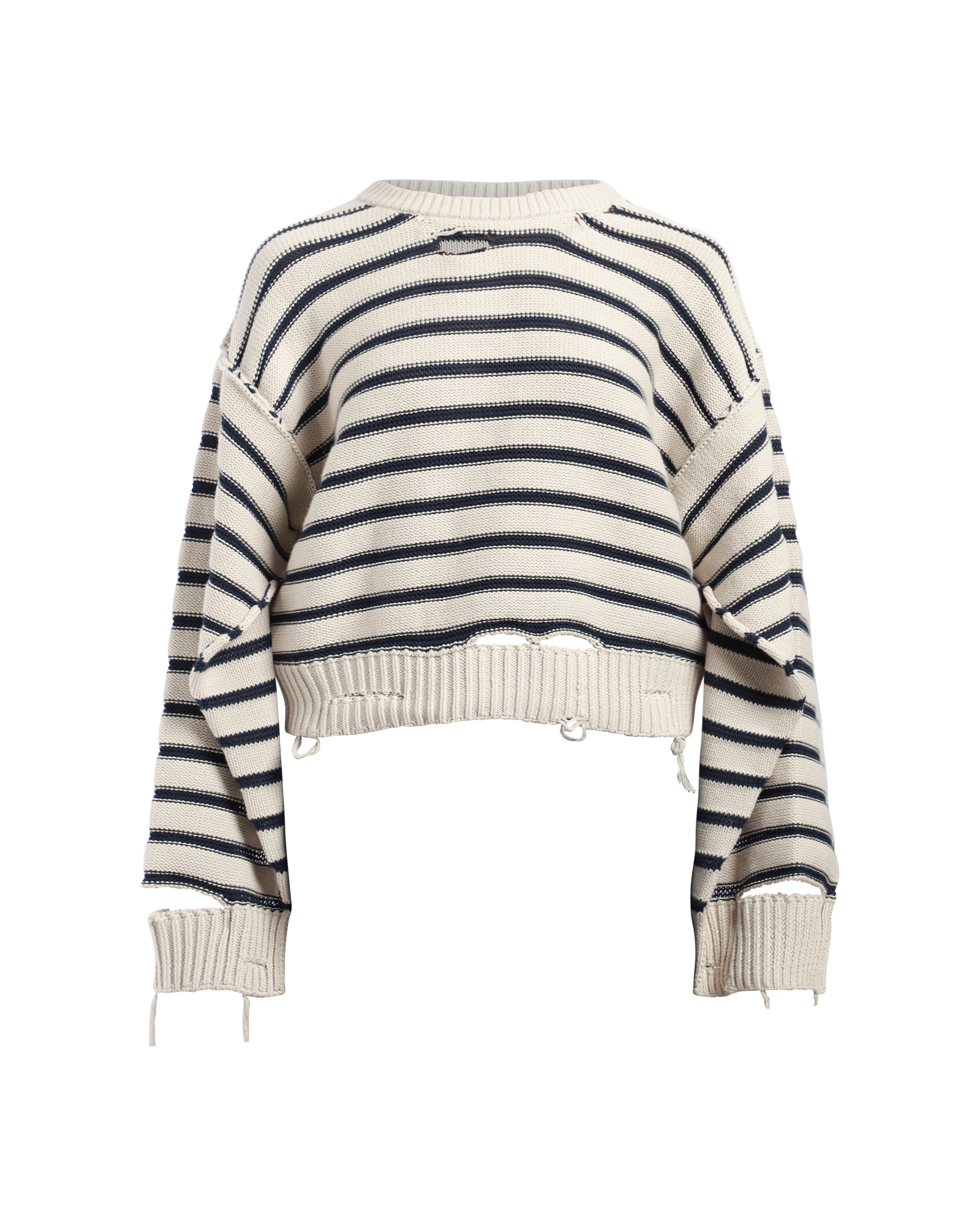 A distressed jumper, featuring a rib-knit crew neckline, a cropped hem and cuffs. It has dropped shoulders, a slit at inner sleeves and the classic brand signature white stitching at back collar.