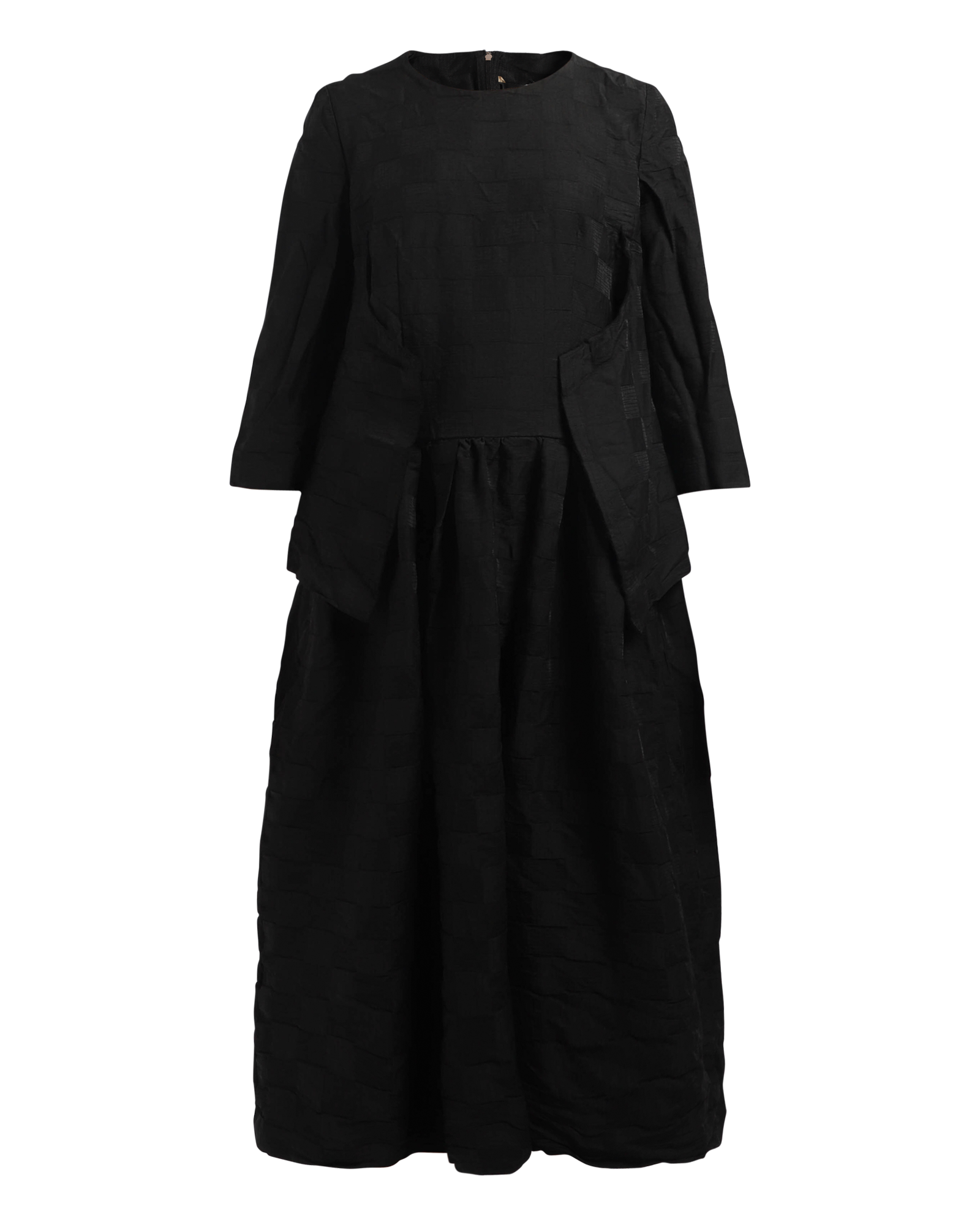 This midi dress features a round neckline, 3/4 long sleeves, flap detail on sides, side pockets.