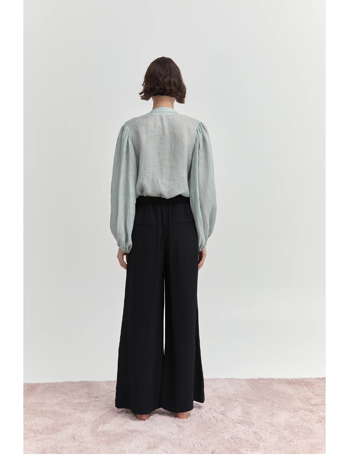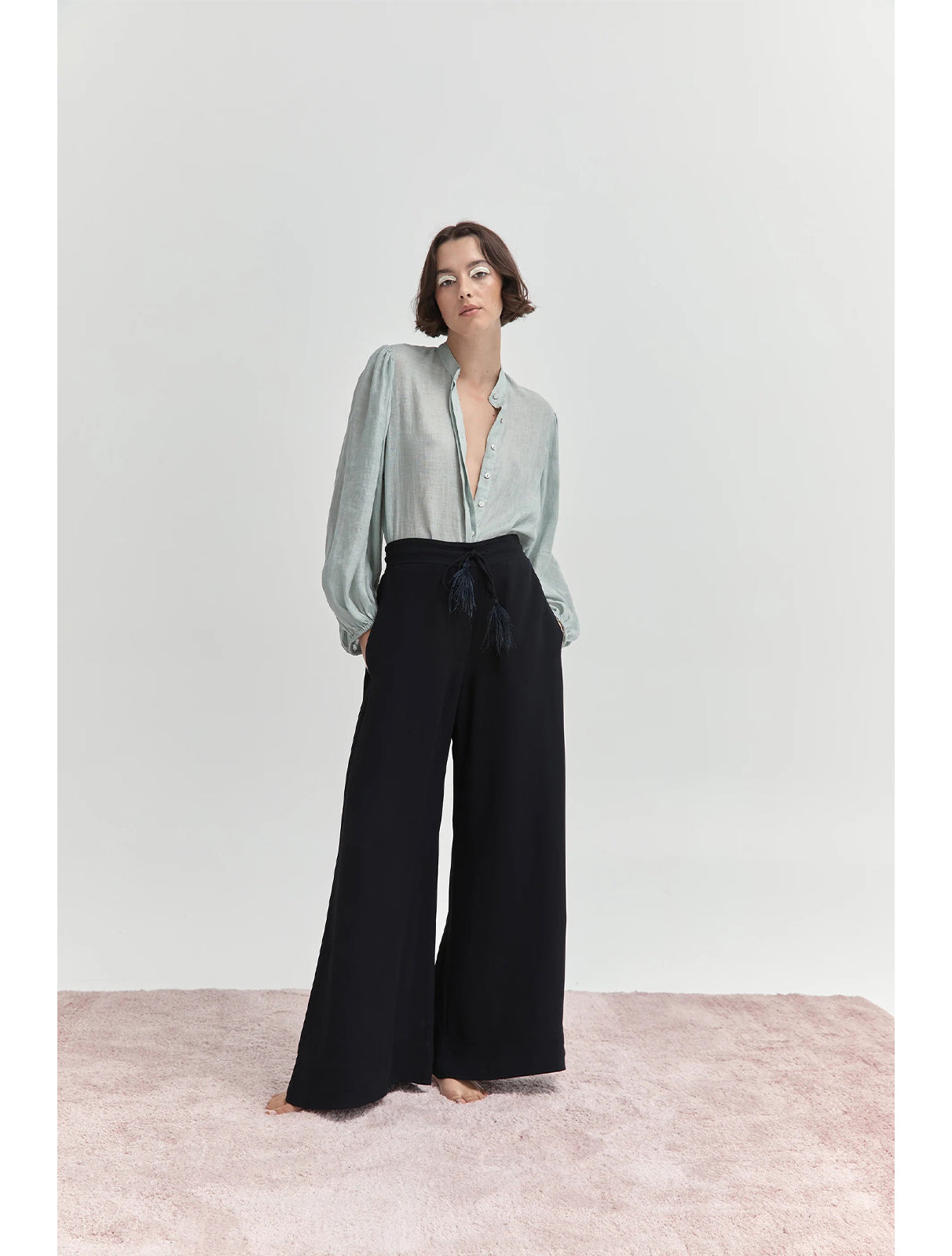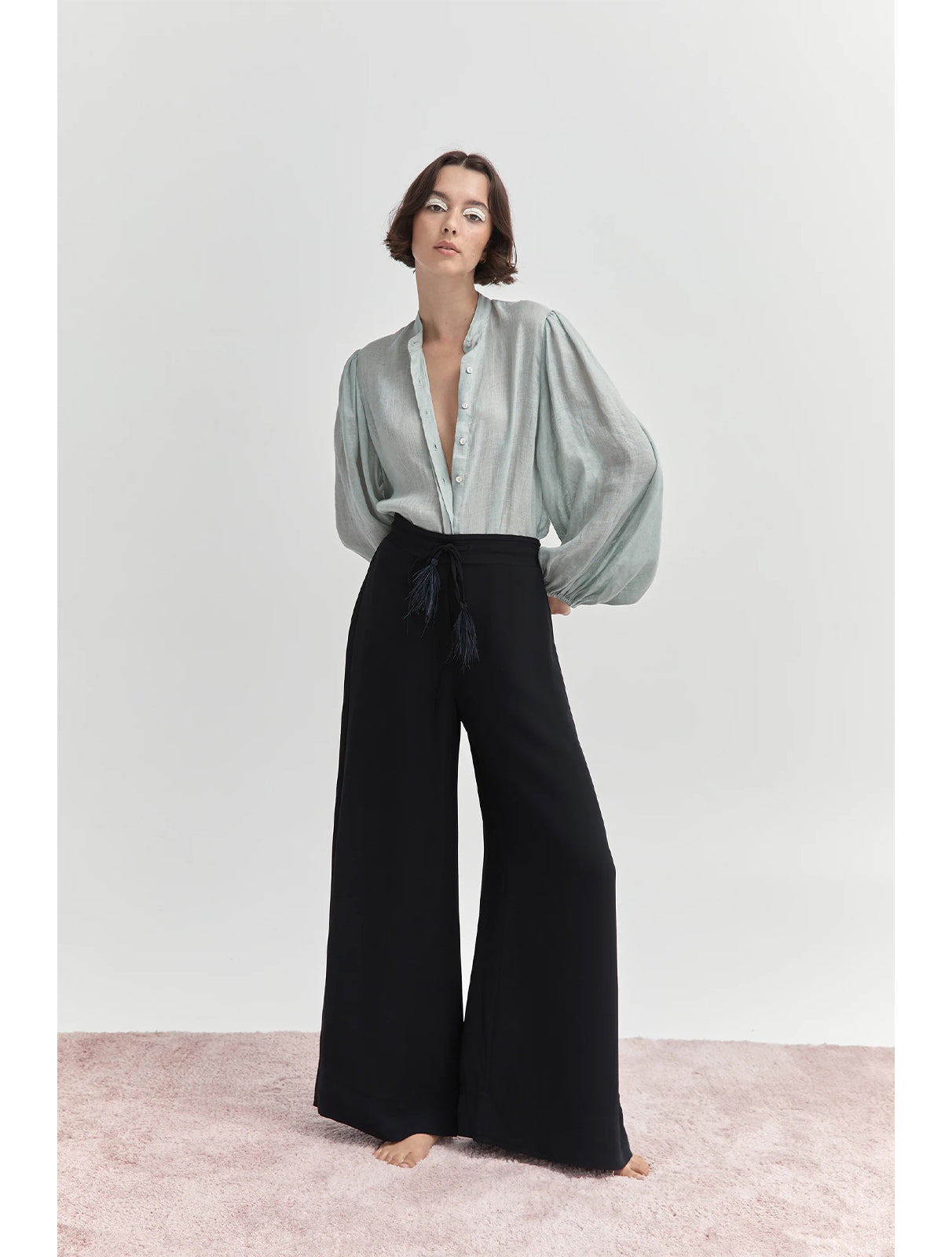 Palazzo style pants from Sarah-Jane Clarke crafted from viscose crepe fabric, featuring a wide legged silhouette, mid-rise waist with ostrich feather embellished drawstring and side and back pockets.
