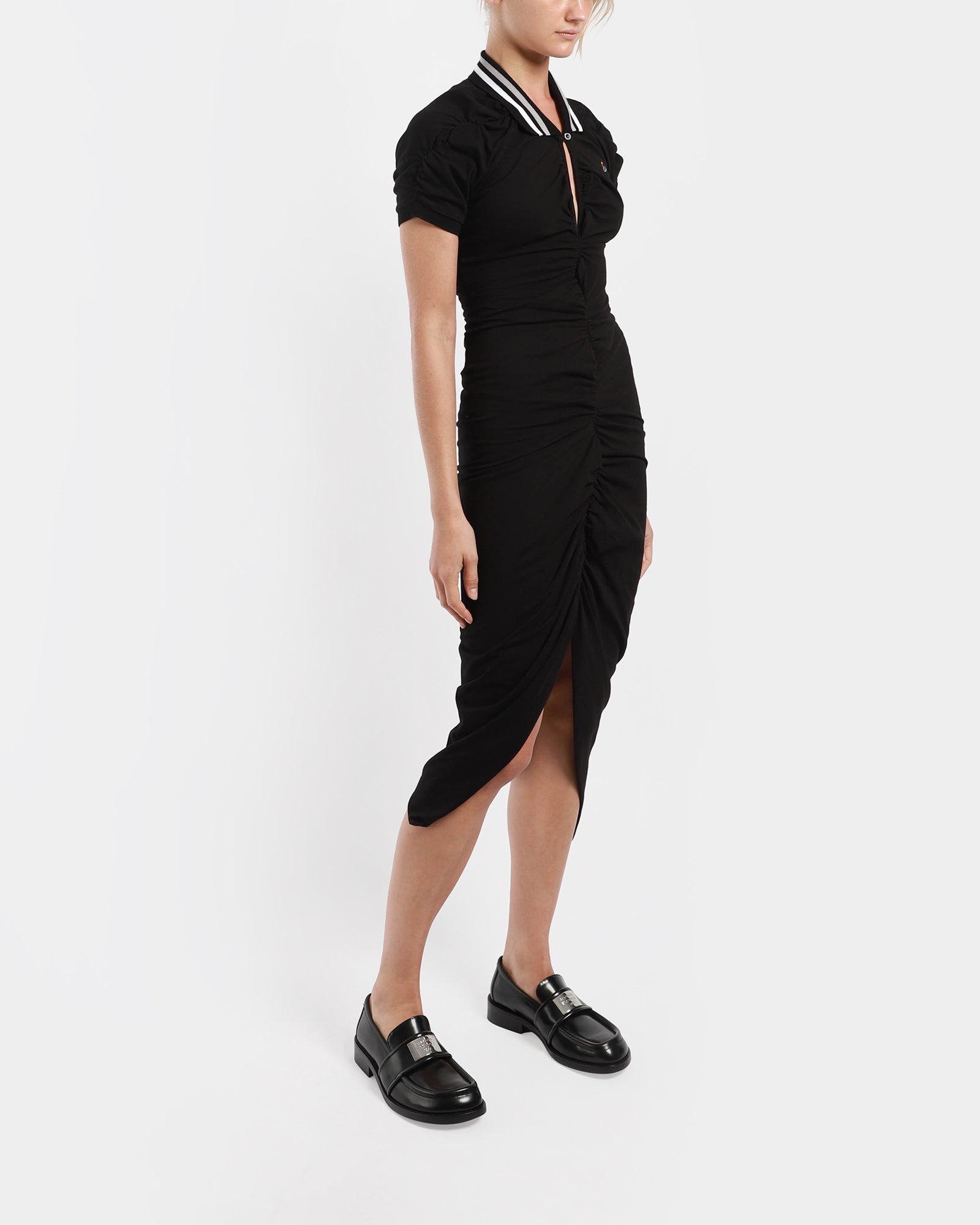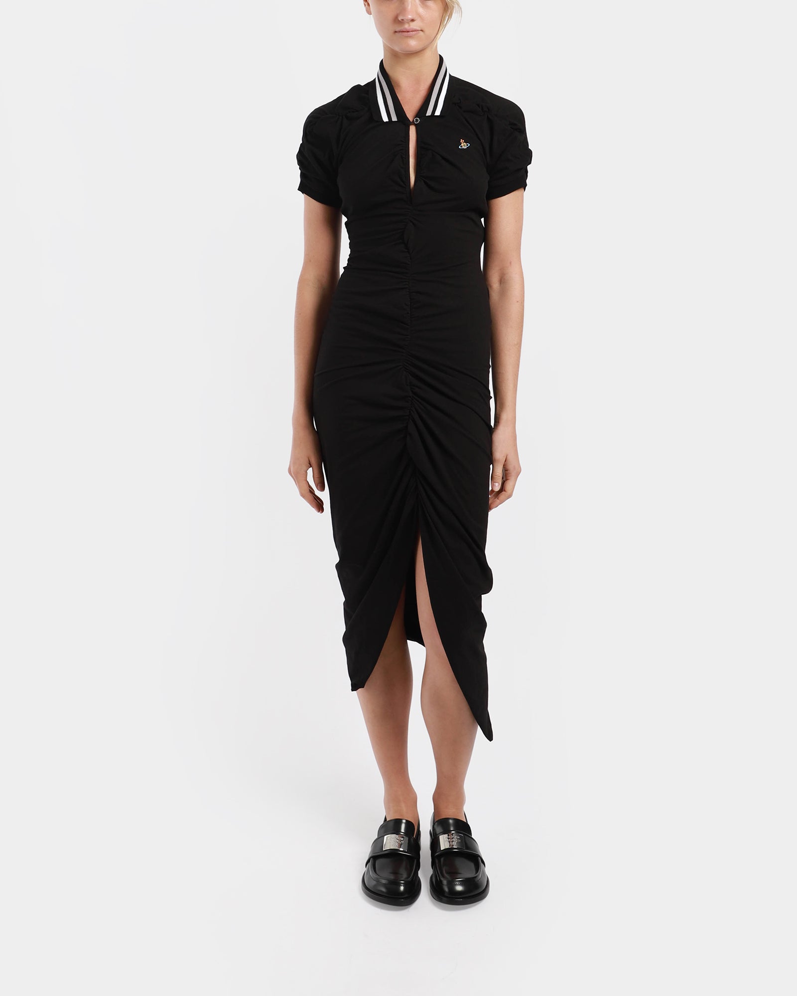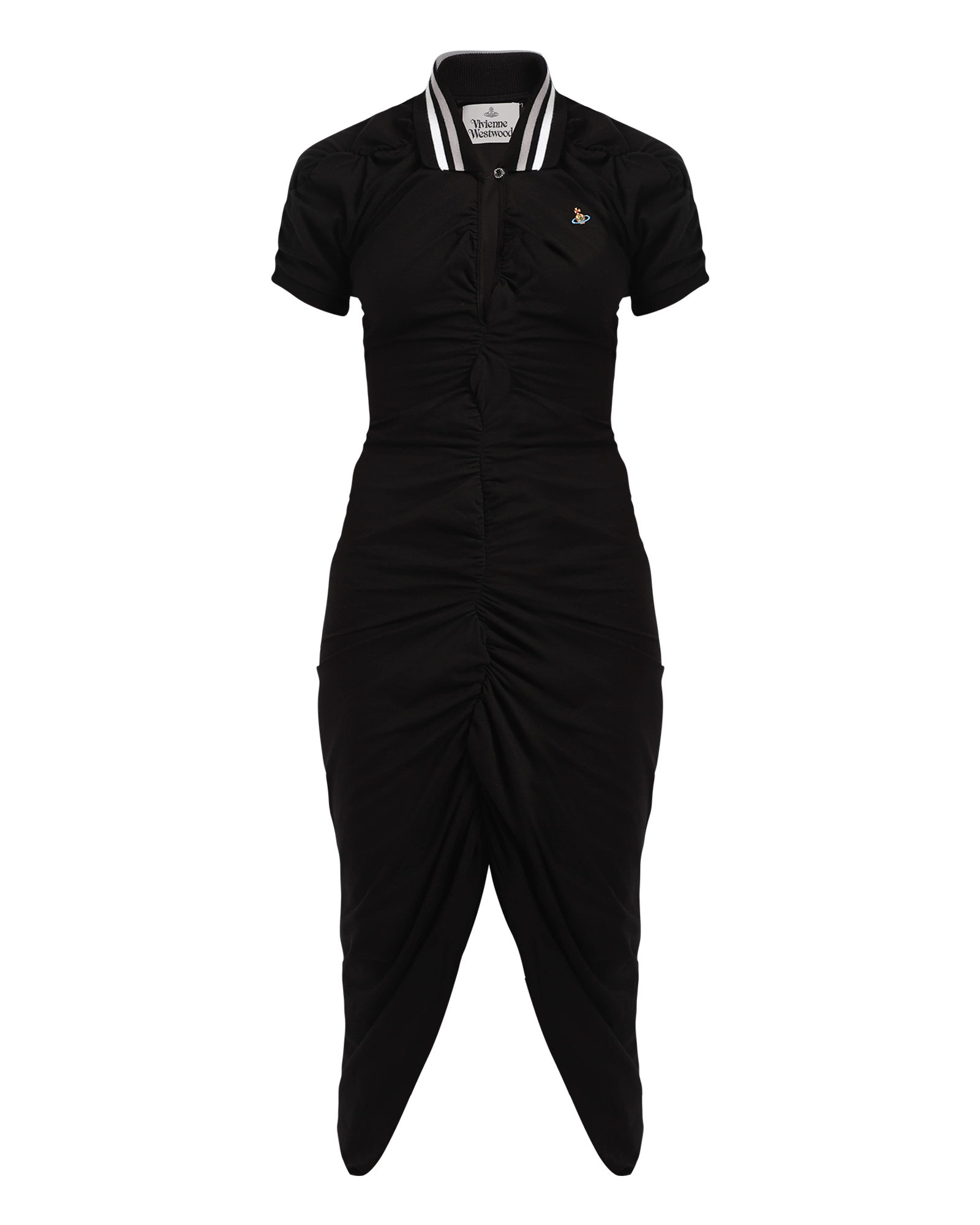 The Pulling dress features elements of Vivienne’s signature 'pulling' pattern-cutting system - where garment elements are draped and gathered. The piece receives slightly puffed shoulders, complete with a multi-coloured orb detail on the chest.