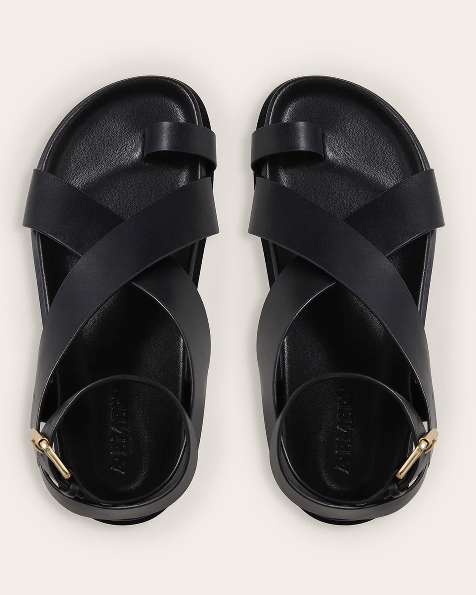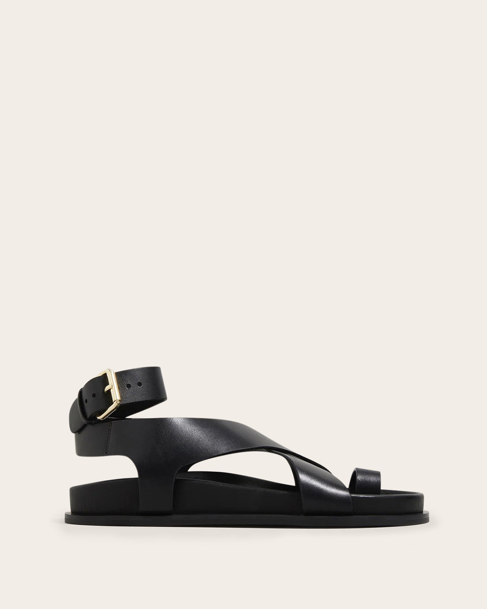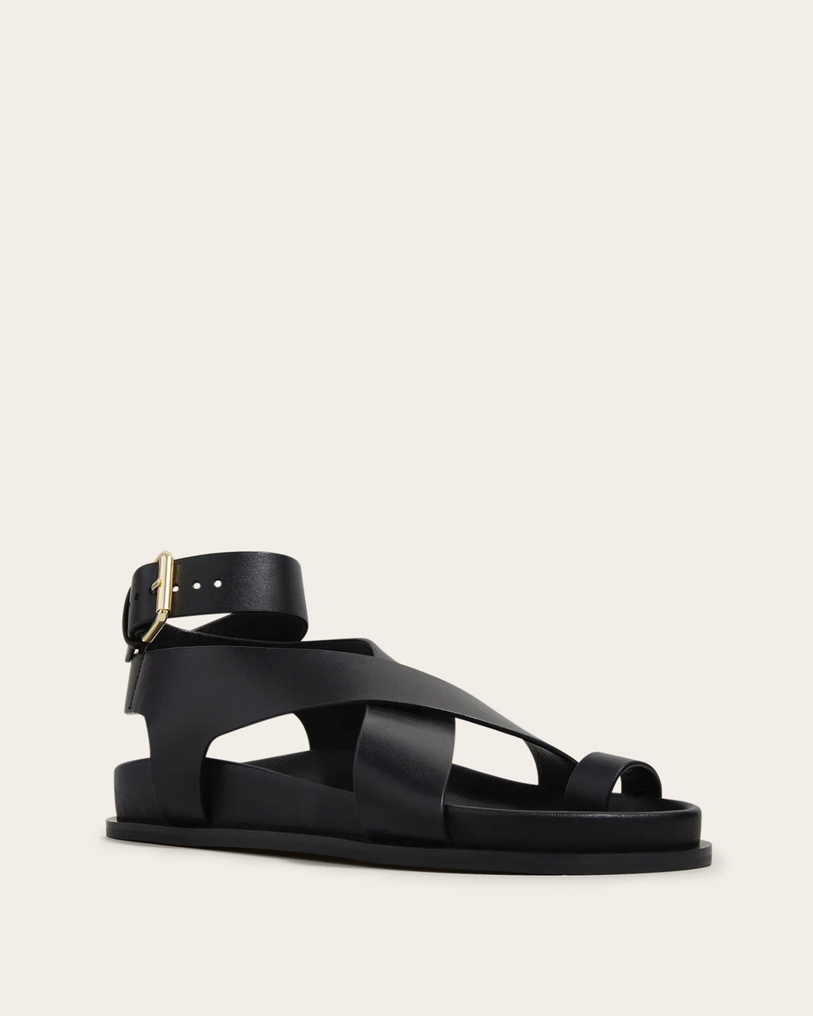 • The Jalen sandal sits atop the moulded footbed, featuring a toe hold and two criss-cross straps that encase the foot and finish with a soft gold buckle around the ankle. They are made from full grain leather with a leather upper, insole and rubber outsole.