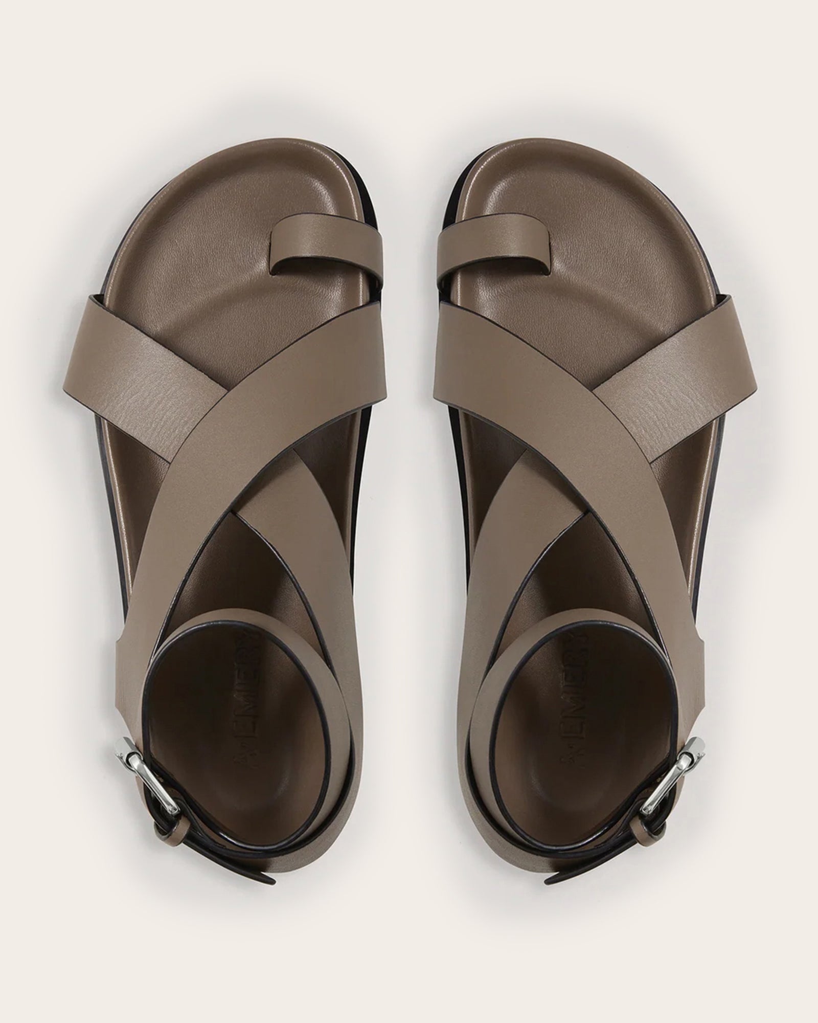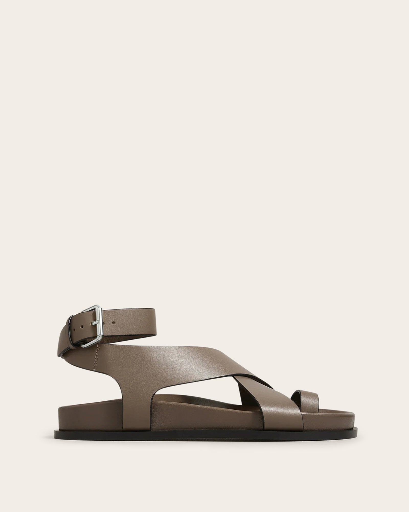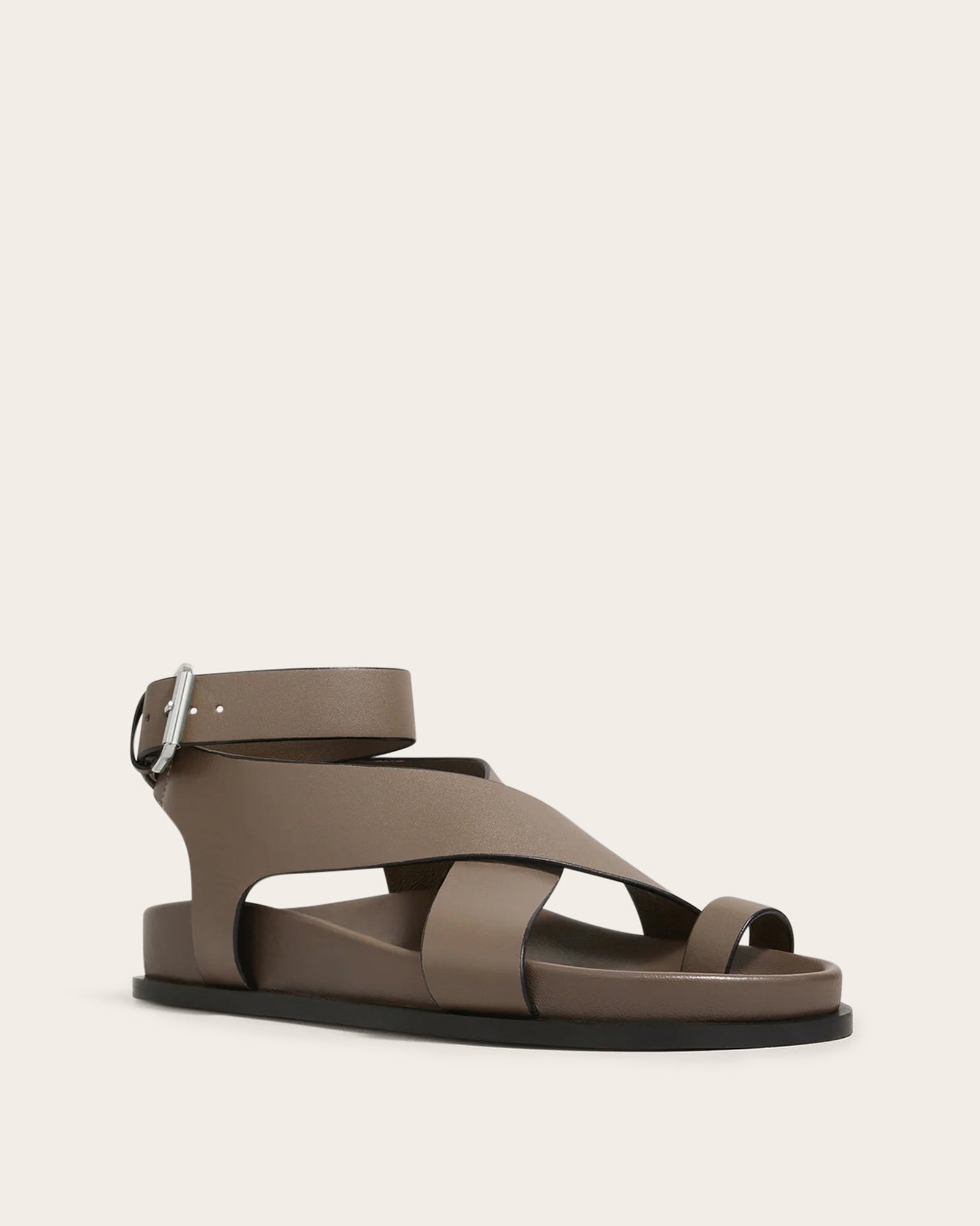 The Jalen sandal sits atop the moulded footbed, featuring a toe hold and two criss-cross straps that encase the foot and finish with a soft gold buckle around the ankle. They are made from full grain leather with a leather upper, insole and rubber outsole.