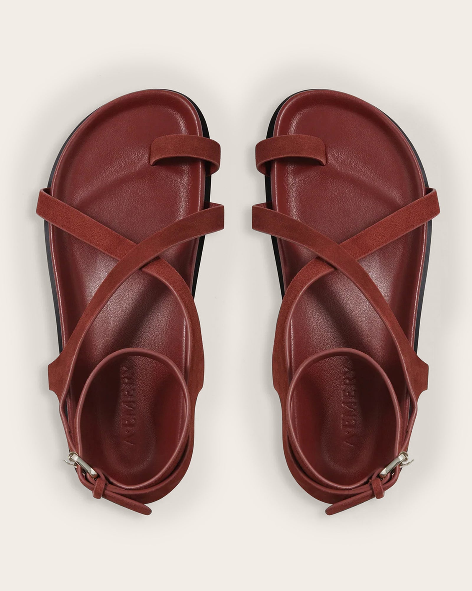 • The Jalen sandal sits atop the moulded footbed, featuring a toe hold and two criss-cross straps that encase the foot and finish with a soft gold buckle around the ankle. They are made from suede leather with a leather upper, insole and rubber outsole.