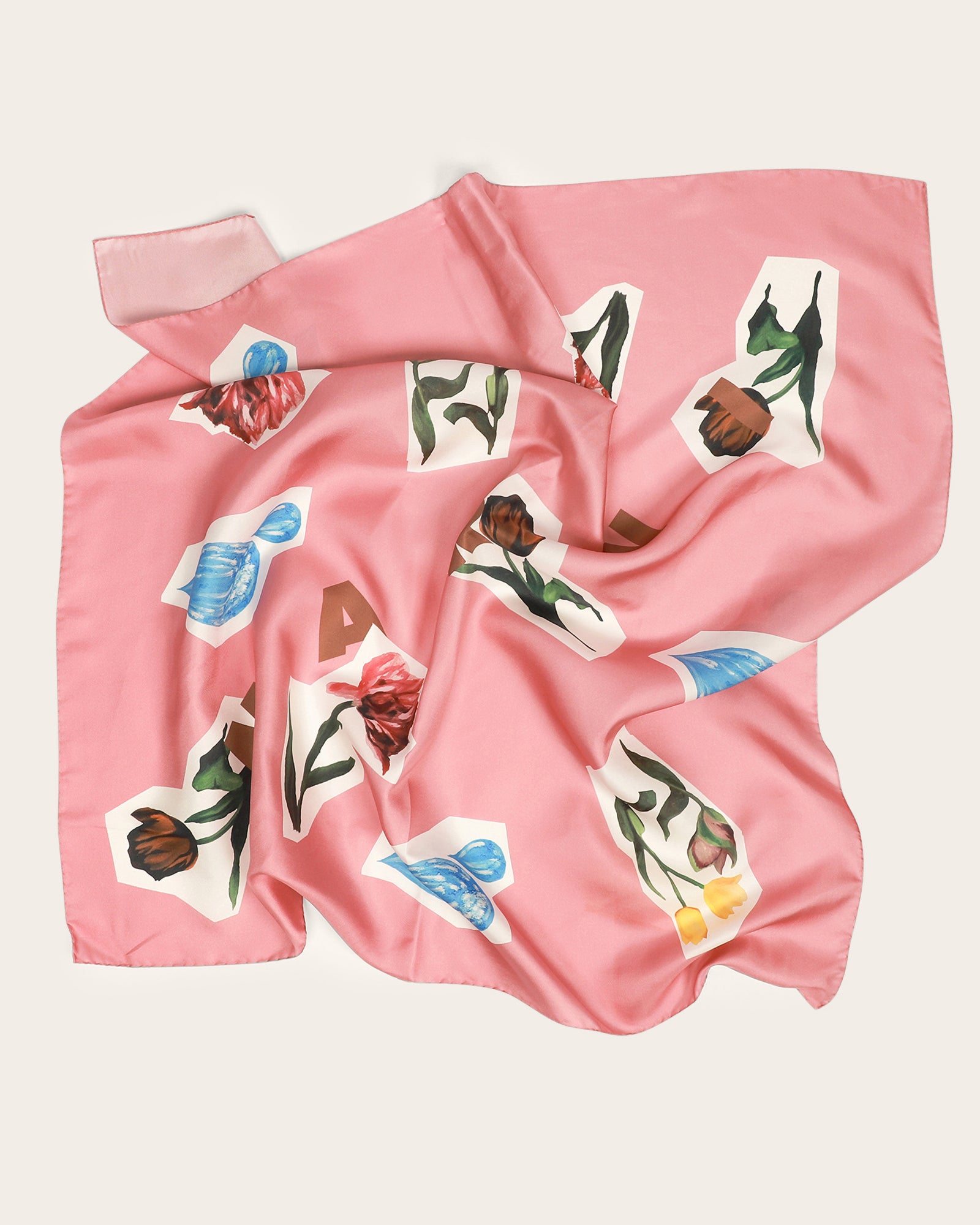 • 100% Silk logo print scarf. Collage flowers silk twill foulard. Made to be word your way and elevate every look.