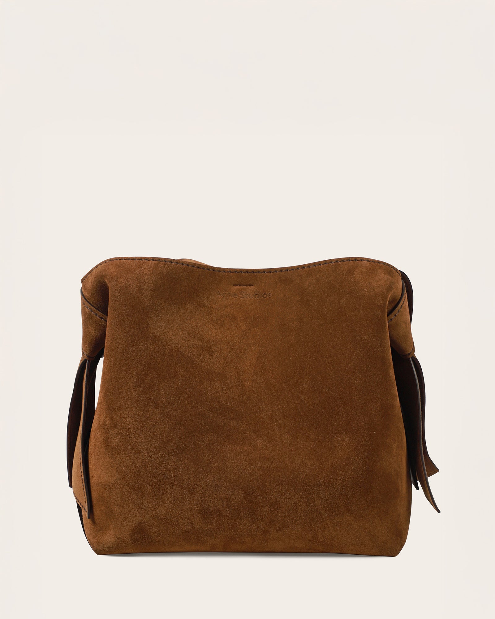 Musubi midi shoulder bag crafted from soft suede with contrast stitching, detailed with signature musubi knots on each side inspired by traditional Japanese obi sashes. Designed with a shoulder strap, it features an interior zip compartment with a branded lanyard, an embossed Acne Studios logo, and a secure snap button closure.