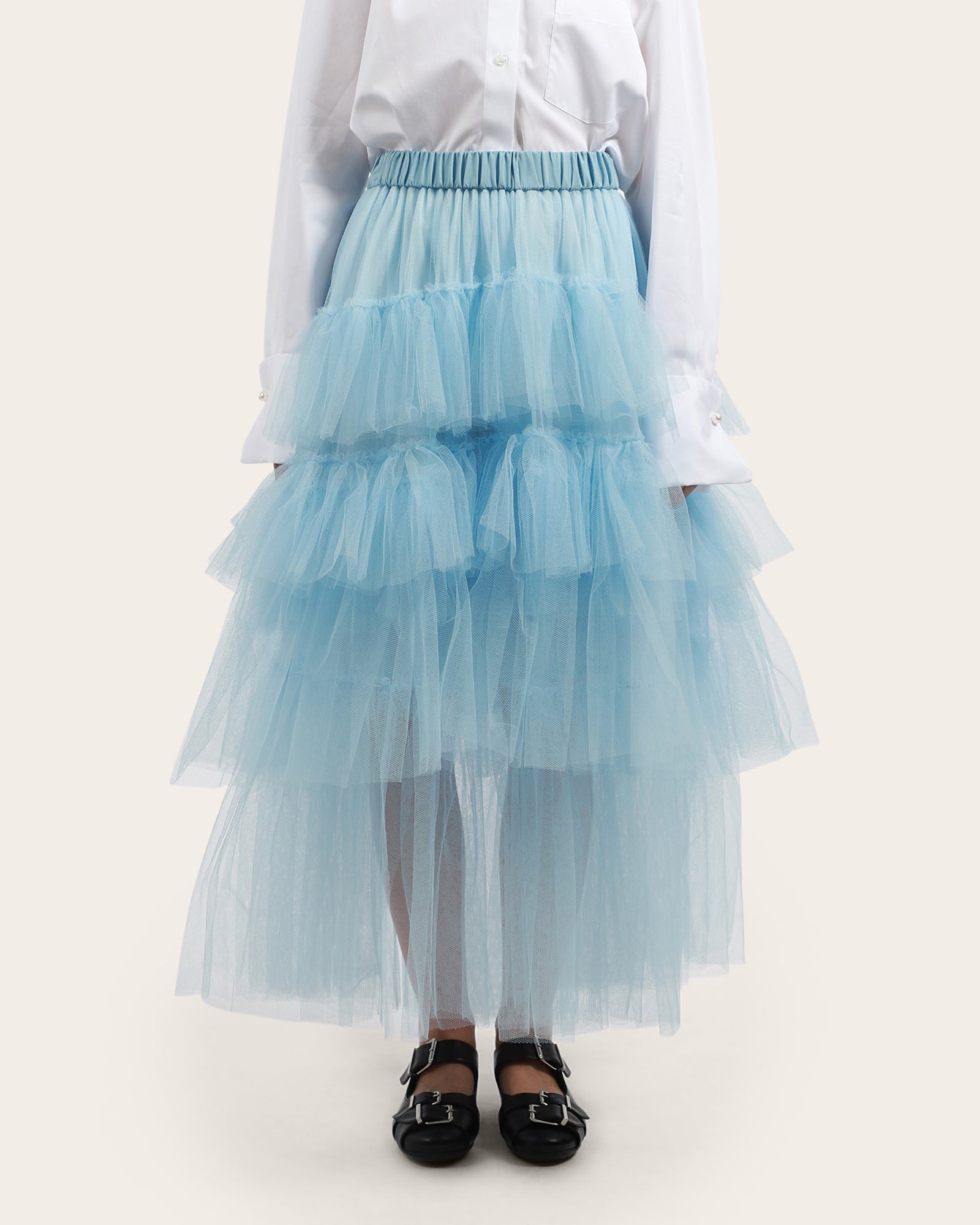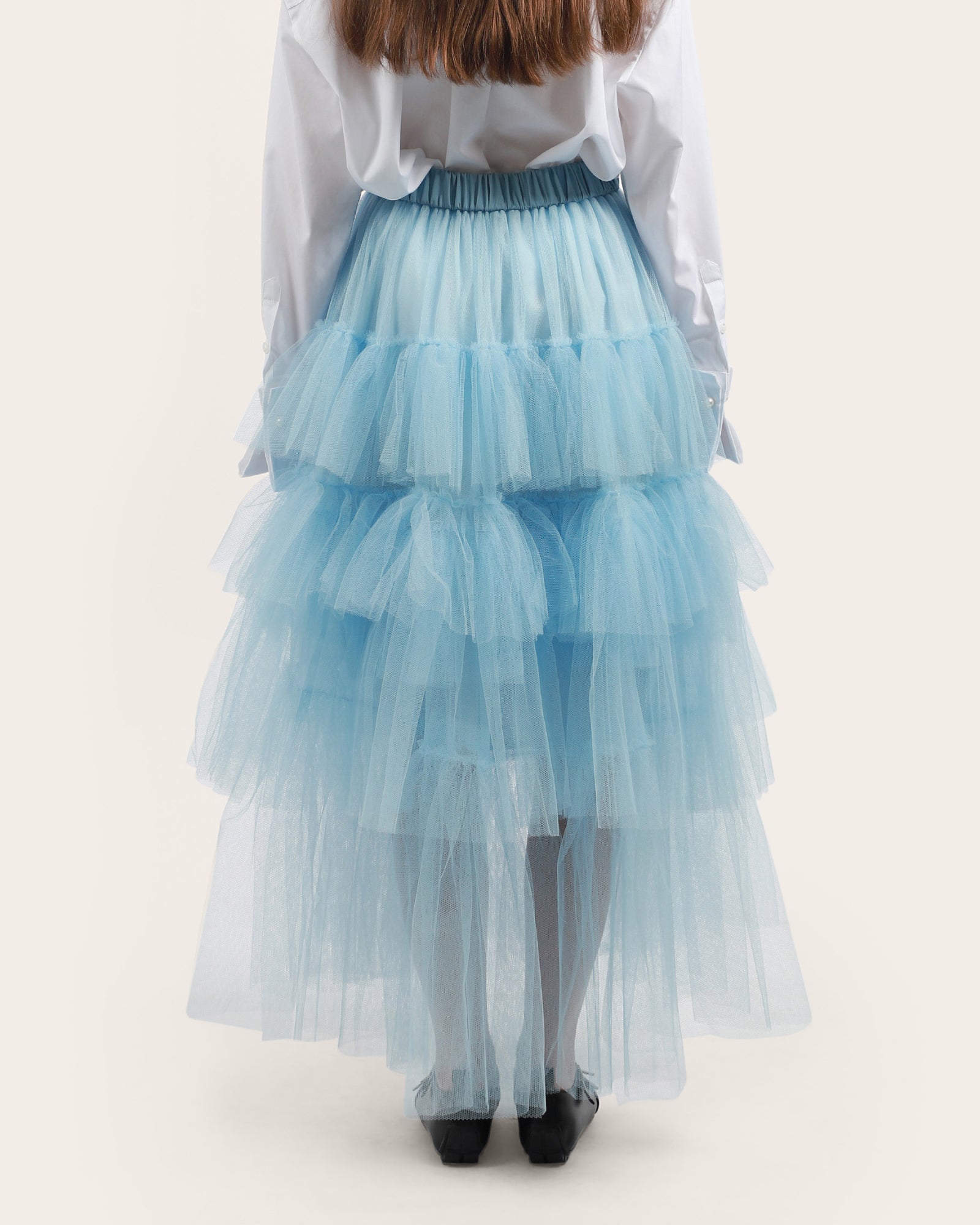 Dreamy and playful, this light blue tulle skirt is designed with cascading ruffled tiers for an ethereal, voluminous look. The elastic waistband ensures a comfortable fit, while the sheer layers add a whimsical touch. Perfect for dressing up any outfit.